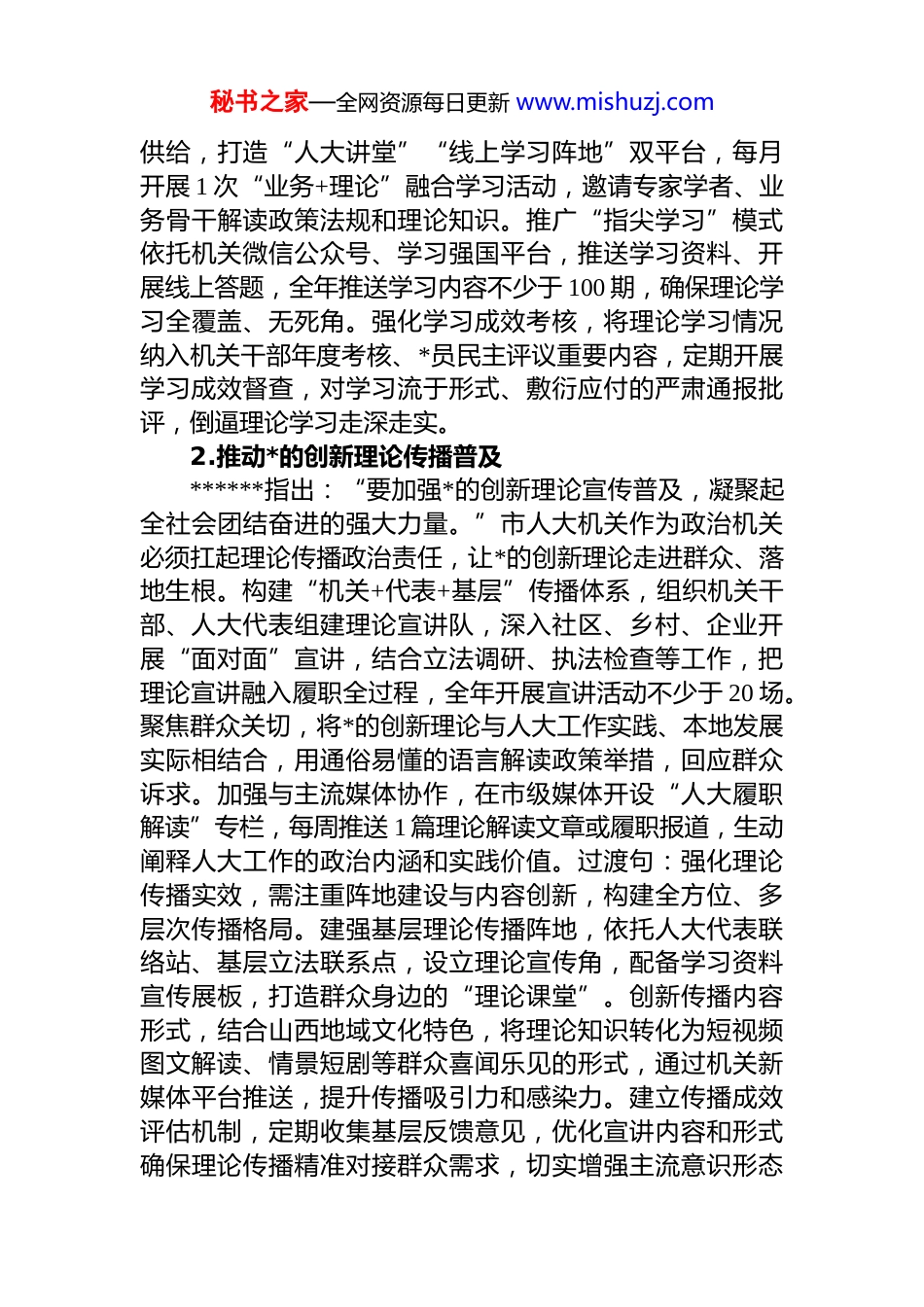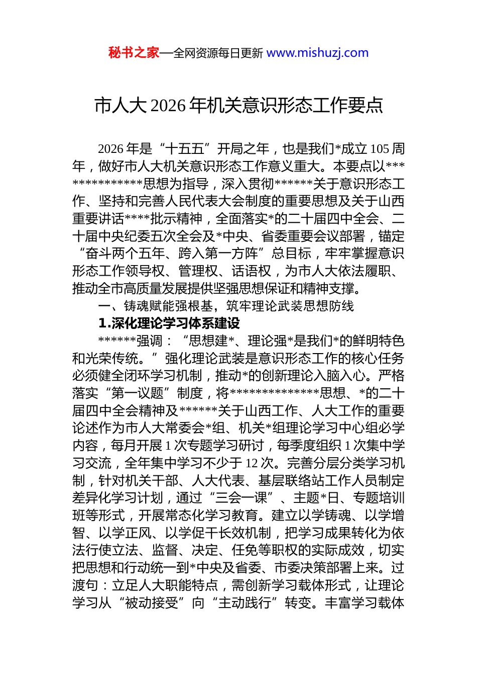 秘书之家—全网资源每日更新 www.mishuzj.com市人大 2026 年机关意识形态工作要点2026 年是“十五五”开局之年,也是我们*成立 105 周年,做好市人大机关意识形态工作意义重大。本要点以**************思想为指导,深入贯彻******关于意识形态工作、坚持和完善人民代表大会制度的重要思想及关于山西重要讲话****批示精神,全面落实*的二十届四中全会、二十届中央纪委五次全会及*中央、省委重要会议部署,锚定“奋斗两个五年、跨入第一方阵”总目标,牢牢掌握意识形态工作领导权、管理权、话语权,为市人大依法履职、推动全市高质量发展提供坚强思想保证和精神支撑。一、铸魂赋能强根基,筑牢理论武装思想防线1.深化理论学习体系建设******强调:“思想建*、理论强*是我们*的鲜明特色和光荣传统。”强化理论武装是意识形态工作的核心任务必须健全闭环学习机制,推动*的创新理论入脑入心。严格落实“第一议题”制度,将**************思想、*的二十届四中全会精神及******关于山西工作、人大工作的重要论述作为市人大常委会*组、机关*组理论学习中心组必学内容,每月开展 1 次专题学习研讨,每季度组织 1 次集中学习交流,全年集中学习不少于 12 次。完善分层分类学习机制,针对机关干部、人大代表、基层联络站工作人员制定差异化学习计划,通过“三会一课”、主题*日、专题培训班等形式,开展常态化学习教育。建立以学铸魂、以学增智、以学正风、以学促干长效机制,把学习成果转化为依法行使立法、监督、决定、任免等职权的实际成效,切实把思想和行动统一到*中央及省委、市委决策部署上来。过渡句:立足人大职能特点,需创新学习载体形式,让理论学习从“被动接受”向“主动践行”转变。丰富学习载体秘书之家—全网资源每日更新 www.mishuzj.com供给,打造“人大讲堂”“线上学习阵地”双平台,每月开展 1 次“业务+理论”融合学习活动,邀请专家学者、业务骨干解读政策法规和理论知识。推广“指尖学习”模式依托机关微信公众号、学习强国平台,推送学习资料、开展线上答题,全年推送学习内容不少于 100 期,确保理论学习全覆盖、无死角。强化学习成效考核,将理论学习情况纳入机关干部年度考核、*员民主评议重要内容,定期开展学习成效督查,对学习流于形式、敷衍应付的严肃通报批评,倒逼理论学习走深走实。2.推动*的创新理论传播普及******指出:“要加强*的创新理论宣传普及,凝聚起全社会团结奋进的强大力量。”市人大机关作为政治机关必须扛起理论传播政治责任,让*的创新理论走进群众、落地生根。构建“机关+代表+基层”传播体系,组织机关干部、人大代表组建理论宣讲队,深入社区、乡村、企业开展“面对面”宣讲,结合立法调研、执法检查等工作,把理论宣讲融入履职全过程,全年开展宣讲活动不少于 20 场。聚焦群众关切,将*的创新理论与人大工作实践、本地发展实际相结合,用通俗易懂的语言解读政策举措,回应群众诉求。加强与主流媒体协作,在市级媒体开设“人大履职解读”专栏,每周推送 1 篇理论解读文章或履职报道,生动阐释人大工作的政治内涵和实践价值。过渡句:强化理论传播实效,需注重阵地建设与内容创新,构建全方位、多层次传播格局。建强基层理论传播阵地,依托人大代表联络站、基层立法联系点,设立理论宣传角,配备学习资料宣传展板,打造群众身边的“理论课堂”。创新传播内容形式,结合山西地域文化特色,将理论知识转化为短视频图文解读、情景短剧等群众喜闻乐见的形式,通过机关新媒体平台推送,提升传播吸引力和感染力。建立传播成效评估机制,定期收集基层反馈意见,优化宣讲内容和形式确保理论传播精准对接群众需求,切实增强主流意识形态秘书之家—全网资源每日更新 www.mishuzj.com的引领力和凝聚力。3.强化理想信念教育引领******强调:“理想信念是共产*人的精神之‘钙’,没有理想信念,精神上就会‘缺钙’。”市人大机关要以理想信念教育为抓手,锤炼*员干部政治品格,筑牢忠诚担当思想根基。深入开展*史学习教育常态化长效化工作,结合建*105 周年,组织机关*员干部参观红色教育基地、重温入*誓词、观看红色影片,开...