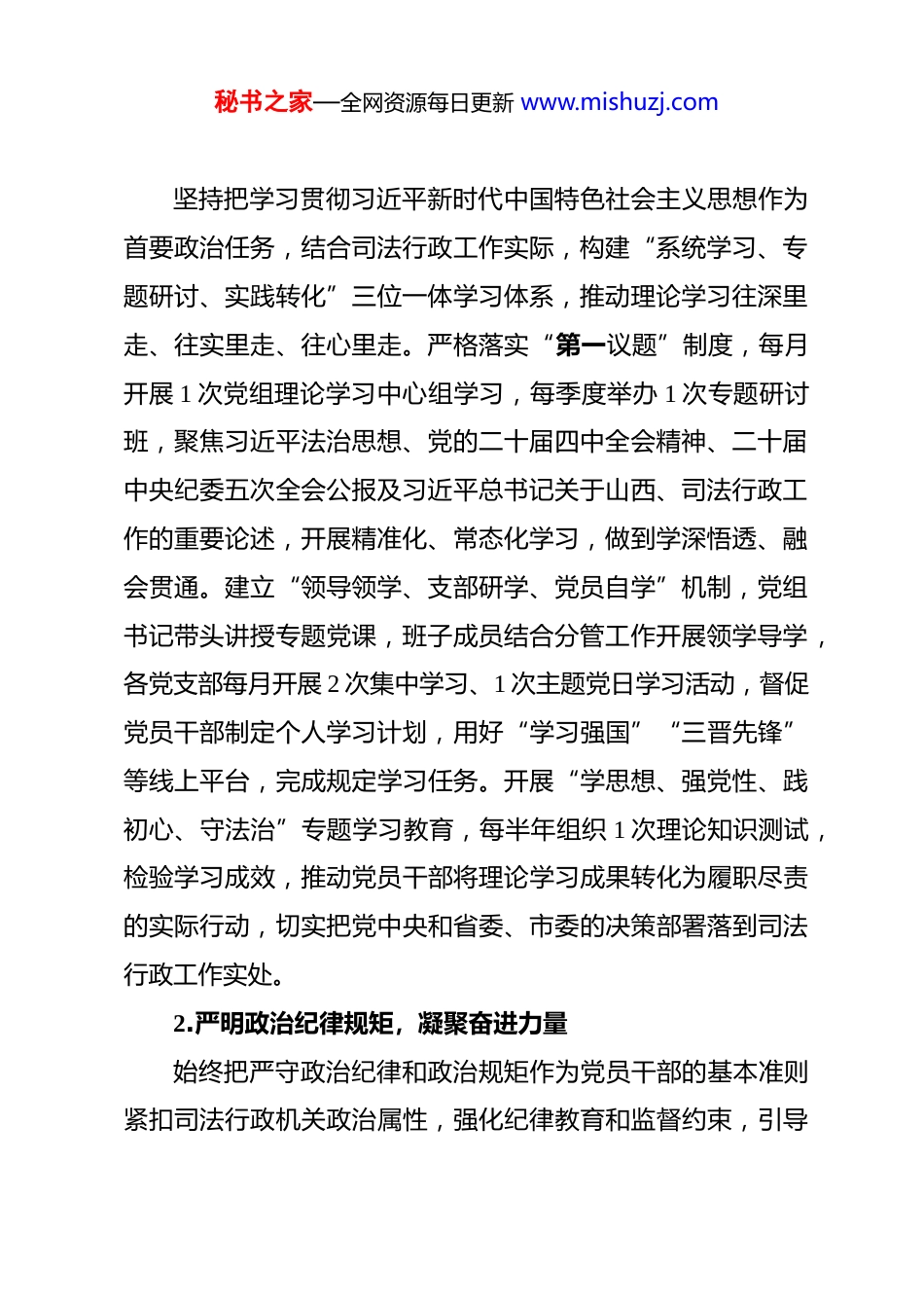 秘书之家—全网资源每日更新 www.mishuzj.com市司法局机关 2026 年党建工作要点 2026 年是“十五五”开局之年、中国共产党成立 105 周年,也是全市司法行政事业高质量发展的关键一年。市司法局机关党建工作以习近平新时代中国特色社会主义思想为指导,深入学习贯彻习近平总书记各类论述精神、关于山西重要讲话和重要指示批示精神、关于司法行政工作重要讲话和重要指示批示精神,全面落实党的二十届四中全会、二十届中央纪委五次全会及党中央、省委重要会议精神,锚定“党建引领法治强市”核心目标,紧扣司法行政“法治保障、法律服务、法治宣传、刑罚执行”主责主业,以党的政治建设为统领,全面推进思想、组织、作风、纪律、制度建设,推动党建与业务深度融合,锻造忠诚干净担当的司法行政铁军,为全市经济社会高质量发展提供坚强法治保障和组织支撑。一、铸牢政治忠诚之魂,强化党建引领法治发展政治方向坚持把党的政治建设摆在首位,深刻领悟“两个确立”的决定性意义,增强“四个意识”、坚定“四个自信”、做到“两个维护”,始终确保司法行政工作沿着正确政治方向前进,把政治引领贯穿司法行政工作各领域各环节。1.深化政治理论武装,筑牢思想根基秘书之家—全网资源每日更新 www.mishuzj.com坚持把学习贯彻习近平新时代中国特色社会主义思想作为首要政治任务,结合司法行政工作实际,构建“系统学习、专题研讨、实践转化”三位一体学习体系,推动理论学习往深里走、往实里走、往心里走。严格落实“第一议题”制度,每月开展 1 次党组理论学习中心组学习,每季度举办 1 次专题研讨班,聚焦习近平法治思想、党的二十届四中全会精神、二十届中央纪委五次全会公报及习近平总书记关于山西、司法行政工作的重要论述,开展精准化、常态化学习,做到学深悟透、融会贯通。建立“领导领学、支部研学、党员自学”机制,党组书记带头讲授专题党课,班子成员结合分管工作开展领学导学,各党支部每月开展 2 次集中学习、1 次主题党日学习活动,督促党员干部制定个人学习计划,用好“学习强国”“三晋先锋”等线上平台,完成规定学习任务。开展“学思想、强党性、践初心、守法治”专题学习教育,每半年组织 1 次理论知识测试,检验学习成效,推动党员干部将理论学习成果转化为履职尽责的实际行动,切实把党中央和省委、市委的决策部署落到司法行政工作实处。2.严明政治纪律规矩,凝聚奋进力量始终把严守政治纪律和政治规矩作为党员干部的基本准则紧扣司法行政机关政治属性,强化纪律教育和监督约束,引导秘书之家—全网资源每日更新 www.mishuzj.com全体党员干部知敬畏、存戒惧、守底线。常态化开展政治纪律和政治规矩教育,每季度组织 1 次纪律教育专题学习,聚焦二十届中央纪委五次全会提出的纪律要求,深入学习《中国共产党纪律处分条例》等党内法规,引导党员干部深刻认识政治纪律的重要性,坚决杜绝“七个有之”,做到“五个必须”。加强政治素质考察,将政治表现作为党员干部考核、评优评先、选拔任用的首要依据,健全完善政治素质考察机制,对党员干部政治表现进行常态化研判,及时发现和纠正苗头性、倾向性问题。严格执行重大事项请示报告制度,凡涉及司法行政重大工作部署、重要政策制定、重大案件办理、重要人事调整等事项,严格按照程序向市委、市委政法委请示报告,确保各项工作始终在党的领导下有序推进。强化政治执行力,引导党员干部坚决贯彻落实党中央和省委、市委关于司法行政工作的各项决策部署,不打折扣、不搞变通、不做选择,切实凝聚起推动司法行政事业高质量发展的强大政治力量,始终在思想上政治上行动上同以习近平同志为核心的党中央保持高度一致。3.提升政治能力建设,强化履职担当立足司法行政职能使命,聚焦新时代法治建设新要求,着力提升党员干部的政治判断力、政治领悟力、政治执行力,推动政治能力与业务能力同步提升。开展“政治能力提升专项行秘书之家—全网资源每日更新 www.mishuzj.com动”,每季度举办 1 次政治能力专题培训,围绕法治建设重大问题、司法行政重点工作,邀请专家学者、业务骨干授课,引导党员干部善于从政治上...