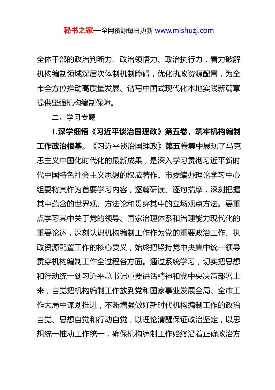 秘书之家—全网资源每日更新 www.mishuzj.com市委编办 2026 年理论学习中心组专题学习计划 2026 年是“十五五”规划开局之年,也是全面贯彻落实党的二十届四中全会精神的关键一年,做好理论学习中心组学习工作,对市委编办强化政治引领、提升履职效能、服务全市高质量发展大局具有重要意义。为深入学习贯彻习近平新时代中国特色社会主义思想,全面落实党中央、省委和市委关于理论学习的部署要求,切实把学习成果转化为推动机构编制工作高质量发展的强大动力,结合市委编办工作实际,制定本专题学习计划。一、指导思想以习近平新时代中国特色社会主义思想为指导,全面贯彻党的二十大和二十届历次全会精神,深入学习贯彻习近平总书记关于机构编制工作的重要论述、关于山西工作的重要讲话和重要指示批示精神,紧紧围绕党的二十届四中全会和二十届中央纪委五次全会部署要求,锚定“十五五”时期机构编制工作发展目标,坚持学思用贯通、知信行统一,把强化理论武装与履行机构编制核心职能紧密结合,以坚定拥护“两个确立”、坚决做到“两个维护”为根本政治要求,不断提升领导班子和秘书之家—全网资源每日更新 www.mishuzj.com全体干部的政治判断力、政治领悟力、政治执行力,着力破解机构编制领域深层次体制机制障碍,优化执政资源配置,为全市全方位推动高质量发展、谱写中国式现代化本地实践新篇章提供坚强机构编制保障。二、学习专题1.深学细悟《习近平谈治国理政》第五卷,筑牢机构编制工作政治根基。《习近平谈治国理政》第五卷集中展现了马克思主义中国化时代化的最新成果,是深入学习贯彻习近平新时代中国特色社会主义思想的权威著作。市委编办理论学习中心组要将其作为首要学习内容,逐篇研读、逐句揣摩,深刻把握其中蕴含的世界观、方法论和贯穿其中的立场观点方法。要重点学习其中关于党的领导、国家治理体系和治理能力现代化的重要论述,深刻认识机构编制工作作为党的重要政治工作、执政资源配置工作的核心要义,始终把坚持党中央集中统一领导贯穿机构编制工作全过程各方面。通过系统学习,切实把思想和行动统一到习近平总书记重要讲话精神和党中央决策部署上来,自觉把机构编制工作放到党和国家事业发展全局、全市工作大局中谋划推进,不断增强做好新时代机构编制工作的政治自觉、思想自觉和行动自觉,以理论清醒保证政治坚定,以思想统一推动工作统一,确保机构编制工作始终沿着正确政治方秘书之家—全网资源每日更新 www.mishuzj.com向前进。2.深入学习习近平总书记《在二十届中央机构编制委员会第一次会议上的讲话》,把握机构编制工作核心遵循。习近平总书记在二十届中央机构编制委员会第一次会议上的重要讲话,明确了新时代机构编制工作的指导原则、重点任务和实践要求,为做好机构编制工作提供了根本遵循。市委编办要把学习这篇重要讲话作为专题学习的核心内容,深刻领会讲话中提出的“八个必须”宝贵经验,准确把握新时代机构编制工作“三个着重把握”的核心要求,切实把讲话精神转化为推动工作的具体举措。要聚焦讲话强调的加强顶层设计和整体谋划、服务保障国家重大战略、树立基层导向、坚持科学规范从严管理等重点任务,结合本地机构编制工作实际,逐项梳理落实举措,着力解决制约机构职能优化协同高效的突出问题。通过深入学习,进一步强化机构编制工作的政治属性,始终坚持党对机构编制工作的集中统一领导,严格执行机构编制法律法规和政策规定,不断提升机构编制工作的权威性、科学性和严肃性,以高质量机构编制工作服务高质量发展。3.学习贯彻习近平总书记关于党的自我革命的重要思想,强化机构编制领域从严管理。习近平总书记关于党的自我革命的重要思想,是新时代推进全面从严治党的行动指南,对机构秘书之家—全网资源每日更新 www.mishuzj.com编制领域加强自身建设、规范权力运行具有重要指导意义。市委编办要深入学习《习近平关于党的自我革命的重要思想学习纲要》,深刻领会党的自我革命的重大意义、丰富内涵和实践要求,切实把自我革命精神融入机构编制工作各环节。要结合二十届中央纪委五次全会精神,聚焦机构编制领域廉政风险点,健全完善...
