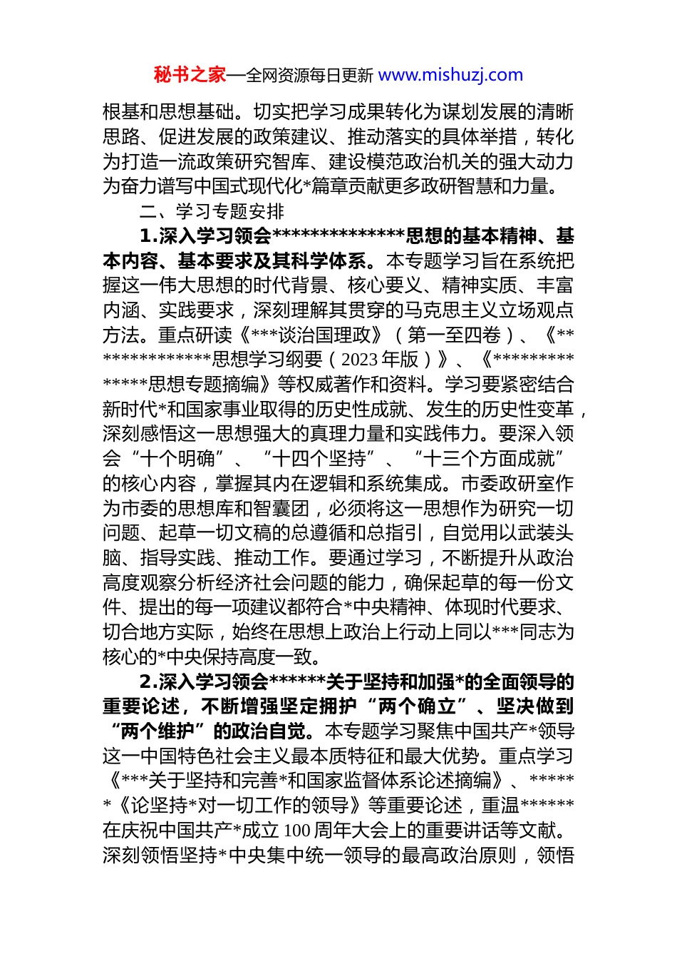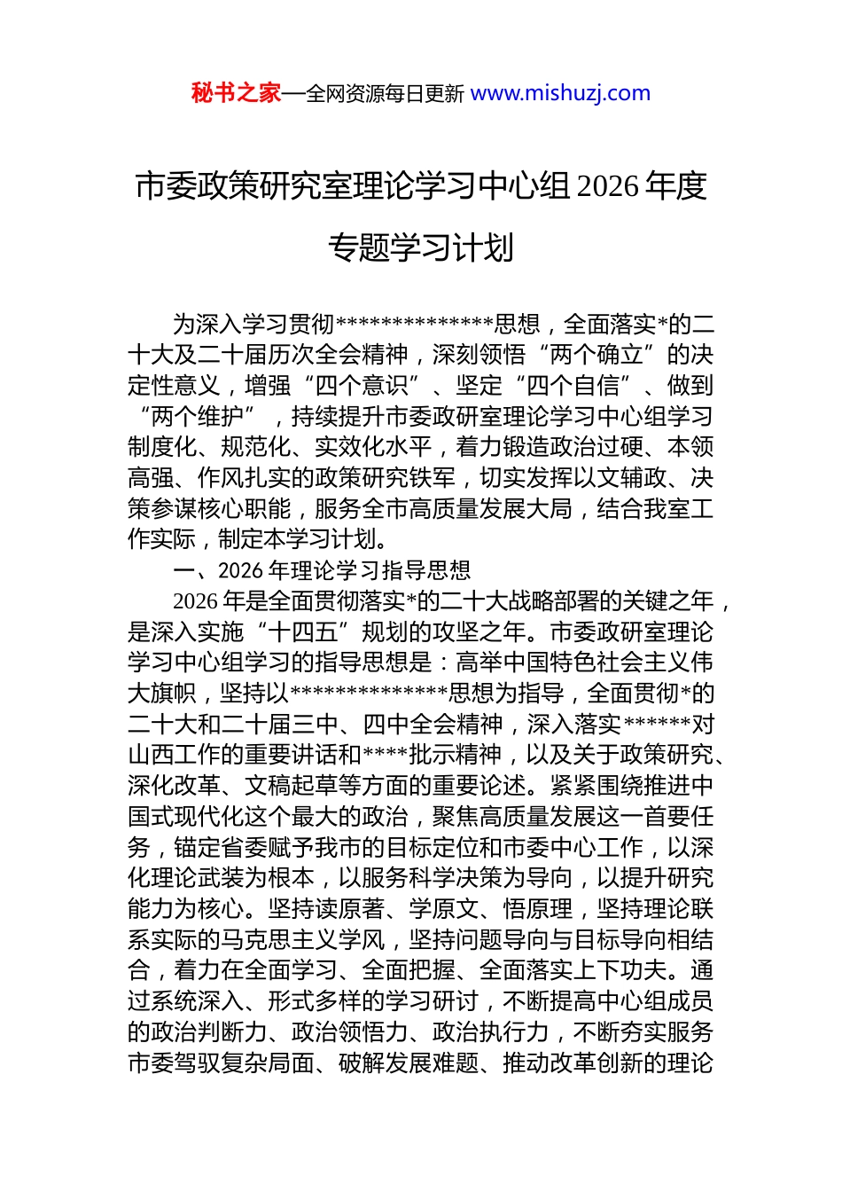 秘书之家—全网资源每日更新 www.mishuzj.com市委政策研究室理论学习中心组 2026 年度专题学习计划为深入学习贯彻**************思想,全面落实*的二十大及二十届历次全会精神,深刻领悟“两个确立”的决定性意义,增强“四个意识”、坚定“四个自信”、做到“两个维护”,持续提升市委政研室理论学习中心组学习制度化、规范化、实效化水平,着力锻造政治过硬、本领高强、作风扎实的政策研究铁军,切实发挥以文辅政、决策参谋核心职能,服务全市高质量发展大局,结合我室工作实际,制定本学习计划。一、2026 年理论学习指导思想2026 年是全面贯彻落实*的二十大战略部署的关键之年,是深入实施“十四五”规划的攻坚之年。市委政研室理论学习中心组学习的指导思想是:高举中国特色社会主义伟大旗帜,坚持以**************思想为指导,全面贯彻*的二十大和二十届三中、四中全会精神,深入落实******对山西工作的重要讲话和****批示精神,以及关于政策研究、深化改革、文稿起草等方面的重要论述。紧紧围绕推进中国式现代化这个最大的政治,聚焦高质量发展这一首要任务,锚定省委赋予我市的目标定位和市委中心工作,以深化理论武装为根本,以服务科学决策为导向,以提升研究能力为核心。坚持读原著、学原文、悟原理,坚持理论联系实际的马克思主义学风,坚持问题导向与目标导向相结合,着力在全面学习、全面把握、全面落实上下功夫。通过系统深入、形式多样的学习研讨,不断提高中心组成员的政治判断力、政治领悟力、政治执行力,不断夯实服务市委驾驭复杂局面、破解发展难题、推动改革创新的理论秘书之家—全网资源每日更新 www.mishuzj.com根基和思想基础。切实把学习成果转化为谋划发展的清晰思路、促进发展的政策建议、推动落实的具体举措,转化为打造一流政策研究智库、建设模范政治机关的强大动力为奋力谱写中国式现代化*篇章贡献更多政研智慧和力量。二、学习专题安排1.深入学习领会**************思想的基本精神、基本内容、基本要求及其科学体系。本专题学习旨在系统把握这一伟大思想的时代背景、核心要义、精神实质、丰富内涵、实践要求,深刻理解其贯穿的马克思主义立场观点方法。重点研读《***谈治国理政》(第一至四卷)、《**************思想学习纲要(2023 年版)》、《**************思想专题摘编》等权威著作和资料。学习要紧密结合新时代*和国家事业取得的历史性成就、发生的历史性变革,深刻感悟这一思想强大的真理力量和实践伟力。要深入领会“十个明确”、“十四个坚持”、“十三个方面成就”的核心内容,掌握其内在逻辑和系统集成。市委政研室作为市委的思想库和智囊团,必须将这一思想作为研究一切问题、起草一切文稿的总遵循和总指引,自觉用以武装头脑、指导实践、推动工作。要通过学习,不断提升从政治高度观察分析经济社会问题的能力,确保起草的每一份文件、提出的每一项建议都符合*中央精神、体现时代要求、切合地方实际,始终在思想上政治上行动上同以***同志为核心的*中央保持高度一致。2.深入学习领会******关于坚持和加强*的全面领导的重要论述,不断增强坚定拥护“两个确立”、坚决做到“两个维护”的政治自觉。本专题学习聚焦中国共产*领导这一中国特色社会主义最本质特征和最大优势。重点学习《***关于坚持和完善*和国家监督体系论述摘编》、******《论坚持*对一切工作的领导》等重要论述,重温******在庆祝中国共产*成立 100 周年大会上的重要讲话等文献。深刻领悟坚持*中央集中统一领导的最高政治原则,领悟秘书之家—全网资源每日更新 www.mishuzj.com“两个确立”的决定性意义,领悟*的领导制度在我国国家制度和国家治理体系中的统领地位。市委政研室的工作具有鲜明的政治属性,必须将坚持和加强*的全面领导贯穿于政策研究、改革谋划、文稿服务的全过程各方面。要通过学习,进一步强化政治机关意识,自觉把本职工作放在*和国家事业全局中、放在全市发展大局中去考量、去推动。要善于从领导重要讲话和指示批示中找准政研工作的切入点和着力点,确保市委的各项决策部署不折不扣落实到位确保起草的文稿、制定的政策建议有利于巩固*的执...