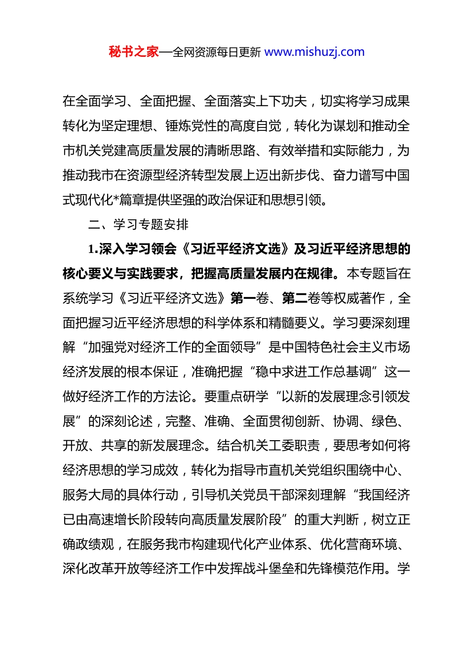 秘书之家—全网资源每日更新 www.mishuzj.com市委直属机关工作委员会理论学习中心组2026 年度专题学习计划 为深入贯彻落实党中央关于用党的创新理论武装全党、指导实践、推动工作的战略部署,持续巩固拓展主题教育成果,充分发挥市委直属机关工委理论学习中心组(以下简称“中心组”)在深化理论武装、加强政治建设上的“头雁效应”,带动全市机关党的建设和各项事业高质量发展,现结合工委职能定位与年度重点工作,制定 2026 年度专题学习计划如下。一、2026 年学习的指导思想2026 年,市委直属机关工委理论学习中心组学习的指导思想是:坚持以习近平新时代中国特色社会主义思想为根本遵循和行动指南,全面贯彻党的二十大及二十届三中、四中全会精神,深刻领悟“两个确立”的决定性意义,增强“四个意识”、坚定“四个自信”、做到“两个维护”。聚焦“十五五”时期开局起步的关键任务,紧密围绕习近平总书记关于党的建设的重要思想、关于党的自我革命的重要思想,特别是关于机关党建、关于山西工作的重要讲话和重要指示批示精神,以深化理论武装、提高政治能力、服务发展大局为主线。坚持读原著、学原文、悟原理,坚持理论联系实际的马克思主义学风,着力秘书之家—全网资源每日更新 www.mishuzj.com在全面学习、全面把握、全面落实上下功夫,切实将学习成果转化为坚定理想、锤炼党性的高度自觉,转化为谋划和推动全市机关党建高质量发展的清晰思路、有效举措和实际能力,为推动我市在资源型经济转型发展上迈出新步伐、奋力谱写中国式现代化*篇章提供坚强的政治保证和思想引领。二、学习专题安排1.深入学习领会《习近平经济文选》及习近平经济思想的核心要义与实践要求,把握高质量发展内在规律。本专题旨在系统学习《习近平经济文选》第一卷、第二卷等权威著作,全面把握习近平经济思想的科学体系和精髓要义。学习要深刻理解“加强党对经济工作的全面领导”是中国特色社会主义市场经济发展的根本保证,准确把握“稳中求进工作总基调”这一做好经济工作的方法论。要重点研学“以新的发展理念引领发展”的深刻论述,完整、准确、全面贯彻创新、协调、绿色、开放、共享的新发展理念。结合机关工委职责,要思考如何将经济思想的学习成效,转化为指导市直机关党组织围绕中心、服务大局的具体行动,引导机关党员干部深刻理解“我国经济已由高速增长阶段转向高质量发展阶段”的重大判断,树立正确政绩观,在服务我市构建现代化产业体系、优化营商环境、深化改革开放等经济工作中发挥战斗堡垒和先锋模范作用。学秘书之家—全网资源每日更新 www.mishuzj.com习需研读《习近平经济文选》中《人民对美好生活的向往,就是我们的奋斗目标》《把握使市场在资源配置中起决定性作用、更好发挥政府作用》《长期坚持、不断丰富发展新时代中国特色社会主义经济思想》等核心篇目。2.持续深化对习近平总书记关于党的建设的重要思想的学习贯彻,全面提升机关党建质量。本专题要求将习近平总书记关于党的建设的重要思想作为中心组学习的核心内容,并与学习《习近平著作选读》《论党的自我革命》等重要著作贯通起来。要深刻领会坚持和加强党的全面领导和党中央集中统一领导的极端重要性,准确把握新时代党的建设总要求和新时代党的组织路线。学习要聚焦机关党建的特殊性和关键作用,重温习近平总书记在中央和国家机关党的建设工作会议上的重要讲话精神,深入贯彻其就中央和国家机关学习贯彻党的二十届三中全会精神、推动机关党建高质量发展所作出的“当好排头兵”等重要指示。中心组要带头思考并回答如何将“四个带头”(带头做到“两个维护”、带头深化理论武装、带头夯实基层基础、带头正风肃纪反腐)的要求落到实处,如何以深化党的建设制度改革为契机,推动机关党建理念创新、机制创新、方法创新,切实解决机关党建“灯下黑”“两张皮”等问题,真正实现以高质量党建引领和保障高质量发展。秘书之家—全网资源每日更新 www.mishuzj.com3.深入学习贯彻习近平总书记关于党的自我革命的重要思想,持之以恒推进全面从严治党。本专题要系统学习《论党的自我革命》等重要文献,深刻领会习近平总...