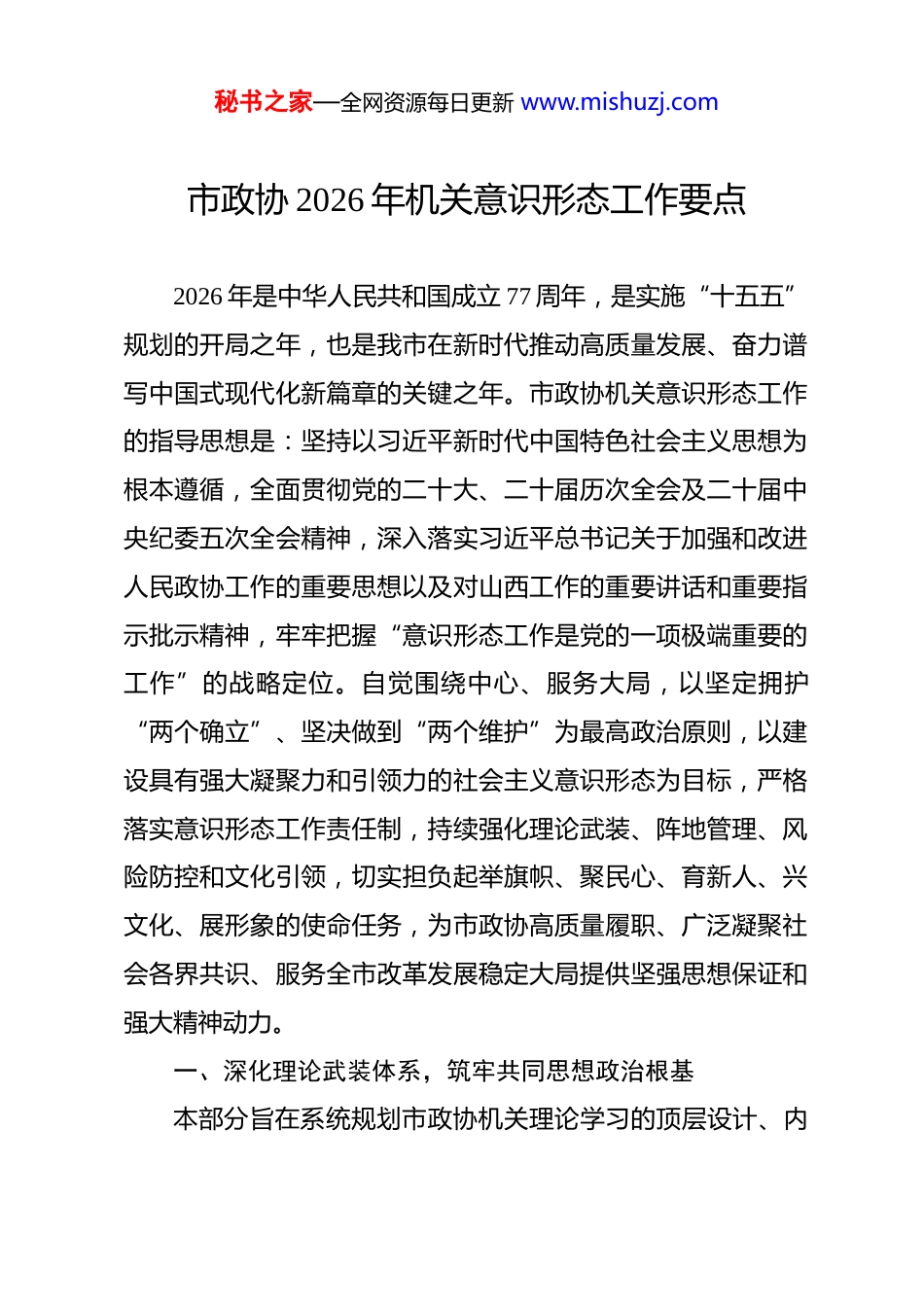 秘书之家—全网资源每日更新 www.mishuzj.com市政协 2026 年机关意识形态工作要点 2026 年是中华人民共和国成立 77 周年,是实施“十五五”规划的开局之年,也是我市在新时代推动高质量发展、奋力谱写中国式现代化新篇章的关键之年。市政协机关意识形态工作的指导思想是:坚持以习近平新时代中国特色社会主义思想为根本遵循,全面贯彻党的二十大、二十届历次全会及二十届中央纪委五次全会精神,深入落实习近平总书记关于加强和改进人民政协工作的重要思想以及对山西工作的重要讲话和重要指示批示精神,牢牢把握“意识形态工作是党的一项极端重要的工作”的战略定位。自觉围绕中心、服务大局,以坚定拥护“两个确立”、坚决做到“两个维护”为最高政治原则,以建设具有强大凝聚力和引领力的社会主义意识形态为目标,严格落实意识形态工作责任制,持续强化理论武装、阵地管理、风险防控和文化引领,切实担负起举旗帜、聚民心、育新人、兴文化、展形象的使命任务,为市政协高质量履职、广泛凝聚社会各界共识、服务全市改革发展稳定大局提供坚强思想保证和强大精神动力。一、深化理论武装体系,筑牢共同思想政治根基本部分旨在系统规划市政协机关理论学习的顶层设计、内秘书之家—全网资源每日更新 www.mishuzj.com容深化、成果转化与委员引领,将党的创新理论内化为机关干部和政协委员的政治认同、思想认同、理论认同、情感认同,巩固团结奋斗的共同思想基础。1.健全分层分类常态化学习机制。构建以市政协党组理论学习中心组为龙头,机关党组、各专委会分党组、机关各党支部和委员履职临时党组织协同推进的理论学习矩阵。制定并严格执行年度学习计划,明确学习主题、时间节点和责任主体。中心组成员须带头开展专题研讨、撰写理论文章、深入基层宣讲,发挥“关键少数”的领学促学作用。机关党委需细化各支部月度学习指引,将学习习近平新时代中国特色社会主义思想、习近平总书记关于意识形态工作的重要论述、党的二十届四中全会精神及中央、省委、市委最新决策部署作为“三会一课”、主题党日的核心内容。建立学习考勤、笔记调阅、效果评估制度,确保理论学习覆盖全体机关干部并融入日常。针对政协委员界别多、分布广的特点,依托委员履职平台,定期推送权威解读、学习资料包,并纳入委员年度述职和履职评价体系,引导委员将理论学习作为履职尽责的基本功。2.实施党的创新理论溯源深耕工程。推动理论学习从“知其然”向“知其所以然”深化。组织力量系统研究阐释习近平新时代中国特色社会主义思想的理论渊源、发展脉络与实践要秘书之家—全网资源每日更新 www.mishuzj.com求,重点围绕习近平文化思想、习近平总书记关于新时代意识形态工作的重要论述、习近平总书记关于坚持和完善人民代表大会制度的重要思想以及关于加强和改进人民政协工作的重要思想开展专题研学。邀请党校、高校专家学者举办系列深度讲座,解读“两个结合”的深刻内涵与时代意义。鼓励和支持机关青年理论学习小组、政协委员中的理论工作者,结合我市实际和政协履职实践,开展应用性、对策性理论研究,力争形成一批有深度、有见地的研究成果。设立“政协理论研究”专项,资助相关课题,促进学习成果向政策建议、制度规范和工作实践转化,切实用党的创新理论之“矢”去射政协履职和本市改革发展之“的”。3.创新“学用结合、知行合一”实践载体。坚决克服理论学习与实践脱节现象,设计贯穿全年的主题实践路线。开展“追随总书记足迹,感悟思想伟力”实地教学活动,组织机关干部和政协委员代表赴习近平总书记视察山西时到过的地方,以及市内红色文化遗址、转型发展标杆企业、乡村振兴示范村进行现场教学,在身临其境中深化理解。推行“调研式学习”模式,将重大协商议政课题的前期调研与理论专题学习绑定,带着理论问题深入基层,在实践中寻找答案、验证理论、创新思路。举办“学思践悟”分享会,让在理论学习、调查研究和秘书之家—全网资源每日更新 www.mishuzj.com建言献策中表现突出的机关干部和政协委员登台分享,用身边人、身边事展现理论指导实践的成效。建立理论学习成果转化清单,跟踪重要学习研讨形...