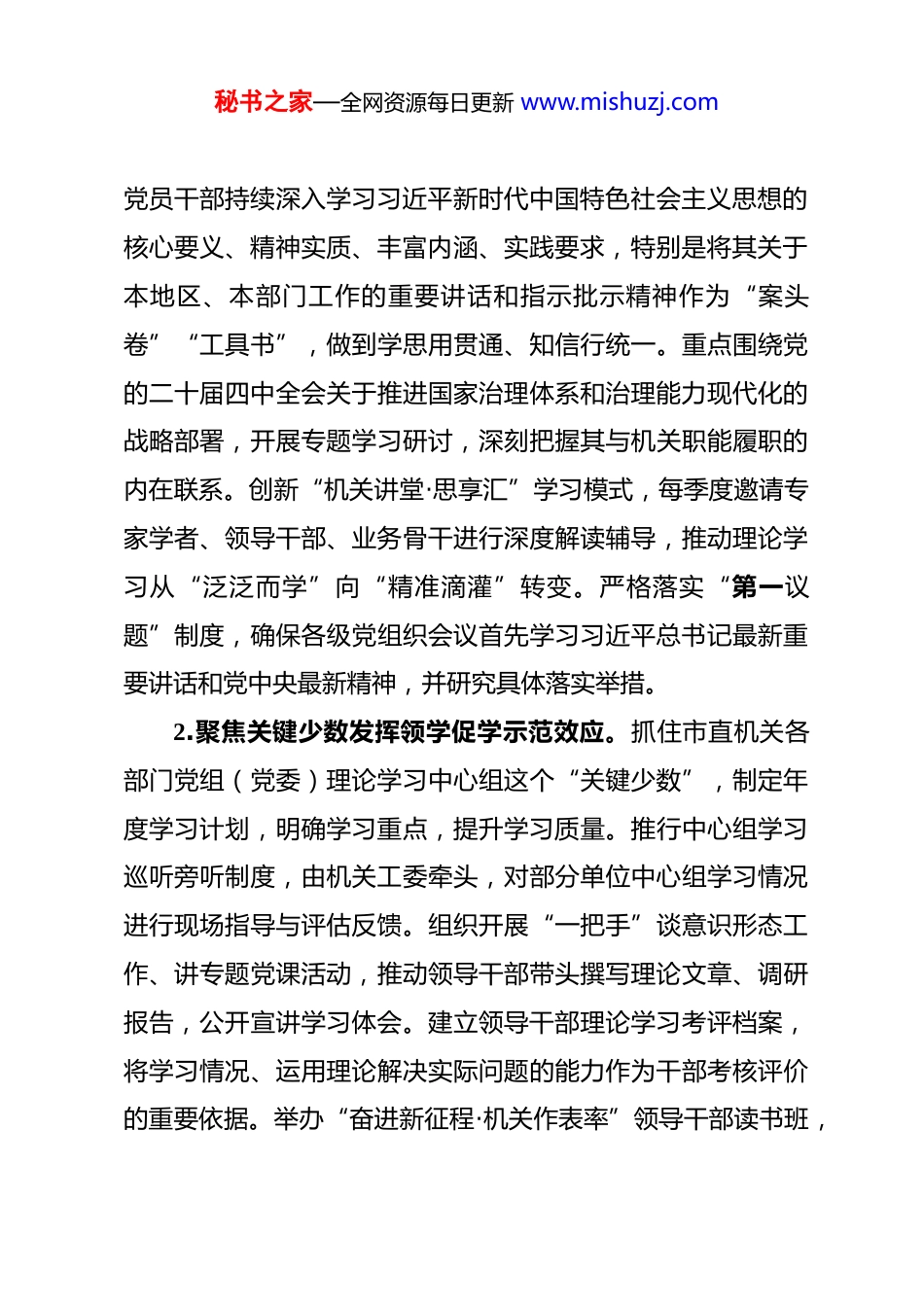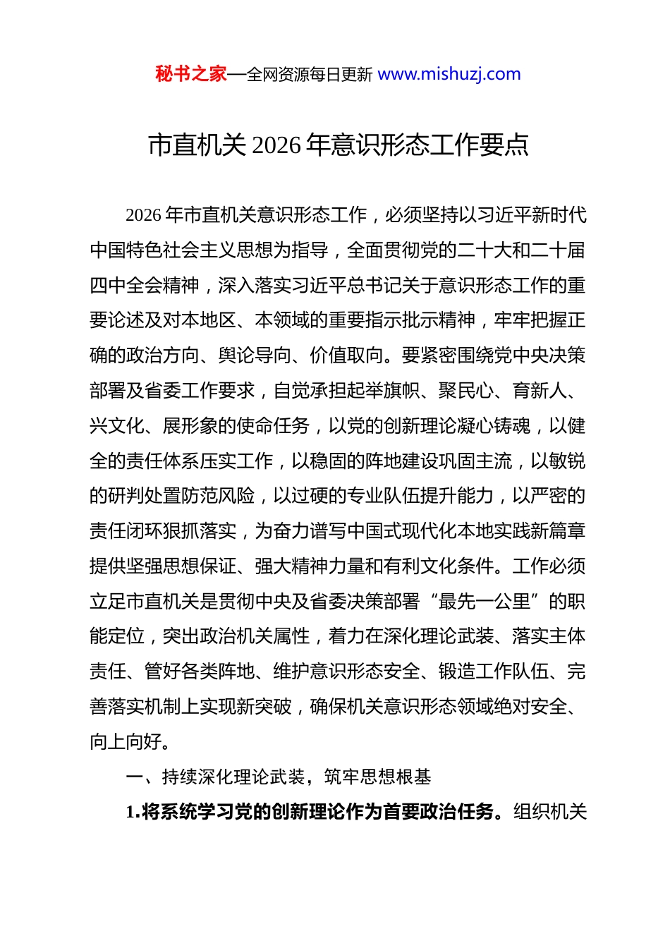 秘书之家—全网资源每日更新 www.mishuzj.com市直机关 2026 年意识形态工作要点 2026 年市直机关意识形态工作,必须坚持以习近平新时代中国特色社会主义思想为指导,全面贯彻党的二十大和二十届四中全会精神,深入落实习近平总书记关于意识形态工作的重要论述及对本地区、本领域的重要指示批示精神,牢牢把握正确的政治方向、舆论导向、价值取向。要紧密围绕党中央决策部署及省委工作要求,自觉承担起举旗帜、聚民心、育新人、兴文化、展形象的使命任务,以党的创新理论凝心铸魂,以健全的责任体系压实工作,以稳固的阵地建设巩固主流,以敏锐的研判处置防范风险,以过硬的专业队伍提升能力,以严密的责任闭环狠抓落实,为奋力谱写中国式现代化本地实践新篇章提供坚强思想保证、强大精神力量和有利文化条件。工作必须立足市直机关是贯彻中央及省委决策部署“最先一公里”的职能定位,突出政治机关属性,着力在深化理论武装、落实主体责任、管好各类阵地、维护意识形态安全、锻造工作队伍、完善落实机制上实现新突破,确保机关意识形态领域绝对安全、向上向好。一、持续深化理论武装,筑牢思想根基1.将系统学习党的创新理论作为首要政治任务。组织机关秘书之家—全网资源每日更新 www.mishuzj.com党员干部持续深入学习习近平新时代中国特色社会主义思想的核心要义、精神实质、丰富内涵、实践要求,特别是将其关于本地区、本部门工作的重要讲话和指示批示精神作为“案头卷”“工具书”,做到学思用贯通、知信行统一。重点围绕党的二十届四中全会关于推进国家治理体系和治理能力现代化的战略部署,开展专题学习研讨,深刻把握其与机关职能履职的内在联系。创新“机关讲堂·思享汇”学习模式,每季度邀请专家学者、领导干部、业务骨干进行深度解读辅导,推动理论学习从“泛泛而学”向“精准滴灌”转变。严格落实“第一议题”制度,确保各级党组织会议首先学习习近平总书记最新重要讲话和党中央最新精神,并研究具体落实举措。2.聚焦关键少数发挥领学促学示范效应。抓住市直机关各部门党组(党委)理论学习中心组这个“关键少数”,制定年度学习计划,明确学习重点,提升学习质量。推行中心组学习巡听旁听制度,由机关工委牵头,对部分单位中心组学习情况进行现场指导与评估反馈。组织开展“一把手”谈意识形态工作、讲专题党课活动,推动领导干部带头撰写理论文章、调研报告,公开宣讲学习体会。建立领导干部理论学习考评档案,将学习情况、运用理论解决实际问题的能力作为干部考核评价的重要依据。举办“奋进新征程·机关作表率”领导干部读书班,秘书之家—全网资源每日更新 www.mishuzj.com围绕重大理论和现实问题进行封闭式学习研讨。3.拓展青年干部理论武装的深度与广度。针对机关青年干部思维活跃、可塑性强的特点,实施“青年理论提升工程”。组建跨部门、跨领域的“青年理论学习研习组”,定期举办“青言青语”理论沙龙、经典著作读书会、时政热点辩论赛等活动。开展“根在基层·心向党旗”青年干部主题调研实践,鼓励青年干部结合理论学习,深入基层一线了解市情民意,形成高质量调研成果。利用线上平台开设“青年大学习·机关篇”专栏,推送微党课、短视频、图解文章等符合青年特点的学习产品。评选表彰“机关青年学习标兵”,激发青年干部理论学习的主动性和创造性。4.推动理论学习成果向实践效能转化。坚决克服学用脱节问题,大力弘扬理论联系实际的马克思主义学风。围绕贯彻落实习近平总书记重要指示批示精神和党中央、省委重大决策部署,组织机关党员干部深入开展“学思想、强党性、重实践、建新功”岗位建功行动。建立理论学习成果转化清单制度,要求各部门定期梳理将学习成果转化为政策举措、工作部署、制度机制的具体案例和成效。开展“我为高质量发展献一策”活动,引导党员干部运用党的创新理论分析解决制约本部门、本领域发展的突出矛盾和问题。将理论学习和实践锻炼紧密结合,秘书之家—全网资源每日更新 www.mishuzj.com在重大项目、重点工程、重要改革一线检验和提升党员干部运用理论指导实践的能力。二、压紧压实主体责任,健全工作体系5.完善意识形态...