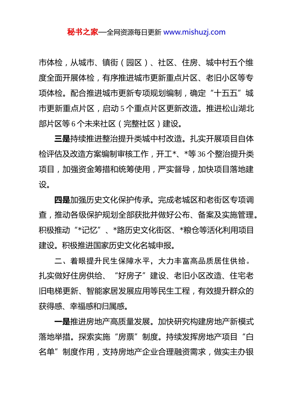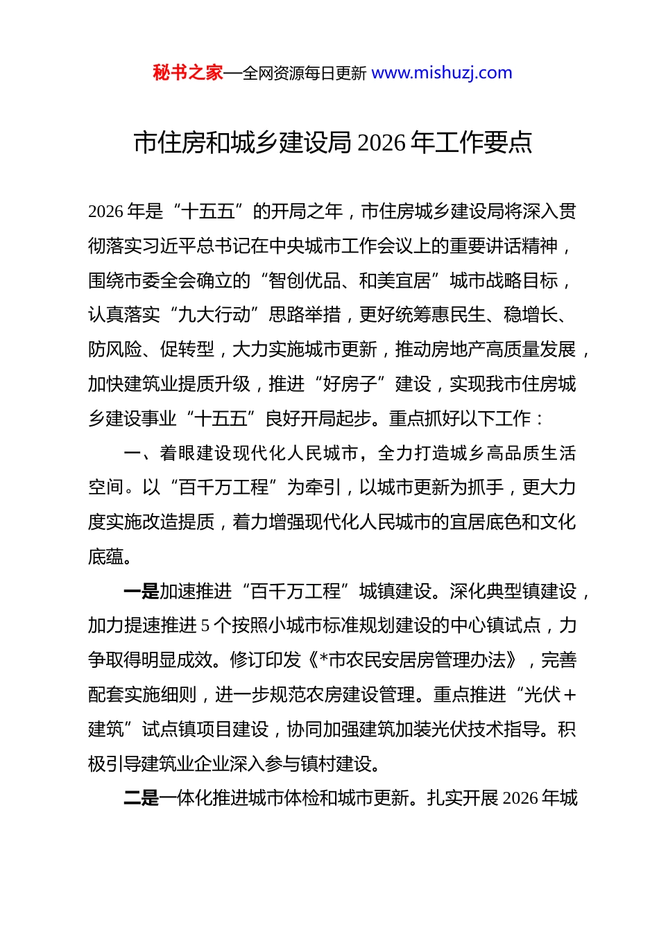 秘书之家—全网资源每日更新 www.mishuzj.com市住房和城乡建设局 2026 年工作要点 2026 年是“十五五”的开局之年,市住房城乡建设局将深入贯彻落实习近平总书记在中央城市工作会议上的重要讲话精神,围绕市委全会确立的“智创优品、和美宜居”城市战略目标,认真落实“九大行动”思路举措,更好统筹惠民生、稳增长、防风险、促转型,大力实施城市更新,推动房地产高质量发展,加快建筑业提质升级,推进“好房子”建设,实现我市住房城乡建设事业“十五五”良好开局起步。重点抓好以下工作:一、着眼建设现代化人民城市,全力打造城乡高品质生活空间。以“百千万工程”为牵引,以城市更新为抓手,更大力度实施改造提质,着力增强现代化人民城市的宜居底色和文化底蕴。一是加速推进“百千万工程”城镇建设。深化典型镇建设,加力提速推进 5 个按照小城市标准规划建设的中心镇试点,力争取得明显成效。修订印发《*市农民安居房管理办法》,完善配套实施细则,进一步规范农房建设管理。重点推进“光伏+建筑”试点镇项目建设,协同加强建筑加装光伏技术指导。积极引导建筑业企业深入参与镇村建设。二是一体化推进城市体检和城市更新。扎实开展 2026 年城秘书之家—全网资源每日更新 www.mishuzj.com市体检,从城市、镇街(园区)、社区、住房、城中村五个维度全面开展体检,有序推进城市更新重点片区、老旧小区等专项体检。配合推进城市更新专项规划编制,确定“十五五”城市更新重点片区,启动 5 个重点片区更新改造。推进松山湖北部片区等 6 个未来社区(完整社区)建设。三是持续推进整治提升类城中村改造。扎实开展项目自体检评估及改造方案编制审核工作,开工*、*等 36 个整治提升类项目,加强资金筹措和统筹使用,严实督导,加快项目落地建设。四是加强历史文化保护传承。完成老城区和老街区专项调查,推动各级保护规划全部获批并做好公布、备案及实施管理。积极推动“*记忆”、*路历史文化街区、*粮仓等活化利用项目建设。积极推进国家历史文化名城申报。二、着眼提升民生保障水平,大力丰富高品质居住供给。扎实做好住房供给、“好房子”建设、老旧小区改造、住宅老旧电梯更新、智能家居发展应用等民生工程,有效提升群众的获得感、幸福感和归属感。一是推进房地产高质量发展。加快研究构建房地产新模式落地举措。探索实施“房票”制度。持续发挥房地产项目“白名单”制度作用,支持房地产企业合理融资需求,做实主办银秘书之家—全网资源每日更新 www.mishuzj.com行制,支持贷款银行与监管银行保持一致,规范预售资金监管,切实维护购房人合法权益。出台《*市“十五五”住房发展规划》,健全多主体供给、多渠道保障、租购并举的住房制度,积极推动国企盘活改造和收购存量商品房、三限房作为人才房和保障性住房,筹集建设保障性住房 3500 套。二是积极打造更多“好房子”。大力提升住房品质,严格落实《住宅项目规范》,开展“好房子”设计竞赛,探索实施“好房子”评价,研究制定将保障性住房率先打造成“好房子”的具体举措。加快健全房屋全生命周期安全管理制度,支持莞城、茶山落实房屋安全管理体检、保险和资金三项制度试点,逐步拓宽房屋体检范围。实施物业服务质量提升行动,全面推进“莞香家园”住宅小区建设,完善党建引领下的居委会、业委会、物业服务企业协调运行机制,鼓励物业服务企业向养老、托幼、家政、文化、健康等领域延伸,探索“物业服务+生活服务”模式,推动“物业服务进家庭”。三是推动老旧小区整治改造及电梯更新。“点、线、面”相结合,按照“实施一批、申报一批、储备一批、谋划一批”的滚动管理机制,计划改造不少于 100 个老旧小区,落实 3333台住宅老旧电梯更新,组织老旧小区加装电梯申报超长期特别国债支持。探索片区自主更新改造城镇老旧住宅。秘书之家—全网资源每日更新 www.mishuzj.com四是积极推动智能家居发展应用。鼓励家具、家电、房地产等多领域企业组建联合体,研发模块化、标准化集成方案,促进跨界融合创新。推动智能家居与新型建筑工业化协同发展,探索研究出台房屋建筑全屋智能系统设计配置导则,在滨...
