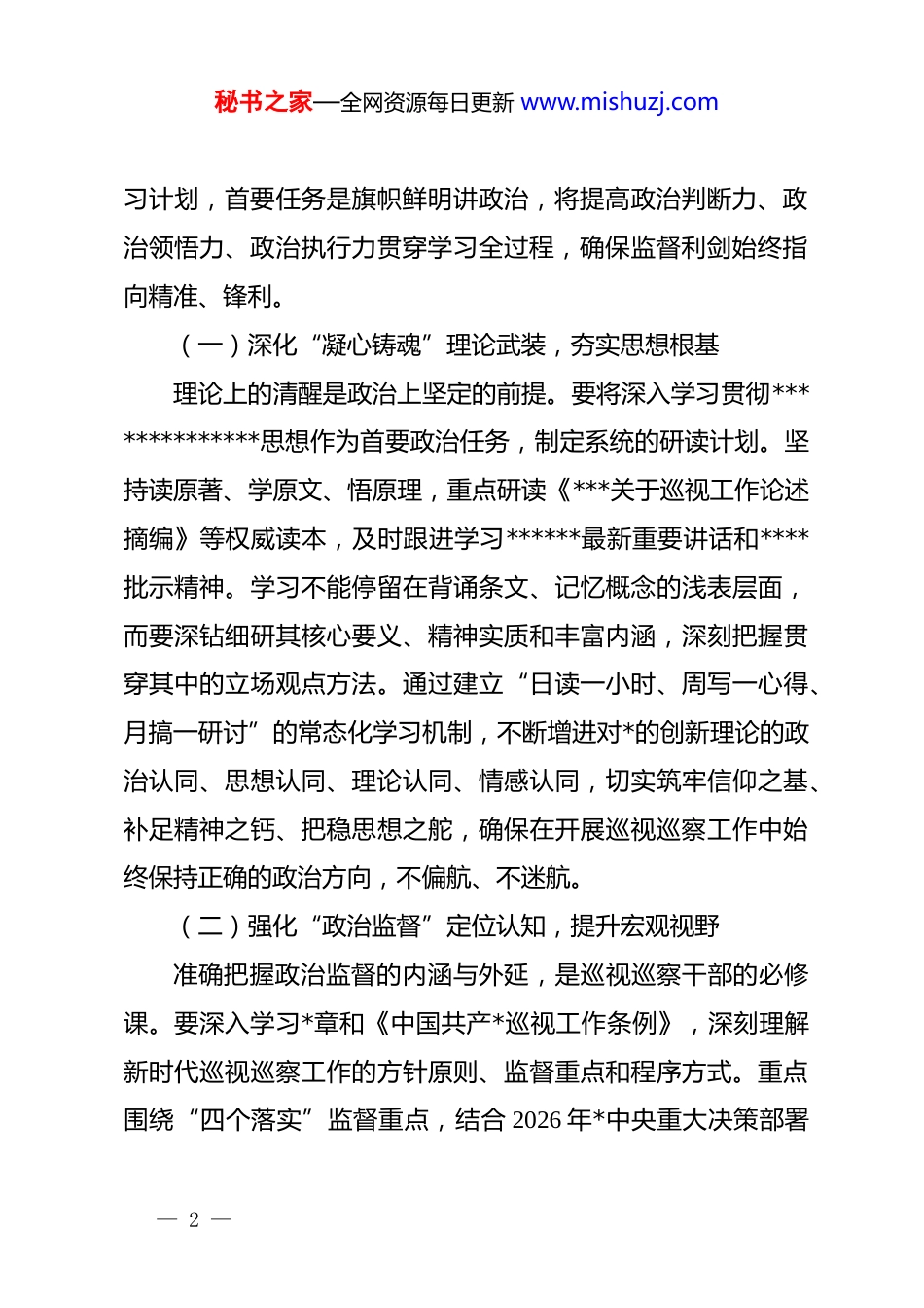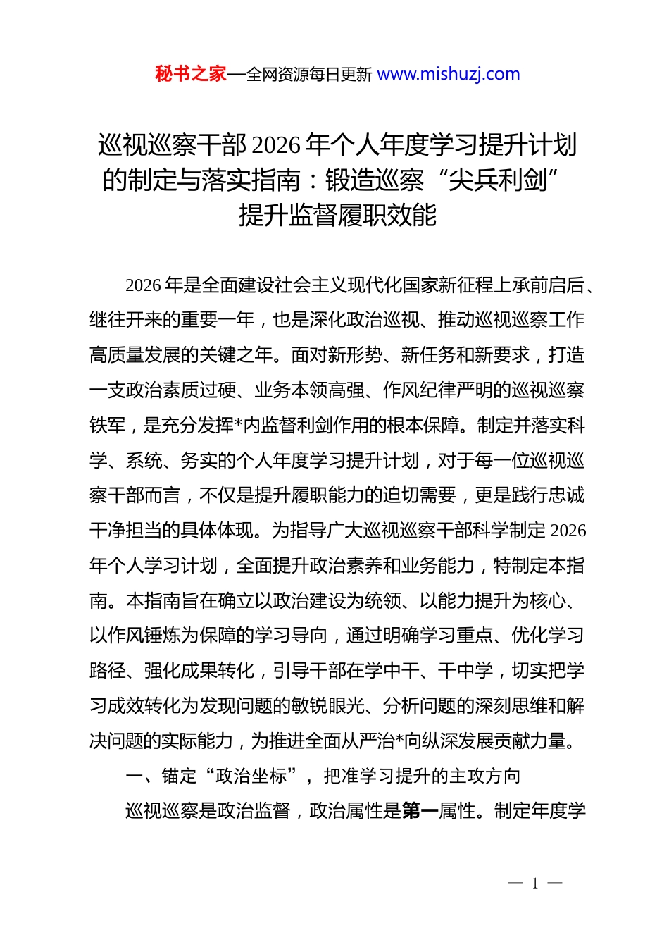 秘书之家—全网资源每日更新 www.mishuzj.com巡视巡察干部 2026 年个人年度学习提升计划的制定与落实指南:锻造巡察“尖兵利剑”提升监督履职效能2026 年是全面建设社会主义现代化国家新征程上承前启后、继往开来的重要一年,也是深化政治巡视、推动巡视巡察工作高质量发展的关键之年。面对新形势、新任务和新要求,打造一支政治素质过硬、业务本领高强、作风纪律严明的巡视巡察铁军,是充分发挥*内监督利剑作用的根本保障。制定并落实科学、系统、务实的个人年度学习提升计划,对于每一位巡视巡察干部而言,不仅是提升履职能力的迫切需要,更是践行忠诚干净担当的具体体现。为指导广大巡视巡察干部科学制定 2026年个人学习计划,全面提升政治素养和业务能力,特制定本指南。本指南旨在确立以政治建设为统领、以能力提升为核心、以作风锤炼为保障的学习导向,通过明确学习重点、优化学习路径、强化成果转化,引导干部在学中干、干中学,切实把学习成效转化为发现问题的敏锐眼光、分析问题的深刻思维和解决问题的实际能力,为推进全面从严治*向纵深发展贡献力量。一、锚定“政治坐标”,把准学习提升的主攻方向巡视巡察是政治监督,政治属性是第一属性。制定年度学— 1 —秘书之家—全网资源每日更新 www.mishuzj.com习计划,首要任务是旗帜鲜明讲政治,将提高政治判断力、政治领悟力、政治执行力贯穿学习全过程,确保监督利剑始终指向精准、锋利。(一)深化“凝心铸魂”理论武装,夯实思想根基理论上的清醒是政治上坚定的前提。要将深入学习贯彻**************思想作为首要政治任务,制定系统的研读计划。坚持读原著、学原文、悟原理,重点研读《***关于巡视工作论述摘编》等权威读本,及时跟进学习******最新重要讲话和****批示精神。学习不能停留在背诵条文、记忆概念的浅表层面,而要深钻细研其核心要义、精神实质和丰富内涵,深刻把握贯穿其中的立场观点方法。通过建立“日读一小时、周写一心得、月搞一研讨”的常态化学习机制,不断增进对*的创新理论的政治认同、思想认同、理论认同、情感认同,切实筑牢信仰之基、补足精神之钙、把稳思想之舵,确保在开展巡视巡察工作中始终保持正确的政治方向,不偏航、不迷航。(二)强化“政治监督”定位认知,提升宏观视野准确把握政治监督的内涵与外延,是巡视巡察干部的必修课。要深入学习*章和《中国共产*巡视工作条例》,深刻理解新时代巡视巡察工作的方针原则、监督重点和程序方式。重点围绕“四个落实”监督重点,结合 2026 年*中央重大决策部署— 2 —秘书之家—全网资源每日更新 www.mishuzj.com和上级*委工作要求,开展专题化学习。既要关注宏观政策的“天线”,又要接通基层落实的“地气”,学会从政治高度审视被巡视巡察单位的职能责任,善于从业务问题中透视政治偏差,从具体现象中剖析政治责任。要主动学习宏观经济政策、区域发展战略等知识,把监督工作置于*和国家发展大局中去考量,防止把政治巡视矮化为一般的业务检查或财务审计,确保监督工作始终围绕中心、服务大局。(三)筑牢“绝对忠诚”忠诚品格,增强使命担当忠诚是巡视巡察干部的政治灵魂。要将*史、新中国史、改革开放史、社会主义发展史作为常修课,从*的百年奋斗历程中汲取智慧和力量。深入挖掘红色资源中的廉洁元素和纪律基因,通过参观红色教育基地、观看警示教育片、阅读红色家书等多种形式,接受深刻的*性洗礼。要结合巡视巡察工作实际,开展“对标先辈找差距、对照典型查不足”活动,时刻检视自己的入*初心和从政动机。在面对大是大非问题时敢于亮剑,在面对歪风邪气时敢于斗争,在面对诱惑考验时保持定力,将对*的绝对忠诚融入血脉、植入灵魂,转化为发现问题、动真碰硬的实际行动,做*和人民的忠诚卫士。二、苦练“专业内功”,构建系统完备的知识体系巡视巡察工作涉及面广、专业性强,要求干部必须具备— 3 —秘书之家—全网资源每日更新 www.mishuzj.com“通才”的素质和“专才”的本领。学习计划的制定要聚焦履职短板,构建涵盖*规 dj、法律法规、财务审计、行业业务等多维度的知识体系。(一)精研“*规 dj”核心标尺,掌握监...