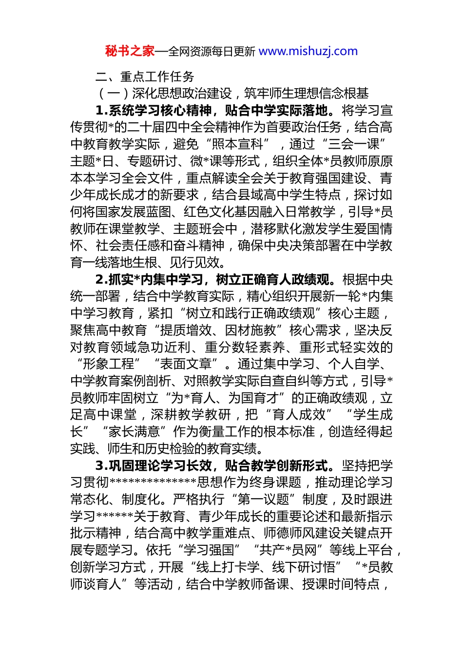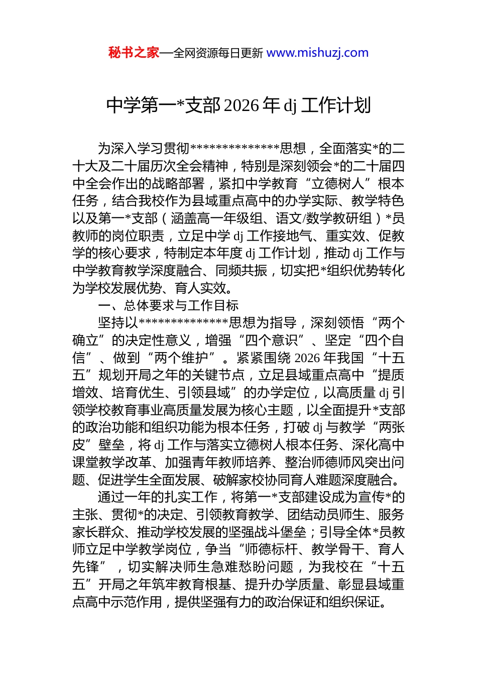 秘书之家—全网资源每日更新 www.mishuzj.com中学第一*支部 2026 年 dj 工作计划为深入学习贯彻**************思想,全面落实*的二十大及二十届历次全会精神,特别是深刻领会*的二十届四中全会作出的战略部署,紧扣中学教育“立德树人”根本任务,结合我校作为县域重点高中的办学实际、教学特色以及第一*支部(涵盖高一年级组、语文/数学教研组)*员教师的岗位职责,立足中学 dj 工作接地气、重实效、促教学的核心要求,特制定本年度 dj 工作计划,推动 dj 工作与中学教育教学深度融合、同频共振,切实把*组织优势转化为学校发展优势、育人实效。一、总体要求与工作目标坚持以**************思想为指导,深刻领悟“两个确立”的决定性意义,增强“四个意识”、坚定“四个自信”、做到“两个维护”。紧紧围绕 2026 年我国“十五五”规划开局之年的关键节点,立足县域重点高中“提质增效、培育优生、引领县域”的办学定位,以高质量 dj 引领学校教育事业高质量发展为核心主题,以全面提升*支部的政治功能和组织功能为根本任务,打破 dj 与教学“两张皮”壁垒,将 dj 工作与落实立德树人根本任务、深化高中课堂教学改革、加强青年教师培养、整治师德师风突出问题、促进学生全面发展、破解家校协同育人难题深度融合。通过一年的扎实工作,将第一*支部建设成为宣传*的主张、贯彻*的决定、引领教育教学、团结动员师生、服务家长群众、推动学校发展的坚强战斗堡垒;引导全体*员教师立足中学教学岗位,争当“师德标杆、教学骨干、育人先锋”,切实解决师生急难愁盼问题,为我校在“十五五”开局之年筑牢教育根基、提升办学质量、彰显县域重点高中示范作用,提供坚强有力的政治保证和组织保证。秘书之家—全网资源每日更新 www.mishuzj.com二、重点工作任务(一)深化思想政治建设,筑牢师生理想信念根基1.系统学习核心精神,贴合中学实际落地。将学习宣传贯彻*的二十届四中全会精神作为首要政治任务,结合高中教育教学实际,避免“照本宣科”,通过“三会一课”主题*日、专题研讨、微*课等形式,组织全体*员教师原原本本学习全会文件,重点解读全会关于教育强国建设、青少年成长成才的新要求,结合县域高中学生特点,探讨如何将国家发展蓝图、红色文化基因融入日常教学,引导*员教师在课堂教学、主题班会中,潜移默化激发学生爱国情怀、社会责任感和奋斗精神,确保中央决策部署在中学教育一线落地生根、见行见效。2.抓实*内集中学习,树立正确育人政绩观。根据中央统一部署,结合中学教育实际,精心组织开展新一轮*内集中学习教育,紧扣“树立和践行正确政绩观”核心主题,聚焦高中教育“提质增效、因材施教”核心需求,坚决反对教育领域急功近利、重分数轻素养、重形式轻实效的“形象工程”“表面文章”。通过集中学习、个人自学、中学教育案例剖析、对照教学实际自查自纠等方式,引导*员教师牢固树立“为*育人、为国育才”的正确政绩观,立足高中课堂,深耕教学教研,把“育人成效”“学生成长”“家长满意”作为衡量工作的根本标准,创造经得起实践、师生和历史检验的教育实绩。3.巩固理论学习长效,贴合教学创新形式。坚持把学习贯彻**************思想作为终身课题,推动理论学习常态化、制度化。严格执行“第一议题”制度,及时跟进学习******关于教育、青少年成长的重要论述和最新指示批示精神,结合高中教学重难点、师德师风建设关键点开展专题学习。依托“学习强国”“共产*员网”等线上平台,创新学习方式,开展“线上打卡学、线下研讨悟”“*员教师谈育人”等活动,结合中学教师备课、授课时间特点,秘书之家—全网资源每日更新 www.mishuzj.com灵活安排学习时长,确保*员年度集中学习培训时间不少于32 学时。支部委员、*员骨干教师带头学、深入学,带头上思政微*课、分享育人心得,营造“比学赶超、争当先锋”的浓厚学习氛围,切实将学习成果转化为锤炼*性、指导教学、破解育人难题的强大力量。(二)夯实基层组织基础,提升 dj 与教学融合水平1.规范*内组织生活,贴合教学创新形式。认真落实《关于新形势下*内政治生活的若干准则》,高质量开好“三会...