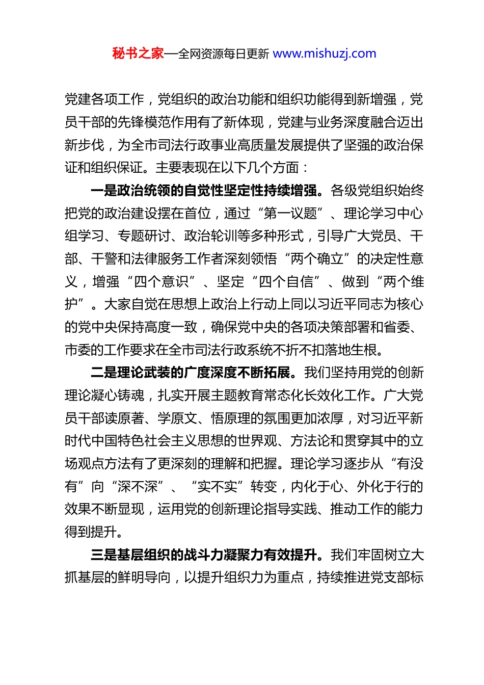 秘书之家—全网资源每日更新 www.mishuzj.comXX 市司法局党组书记、局长在 2025 年度党组织书记抓基层党建述职评议会上的总结讲话同志们:今天,我们利用半天时间,召开了 2025 年度全局党组织书记抓基层党建述职评议会议。这次会议既是一次展示成果、交流经验的总结会,也是一次查找不足、明确方向的推进会,更是一次传导压力、压实责任的落实会。会上,局直属单位、局属行业协会以及局机关各党支部的书记们就过去一年抓基层党建工作的情况进行了认真述职,大家准备充分、思考深入,既讲清了履职情况和特色亮点,也实事求是地分析了存在的问题和薄弱环节,并提出了下一步的改进思路。与会同志本着对组织、对同志、对事业高度负责的态度,开展了严肃认真的民主评议。各位局党组班子成员也结合分管工作,进行了客观点评,肯定了成绩,指出了问题,提出了希望,针对性都很强。总的来看,这次述职评议会议主题集中、程序严谨、效果明显,达到了预期目的。过去的一年,面对复杂严峻的外部环境和艰巨繁重的工作任务,全局各级党组织和广大党员干部坚持以习近平新时代中国特色社会主义思想为指导,深入学习贯彻习近平法治思想和习近平总书记关于党的建设的重要思想,紧紧围绕市委市政府中心工作,以高度的政治责任感和历史使命感,扎实推进基层秘书之家—全网资源每日更新 www.mishuzj.com党建各项工作,党组织的政治功能和组织功能得到新增强,党员干部的先锋模范作用有了新体现,党建与业务深度融合迈出新步伐,为全市司法行政事业高质量发展提供了坚强的政治保证和组织保证。主要表现在以下几个方面:一是政治统领的自觉性坚定性持续增强。各级党组织始终把党的政治建设摆在首位,通过“第一议题”、理论学习中心组学习、专题研讨、政治轮训等多种形式,引导广大党员、干部、干警和法律服务工作者深刻领悟“两个确立”的决定性意义,增强“四个意识”、坚定“四个自信”、做到“两个维护”。大家自觉在思想上政治上行动上同以习近平同志为核心的党中央保持高度一致,确保党中央的各项决策部署和省委、市委的工作要求在全市司法行政系统不折不扣落地生根。二是理论武装的广度深度不断拓展。我们坚持用党的创新理论凝心铸魂,扎实开展主题教育常态化长效化工作。广大党员干部读原著、学原文、悟原理的氛围更加浓厚,对习近平新时代中国特色社会主义思想的世界观、方法论和贯穿其中的立场观点方法有了更深刻的理解和把握。理论学习逐步从“有没有”向“深不深”、“实不实”转变,内化于心、外化于行的效果不断显现,运用党的创新理论指导实践、推动工作的能力得到提升。三是基层组织的战斗力凝聚力有效提升。我们牢固树立大抓基层的鲜明导向,以提升组织力为重点,持续推进党支部标秘书之家—全网资源每日更新 www.mishuzj.com准化规范化建设。各基层党组织认真落实“三会一课”、组织生活会、民主评议党员等基本制度,组织生活的政治性、时代性、原则性、战斗性不断增强。支部换届选举工作平稳有序,班子结构进一步优化。一些支部在创建党建品牌、创新活动载体等方面进行了有益探索,形成了不少好经验好做法,比如 XX公证处党支部的“公证为民·暖心服务”、XX 律师协会党委的“党建引领·律心护航”等品牌,都取得了较好反响。四是服务大局的融合度贡献度稳步提高。各级党组织坚持围绕中心抓党建、抓好党建促业务,自觉将党建工作融入法治建设、平安建设、优化法治化营商环境、公共法律服务体系建设等各项业务工作中。在法治政府建设示范创建、矛盾纠纷多元化解、重点人群服务管理、普法宣传教育等一线,广大党员干警和法律服务工作者冲锋在前、担当作为,把党组织的战斗堡垒作用体现在了破解工作难题、完成重大任务上,把党员的先锋形象树立在了服务群众、奉献社会的实践中。五是纪律作风的严肃性纯洁性得到强化。我们坚决扛起管党治党政治责任,持续深化党风廉政建设和反腐败斗争。严格落实中央八项规定及其实施细则精神,力戒形式主义、官僚主义。加强对党员干部的日常教育管理监督,运用监督执纪“四种形态”特别是第一种形态更加经常,抓早抓小、防微杜渐的机制逐步完...
