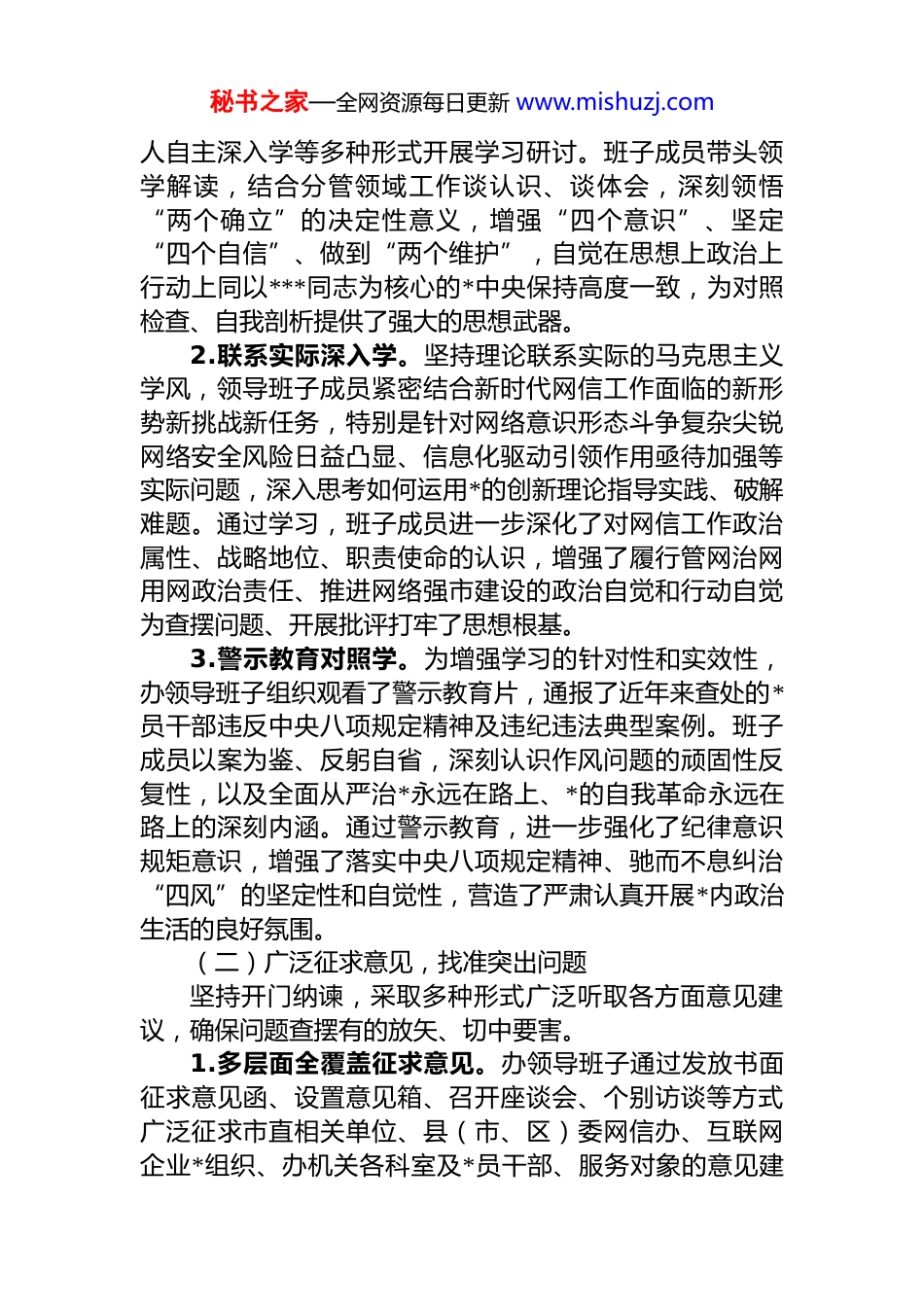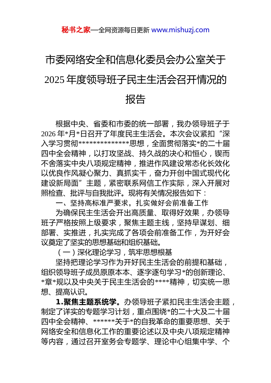 秘书之家—全网资源每日更新 www.mishuzj.com市委网络安全和信息化委员会办公室关于2025 年度领导班子民主生活会召开情况的报告根据中央、省委和市委的统一部署,我办领导班子于2026 年*月*日召开了年度民主生活会。本次会议紧扣“深入学习贯彻**************思想,全面贯彻落实*的二十届四中全会精神,以打攻坚战、持久战的决心和恒心,锲而不舍落实中央八项规定精神,推进作风建设常态化长效化以优良作风凝心聚力、真抓实干,奋力开创中国式现代化建设新局面”主题,紧密联系网信工作实际,深入开展对照检查、批评与自我批评。现将有关情况报告如下:一、坚持高标准严要求,扎实做好会前准备工作为确保民主生活会开出高质量、取得好效果,办领导班子严格按照上级要求,聚焦主题主线,坚持早谋划、细部署、实推进,扎实完成了各项会前准备工作,为开好会议奠定了坚实的思想基础和组织基础。(一)深化理论学习,筑牢思想根基坚持把理论学习作为开好民主生活会的前提和基础,组织领导班子成员原原本本、逐字逐句学习*的创新理论、*章*规以及中央关于民主生活会的****精神,切实统一思想、提高认识。1.聚焦主题系统学。办领导班子紧扣民主生活会主题,制定了详实的专题学习计划,重点围绕*的二十大及二十届四中全会精神、******关于*的自我革命的重要思想、关于网络安全和信息化工作的重要论述以及中央八项规定精神等内容,通过召开室务会专题学、理论中心组集中学、个秘书之家—全网资源每日更新 www.mishuzj.com人自主深入学等多种形式开展学习研讨。班子成员带头领学解读,结合分管领域工作谈认识、谈体会,深刻领悟“两个确立”的决定性意义,增强“四个意识”、坚定“四个自信”、做到“两个维护”,自觉在思想上政治上行动上同以***同志为核心的*中央保持高度一致,为对照检查、自我剖析提供了强大的思想武器。2.联系实际深入学。坚持理论联系实际的马克思主义学风,领导班子成员紧密结合新时代网信工作面临的新形势新挑战新任务,特别是针对网络意识形态斗争复杂尖锐网络安全风险日益凸显、信息化驱动引领作用亟待加强等实际问题,深入思考如何运用*的创新理论指导实践、破解难题。通过学习,班子成员进一步深化了对网信工作政治属性、战略地位、职责使命的认识,增强了履行管网治网用网政治责任、推进网络强市建设的政治自觉和行动自觉为查摆问题、开展批评打牢了思想根基。3.警示教育对照学。为增强学习的针对性和实效性,办领导班子组织观看了警示教育片,通报了近年来查处的*员干部违反中央八项规定精神及违纪违法典型案例。班子成员以案为鉴、反躬自省,深刻认识作风问题的顽固性反复性,以及全面从严治*永远在路上、*的自我革命永远在路上的深刻内涵。通过警示教育,进一步强化了纪律意识规矩意识,增强了落实中央八项规定精神、驰而不息纠治“四风”的坚定性和自觉性,营造了严肃认真开展*内政治生活的良好氛围。(二)广泛征求意见,找准突出问题坚持开门纳谏,采取多种形式广泛听取各方面意见建议,确保问题查摆有的放矢、切中要害。1.多层面全覆盖征求意见。办领导班子通过发放书面征求意见函、设置意见箱、召开座谈会、个别访谈等方式广泛征求市直相关单位、县(市、区)委网信办、互联网企业*组织、办机关各科室及*员干部、服务对象的意见建秘书之家—全网资源每日更新 www.mishuzj.com议。特别注重听取基层网信干部、网络媒体从业人员、专家学者和网民代表的意见,确保征求意见的广泛性和代表性。共征集到对领导班子原汁原味的意见建议*大类*条,为精准画像、深入剖析提供了丰富素材。2.原汁原味梳理反馈意见。对征集到的意见建议,指定专人进行汇总整理、分类归纳,并剔除空话套话,保留核心内容和具体事例,确保意见建议的真实性和针对性。办主要负责同志主持召开专题会议,对梳理出的意见建议逐条分析研究,并原汁原味地向领导班子集体和每位成员进行反馈。班子成员主动认领、对号入座,将其作为撰写个人发言提纲、进行自我批评的重要依据,确保群众呼声和基层诉求得到充分体现。3.聚焦职能深入查摆问题。在广泛征求意见的基础上,领导班子紧扣网信办职...
