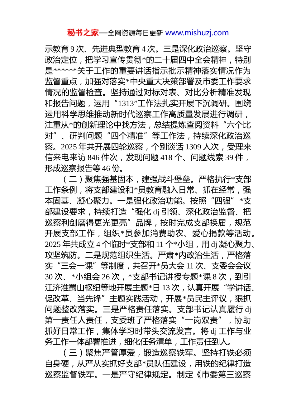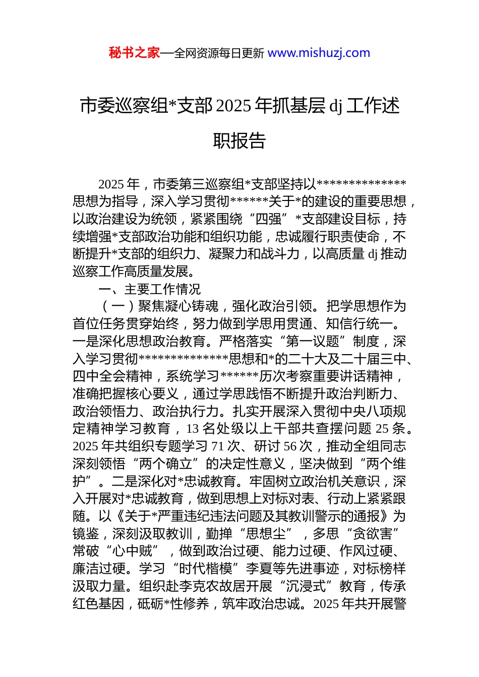 秘书之家—全网资源每日更新 www.mishuzj.com市委巡察组*支部 2025 年抓基层 dj 工作述职报告2025 年,市委第三巡察组*支部坚持以**************思想为指导,深入学习贯彻******关于*的建设的重要思想,以政治建设为统领,紧紧围绕“四强”*支部建设目标,持续增强*支部政治功能和组织功能,忠诚履行职责使命,不断提升*支部的组织力、凝聚力和战斗力,以高质量 dj 推动巡察工作高质量发展。一、主要工作情况(一)聚焦凝心铸魂,强化政治引领。把学思想作为首位任务贯穿始终,努力做到学思用贯通、知信行统一。一是深化思想政治教育。严格落实“第一议题”制度,深入学习贯彻**************思想和*的二十大及二十届三中、四中全会精神,系统学习******历次考察重要讲话精神,准确把握核心要义,通过学思践悟不断提升政治判断力、政治领悟力、政治执行力。扎实开展深入贯彻中央八项规定精神学习教育,13 名处级以上干部共查摆问题 25 条。2025 年共组织专题学习 71 次、研讨 56 次,推动全组同志深刻领悟“两个确立”的决定性意义,坚决做到“两个维护”。二是深化对*忠诚教育。牢固树立政治机关意识,深入开展对*忠诚教育,做到思想上对标对表、行动上紧紧跟随。以《关于*严重违纪违法问题及其教训警示的通报》为镜鉴,深刻汲取教训,勤掸“思想尘”,多思“贪欲害”常破“心中贼”,做到政治过硬、能力过硬、作风过硬、廉洁过硬。学习“时代楷模”李夏等先进事迹,对标榜样汲取力量。组织赴李克农故居开展“沉浸式”教育,传承红色基因,砥砺*性修养,筑牢政治忠诚。2025 年共开展警秘书之家—全网资源每日更新 www.mishuzj.com示教育 9 次、先进典型教育 4 次。三是深化政治巡察。坚守政治定位,把学习宣传贯彻*的二十届四中全会精神,特别是******关于工作的重要讲话指示批示精神落实情况作为监督重点,加强对落实*中央重大决策部署及市委工作要求情况的监督检查。坚持通过对标对表、对比分析精准发现和报告问题,运用“1313”工作法扎实开展下沉调研。围绕运用科学思维推动新时代巡察工作高质量发展进行调研,注重从*的创新理论中找方法,总结提炼查阅资料“六个比对”、研判问题“四个精准”等工作法,持续深化政治巡察。2025 年共开展四轮巡察,个别谈话 1309 人次,受理来信来电来访 846 件次,发现问题 418 个、问题线索 39 件,形成巡察报告等 46 份。(二)聚焦强基固本,建强战斗堡垒。严格执行*支部工作条例,将支部建设和*员教育融入日常、抓在经常,强本固基、凝心聚力。一是强化政治功能。按照“四强”*支部建设要求,持续打造“强化 dj 引领、深化政治监督、把巡察利剑磨得更光更亮”品牌,按时完成支部换届,规范开展支部工作,组织*员参加消费助农、爱心捐款等活动。2025 年共成立 4 个临时*支部和 11 个*小组,用 dj 凝心聚力、攻坚筑防。二是规范组织生活。严肃*内政治生活,严格落实“三会一课”等制度,共召开*员大会 11 次、支委会会议30 次、*小组会 26 次,*支部书记讲授专题*课 8 次,到引江济淮蜀山枢纽等地开展主题*日 13 次,认真开展“学讲话、促改革、当先锋”主题实践活动,开展*员民主评议,狠抓问题整改落实。三是严格责任落实。支部书记认真履行 dj第一责任人责任,支委班子严格落实“一岗双责”,协助抓好日常工作,集体学习时带头交流发言。将 dj 工作与业务工作一体部署推进,细化任务清单,工作责任到人。(三)聚焦严管厚爱,锻造巡察铁军。坚持打铁必须自身硬,从严从实抓好支部*员队伍建设,用铁的纪律打造巡察监督铁军。一是严守纪律规定。制定《市委第三巡察秘书之家—全网资源每日更新 www.mishuzj.com“十不准”纪律要求》,督促全组严格落实中央纪委关于违规饮酒“六条禁令”、市委关于违规吃喝“十个严”要求等管理监督规定,严禁以巡谋私,严禁铺张浪费,禁止超越职责范围开展巡察工作,自觉接受各方监督,使铁的纪律成为日常习惯和自觉遵循。二是强化作风养成。积极开展“为民惠企争模范”行动,督促被巡察*组织及时解决群众“急难愁盼”问题 336 件。严格落实中央...