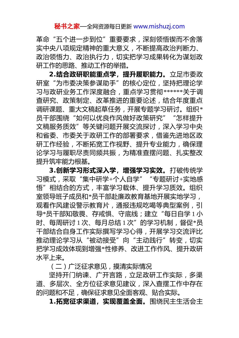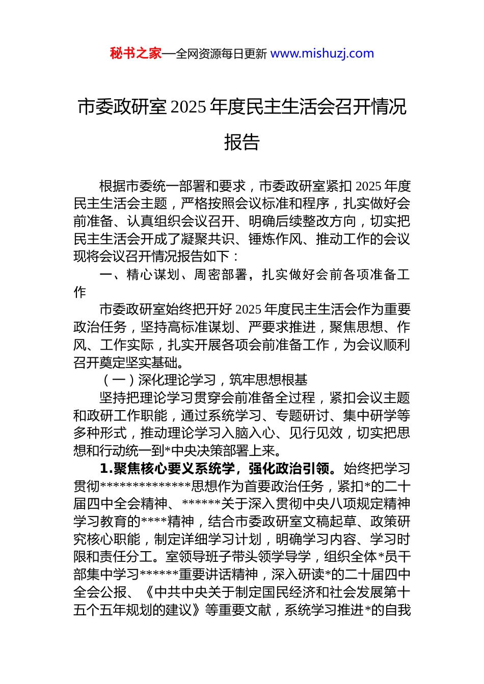 秘书之家—全网资源每日更新 www.mishuzj.com市委政研室 2025 年度民主生活会召开情况报告根据市委统一部署和要求,市委政研室紧扣 2025 年度民主生活会主题,严格按照会议标准和程序,扎实做好会前准备、认真组织会议召开、明确后续整改方向,切实把民主生活会开成了凝聚共识、锤炼作风、推动工作的会议现将会议召开情况报告如下:一、精心谋划、周密部署,扎实做好会前各项准备工作市委政研室始终把开好 2025 年度民主生活会作为重要政治任务,坚持高标准谋划、严要求推进,聚焦思想、作风、工作实际,扎实开展各项会前准备工作,为会议顺利召开奠定坚实基础。(一)深化理论学习,筑牢思想根基坚持把理论学习贯穿会前准备全过程,紧扣会议主题和政研工作职能,通过系统学习、专题研讨、集中研学等多种形式,推动理论学习入脑入心、见行见效,切实把思想和行动统一到*中央决策部署上来。1.聚焦核心要义系统学,强化政治引领。始终把学习贯彻**************思想作为首要政治任务,紧扣*的二十届四中全会精神、******关于深入贯彻中央八项规定精神学习教育的****精神,结合市委政研室文稿起草、政策研究核心职能,制定详细学习计划,明确学习内容、学习时限和责任分工。室领导班子带头领学导学,组织全体*员干部集中学习******重要讲话精神,深入研读*的二十届四中全会公报、《中共中央关于制定国民经济和社会发展第十五个五年规划的建议》等重要文献,系统学习推进*的自我秘书之家—全网资源每日更新 www.mishuzj.com革命“五个进一步到位”重要要求,深刻领悟锲而不舍落实中央八项规定精神的重大意义,不断提高政治判断力、政治领悟力、政治执行力,切实把学习成果转化为谋划政研工作的思路、推动工作的举措。2.结合政研职能重点学,提升履职能力。立足市委政研室“为市委决策参谋助手”的核心定位,坚持把理论学习与政研业务工作深度融合,重点学习贯彻******关于调查研究、政策制定、改革推进的重要论述,结合年度重点调研课题、重大文稿起草任务,开展专题学习研讨。组织*员干部围绕“如何以优良作风做好政策研究”“怎样提升文稿服务质效”等关键问题开展交流探讨,深入学习中央和省委、市委关于政研工作的部署要求,借鉴先进地区政研工作经验,不断拓宽工作视野、提升专业能力,确保理论学习与履职尽责同频共振,为精准查摆问题、扎实整改提升筑牢能力根基。3.创新学习形式深入学,增强学习实效。打破传统学习模式,采取“集中研学+个人自学”“专题研讨+实地感悟”相结合的方式,丰富学习载体、提升学习质效。组织室领导班子成员和*员干部赴廉政教育基地开展实地学习,观看作风建设警示教育片,通报违规吃喝等典型案例,引导*员干部知敬畏、存戒惧、守底线;建立“每日自学 1 小时、每周研讨 1 次、每月总结 1 次”的学习机制,督促*员干部结合自身工作实际撰写学习心得,开展学习交流评比推动理论学习从“被动接受”向“主动践行”转变,切实把学习成效体现到增强*性修养、改进工作作风、提升政研水平上来。(二)广泛征求意见,摸清实际情况坚持开门纳谏、广开言路,立足政研工作实际,多渠道、多层次、全方位征求意见建议,深入查摆工作中存在的问题和不足,确保征求意见全面客观、贴合实际。1.拓宽征求渠道,实现覆盖全面。围绕民主生活会主秘书之家—全网资源每日更新 www.mishuzj.com题,结合市委政研室文稿起草、调查研究、改革推进、信息服务等核心职能,采取“发放征求意见函、召开座谈会开展个别访谈、设置意见箱”等多种形式,广泛征求各县(市、区)委政研室、市直各部门、基层联系点、服务对象以及室内部*员干部的意见建议。重点征求对室领导班子及成员在理论学习、政治素质、能力本领、担当作为、工作作风、廉洁自律等方面的意见,特别是围绕落实中央八项规定精神、推进作风建设常态化长效化、提升政研服务质效等重点内容,确保征求意见覆盖各个层面、各个领域全面掌握各方反映的突出问题。2.细化征求内容,突出政研特色。结合市委政研室工作实际,精心设计征求意见清单,聚焦文稿起草的针对性实效性、调查研究的深度广度、改革推进的力度成...