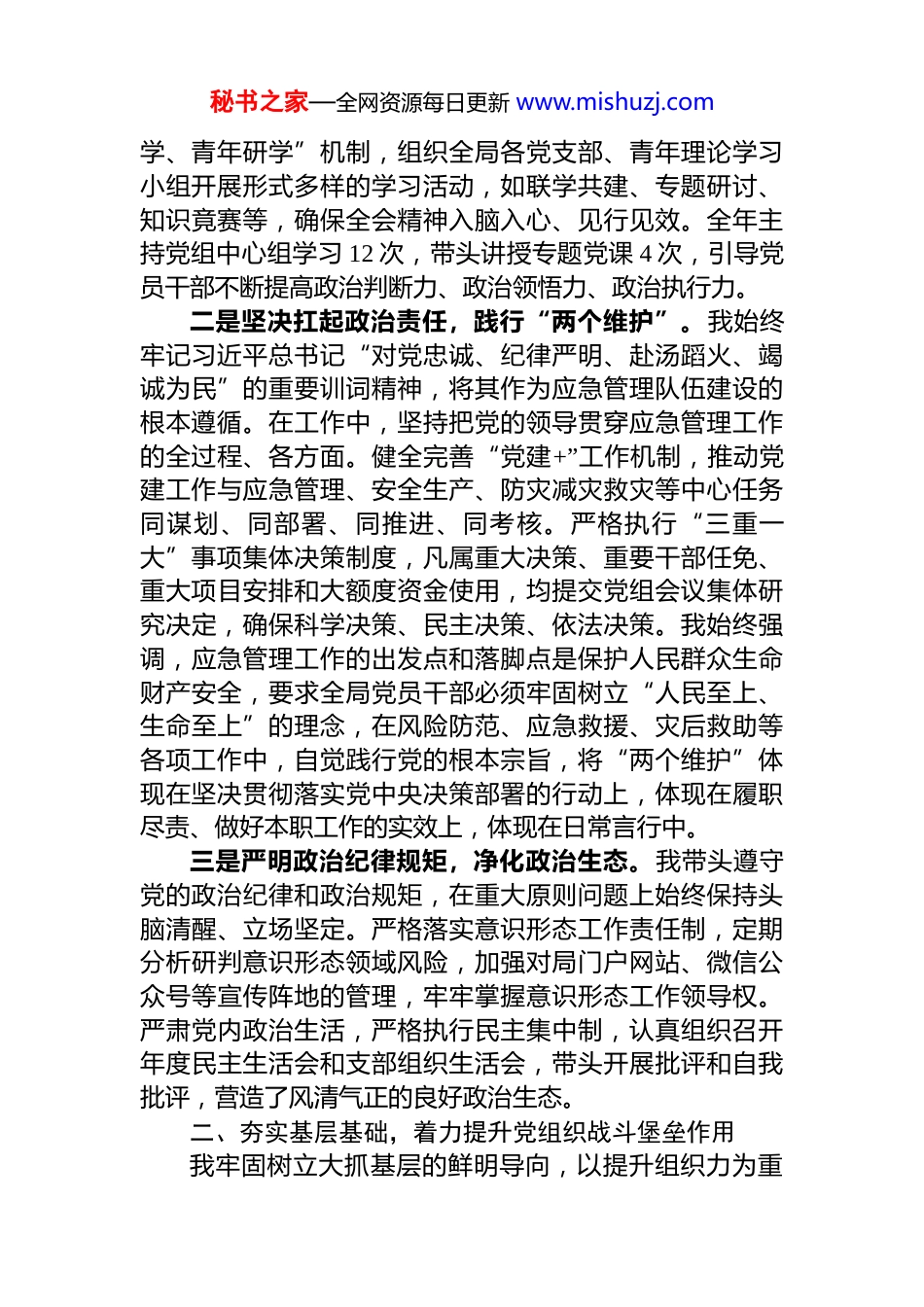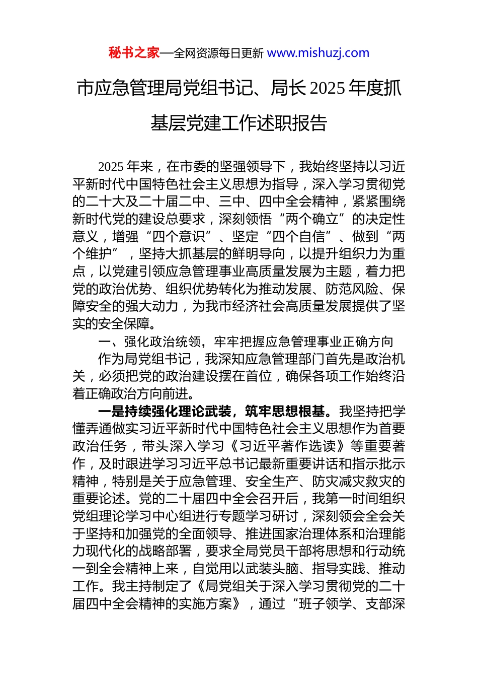 秘书之家—全网资源每日更新 www.mishuzj.com市应急管理局党组书记、局长 2025 年度抓基层党建工作述职报告2025 年来,在市委的坚强领导下,我始终坚持以习近平新时代中国特色社会主义思想为指导,深入学习贯彻党的二十大及二十届二中、三中、四中全会精神,紧紧围绕新时代党的建设总要求,深刻领悟“两个确立”的决定性意义,增强“四个意识”、坚定“四个自信”、做到“两个维护”,坚持大抓基层的鲜明导向,以提升组织力为重点,以党建引领应急管理事业高质量发展为主题,着力把党的政治优势、组织优势转化为推动发展、防范风险、保障安全的强大动力,为我市经济社会高质量发展提供了坚实的安全保障。一、强化政治统领,牢牢把握应急管理事业正确方向作为局党组书记,我深知应急管理部门首先是政治机关,必须把党的政治建设摆在首位,确保各项工作始终沿着正确政治方向前进。一是持续强化理论武装,筑牢思想根基。我坚持把学懂弄通做实习近平新时代中国特色社会主义思想作为首要政治任务,带头深入学习《习近平著作选读》等重要著作,及时跟进学习习近平总书记最新重要讲话和指示批示精神,特别是关于应急管理、安全生产、防灾减灾救灾的重要论述。党的二十届四中全会召开后,我第一时间组织党组理论学习中心组进行专题学习研讨,深刻领会全会关于坚持和加强党的全面领导、推进国家治理体系和治理能力现代化的战略部署,要求全局党员干部将思想和行动统一到全会精神上来,自觉用以武装头脑、指导实践、推动工作。我主持制定了《局党组关于深入学习贯彻党的二十届四中全会精神的实施方案》,通过“班子领学、支部深秘书之家—全网资源每日更新 www.mishuzj.com学、青年研学”机制,组织全局各党支部、青年理论学习小组开展形式多样的学习活动,如联学共建、专题研讨、知识竟赛等,确保全会精神入脑入心、见行见效。全年主持党组中心组学习 12 次,带头讲授专题党课 4 次,引导党员干部不断提高政治判断力、政治领悟力、政治执行力。二是坚决扛起政治责任,践行“两个维护”。我始终牢记习近平总书记“对党忠诚、纪律严明、赴汤蹈火、竭诚为民”的重要训词精神,将其作为应急管理队伍建设的根本遵循。在工作中,坚持把党的领导贯穿应急管理工作的全过程、各方面。健全完善“党建+”工作机制,推动党建工作与应急管理、安全生产、防灾减灾救灾等中心任务同谋划、同部署、同推进、同考核。严格执行“三重一大”事项集体决策制度,凡属重大决策、重要干部任免、重大项目安排和大额度资金使用,均提交党组会议集体研究决定,确保科学决策、民主决策、依法决策。我始终强调,应急管理工作的出发点和落脚点是保护人民群众生命财产安全,要求全局党员干部必须牢固树立“人民至上、生命至上”的理念,在风险防范、应急救援、灾后救助等各项工作中,自觉践行党的根本宗旨,将“两个维护”体现在坚决贯彻落实党中央决策部署的行动上,体现在履职尽责、做好本职工作的实效上,体现在日常言行中。三是严明政治纪律规矩,净化政治生态。我带头遵守党的政治纪律和政治规矩,在重大原则问题上始终保持头脑清醒、立场坚定。严格落实意识形态工作责任制,定期分析研判意识形态领域风险,加强对局门户网站、微信公众号等宣传阵地的管理,牢牢掌握意识形态工作领导权。严肃党内政治生活,严格执行民主集中制,认真组织召开年度民主生活会和支部组织生活会,带头开展批评和自我批评,营造了风清气正的良好政治生态。二、夯实基层基础,着力提升党组织战斗堡垒作用我牢固树立大抓基层的鲜明导向,以提升组织力为重秘书之家—全网资源每日更新 www.mishuzj.com点,持续用力、精准发力,推动基层党组织全面进步、全面过硬。一是建强支部战斗堡垒。我坚持把党支部建设作为最重要的基本建设,严格落实《中国共产党支部工作条例(试行)》,持续推进党支部标准化规范化建设。优化支部设置,选优配强支部书记,督促各支部严格落实“三会一课”、主题党日、组织生活会、民主评议党员等基本制度。我本人坚持每月至少参加 1 次所在支部或联系点的组织生活,与普通党员一起学习交流、接受教育。指导各...
