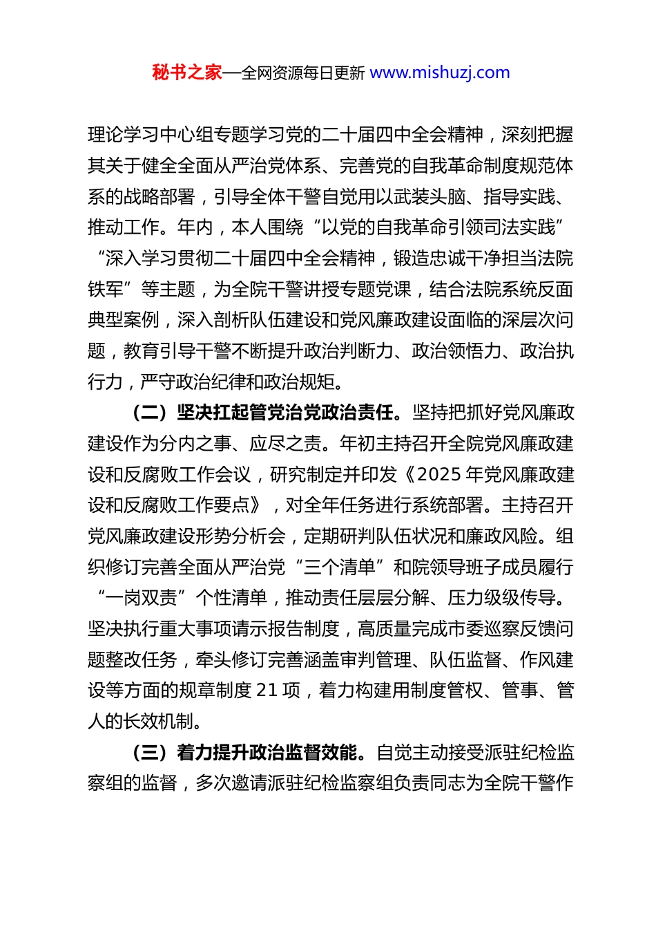 秘书之家—全网资源每日更新 www.mishuzj.comXX 市中级人民法院院长 2025 年度履行党风廉政建设责任制情况报告2025 年,在市委坚强领导和上级法院有力指导下,本人坚持以习近平新时代中国特色社会主义思想为指导,深入学习贯彻党的二十大和二十届二中、三中、四中全会精神,特别是将学习贯彻党的二十届四中全会关于坚持和完善党和国家监督体系、推进党的自我革命等重要部署作为重大政治任务,紧密围绕“公正与效率”工作主题,切实履行本院党风廉政建设第一责任人职责,团结带领党组一班人,坚持严的主基调不动摇,纵深推进全面从严管党治院,为法院工作高质量发展提供了坚强的纪律和作风保障。现将一年来履行党风廉政建设责任情况报告如下:一、强化政治引领,筑牢忠诚根基,坚定不移把准正确政治方向始终将党的政治建设摆在首位,深刻领悟“两个确立”的决定性意义,增强“四个意识”、坚定“四个自信”、做到“两个维护”,确保法院工作始终沿着正确政治方向前进。(一)持续深化创新理论武装。坚持把学习贯彻习近平新时代中国特色社会主义思想作为首要政治任务,严格落实“第一议题”制度,第一时间组织学习党中央最新决策部署、习近平总书记最新重要讲话和重要指示批示精神。带头并组织党组秘书之家—全网资源每日更新 www.mishuzj.com理论学习中心组专题学习党的二十届四中全会精神,深刻把握其关于健全全面从严治党体系、完善党的自我革命制度规范体系的战略部署,引导全体干警自觉用以武装头脑、指导实践、推动工作。年内,本人围绕“以党的自我革命引领司法实践”“深入学习贯彻二十届四中全会精神,锻造忠诚干净担当法院铁军”等主题,为全院干警讲授专题党课,结合法院系统反面典型案例,深入剖析队伍建设和党风廉政建设面临的深层次问题,教育引导干警不断提升政治判断力、政治领悟力、政治执行力,严守政治纪律和政治规矩。(二)坚决扛起管党治党政治责任。坚持把抓好党风廉政建设作为分内之事、应尽之责。年初主持召开全院党风廉政建设和反腐败工作会议,研究制定并印发《2025 年党风廉政建设和反腐败工作要点》,对全年任务进行系统部署。主持召开党风廉政建设形势分析会,定期研判队伍状况和廉政风险。组织修订完善全面从严治党“三个清单”和院领导班子成员履行“一岗双责”个性清单,推动责任层层分解、压力级级传导。坚决执行重大事项请示报告制度,高质量完成市委巡察反馈问题整改任务,牵头修订完善涵盖审判管理、队伍监督、作风建设等方面的规章制度 21 项,着力构建用制度管权、管事、管人的长效机制。(三)着力提升政治监督效能。自觉主动接受派驻纪检监察组的监督,多次邀请派驻纪检监察组负责同志为全院干警作秘书之家—全网资源每日更新 www.mishuzj.com廉政辅导报告,深入解读党的纪律规矩特别是新修订的纪律处分条例,结合真实案例开展警示教育。完善内部监督与纪检监察监督贯通协调机制,在问题线索移交、案件查办协作、整改督促落实等方面形成合力。严格执行民主集中制,凡属“三重一大”事项均提交党组会议集体研究决定,确保权力在阳光下运行。二、聚焦关键环节,压实主体责任,一以贯之推进全面从严治党牢固树立“抓好党风廉政建设是本职、不抓是失职、抓不好是渎职”的理念,将党风廉政建设与审判执行工作同谋划、同部署、同推进、同考核。(一)狠抓警示教育筑牢思想防线。部署开展“警示教育深化年”活动,将以案促改、以案促治作为重要抓手。组织全体干警观看警示教育片,学习违纪违法典型案例剖析材料,用“身边事”教育“身边人”。安排青年干警旁听职务犯罪案件庭审,零距离感受法律威严和违纪违法的惨痛代价,引导干警知敬畏、存戒惧、守底线。聚焦“学案例、明纪律、知敬畏”目标,推动警示教育常态化、制度化,全年开展各类警示教育活动覆盖全员。(二)做实日常监督防范廉政风险。坚持严管厚爱结合,将监督关口前移。部署开展分层分级全覆盖谈心谈话 316 人次,本人与班子成员、关键岗位负责人、新提拔干部等进行重点谈秘书之家—全网资源每日更新 www.mishuzj.com话,及时掌握思想动态,提醒廉洁风险。对新提拔、遴...