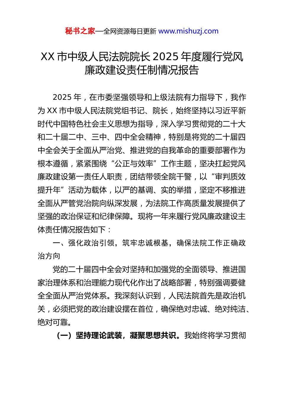 秘书之家—全网资源每日更新 www.mishuzj.comXX 市中级人民法院院长 2025 年度履行党风廉政建设责任制情况报告2025 年,在市委坚强领导和上级法院有力指导下,我作为 XX 市中级人民法院党组书记、院长,始终坚持以习近平新时代中国特色社会主义思想为指导,深入学习贯彻党的二十大和二十届二中、三中、四中全会精神,特别是将党的二十届四中全会关于全面从严治党、推进党的自我革命的重要部署作为根本遵循,紧紧围绕“公正与效率”工作主题,坚决扛起党风廉政建设第一责任人职责,团结带领全院干警,以“审判质效提升年”活动为载体,以严的基调、实的举措,坚定不移推进全面从严管党治院向纵深发展,为法院工作高质量发展提供了坚强的政治保证和纪律保障。现将一年来履行党风廉政建设主体责任情况报告如下:一、强化政治引领,筑牢忠诚根基,确保法院工作正确政治方向党的二十届四中全会对坚持和加强党的全面领导、推进国家治理体系和治理能力现代化作出了战略部署,特别强调要健全全面从严治党体系。我深刻认识到,人民法院首先是政治机关,必须把党的政治建设摆在首位,确保绝对忠诚、绝对纯洁、绝对可靠。(一)坚持理论武装,凝聚思想共识。我始终将学习贯彻秘书之家—全网资源每日更新 www.mishuzj.com党的创新理论作为首要政治任务,主持召开党组会议、理论学习中心组学习会,带头领学党的二十大及二十届历次全会精神,重点研读党的二十届四中全会文件,深刻领会其核心要义和实践要求。严格落实“第一议题”制度,及时传达学习习近平总书记最新重要讲话和指示批示精神,引导全院干警深刻领悟“两个确立”的决定性意义,增强“四个意识”、坚定“四个自信”、做到“两个维护”。全年组织党组理论学习中心组学习 XX 次,专题研讨 X 次。我本人以“深入学习贯彻二十届四中全会精神,锻造忠诚干净担当的法院铁军”为题讲授专题党课,结合法院系统内外反面典型案例,深入剖析队伍建设和党风廉政建设方面存在的风险隐患,教育引导干警不断提高政治判断力、政治领悟力、政治执行力。(二)严守政治纪律,坚决贯彻落实。我带头严格执行党的政治纪律和政治规矩,坚决贯彻落实党中央决策部署及省委、市委工作要求,确保政令畅通、令行禁止。规范执行重大事项请示报告制度,对涉及全局性、战略性的重要工作、重大事项,主动及时向市委和上级法院党组请示报告。高度重视并高质量完成市委巡察反馈意见的整改落实工作,亲自担任整改领导小组组长,主持制定整改方案,细化整改措施,修订完善涉及审判管理、队伍建设、廉政风险防控等方面的规章制度 21 项,推动巡察反馈问题真改实改、全面整改,以整改实效促进工作提升。秘书之家—全网资源每日更新 www.mishuzj.com(三)压实政治责任,健全责任体系。我认真履行第一责任人职责,坚持重要工作亲自部署、重大问题亲自过问、重点环节亲自协调、重要案件亲自督办。年初,主持召开全院党风廉政建设和反腐败工作会议,分析形势,部署任务,审定《XX市中级人民法院 2025 年党风廉政建设和反腐败工作要点》。推动完善全面从严治党责任体系,牵头制定并动态更新院党组主体责任清单、党组书记“第一责任人”责任清单、班子成员“一岗双责”个性清单,形成明责、履责、考责、问责的闭环链条。定期召开党风廉政建设形势分析会,听取班子成员履行“一岗双责”情况汇报,研究解决突出问题,确保压力层层传导、责任环环相扣。二、深化思想教育,严明纪律规矩,夯实拒腐防变思想堤坝我深知,思想“总开关”拧不紧,行为就会出偏差。一年来,我坚持教育在先、预防为主,将纪律教育和廉洁文化建设融入日常、抓在经常,引导干警知敬畏、存戒惧、守底线。(一)扎实开展纪律学习教育。将新修订的《中国共产党纪律处分条例》等党内法规作为学习重点,纳入各支部“三会一课”和主题党日活动内容。组织全院干警观看警示教育片《XX》,学习上级通报的违纪违法典型案例汇编,选取本院或本地区法院系统发生的典型案例进行深入剖析,用身边事教育身边人。组织青年干警旁听职务犯罪案件庭审,开展“以案说秘书之家—全网资源每日更新 www.mishuzj.co...