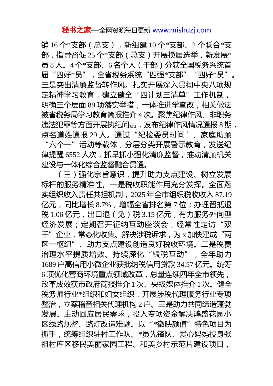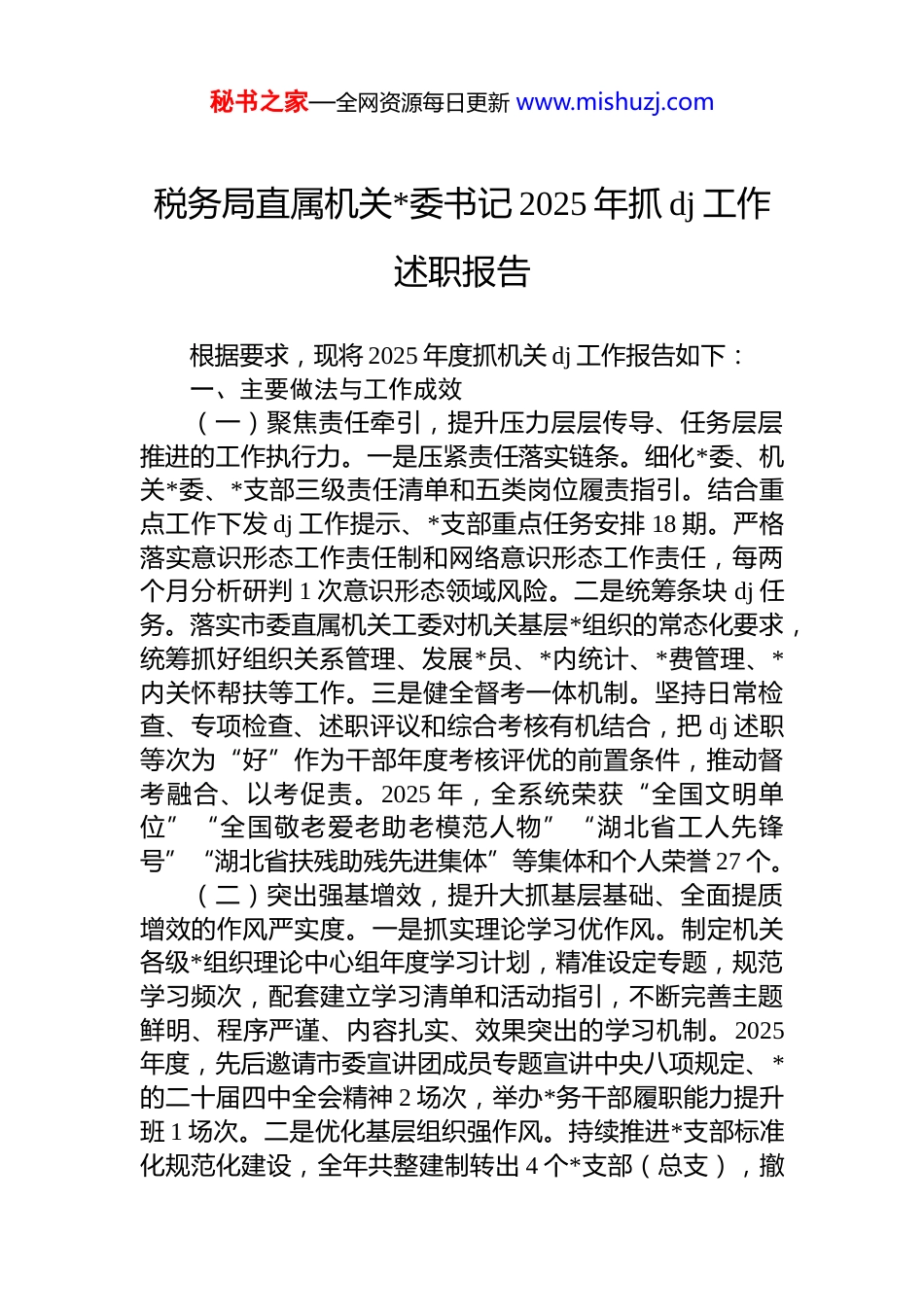 秘书之家—全网资源每日更新 www.mishuzj.com税务局直属机关*委书记 2025 年抓 dj 工作述职报告根据要求,现将 2025 年度抓机关 dj 工作报告如下:一、主要做法与工作成效(一)聚焦责任牵引,提升压力层层传导、任务层层推进的工作执行力。一是压紧责任落实链条。细化*委、机关*委、*支部三级责任清单和五类岗位履责指引。结合重点工作下发 dj 工作提示、*支部重点任务安排 18 期。严格落实意识形态工作责任制和网络意识形态工作责任,每两个月分析研判 1 次意识形态领域风险。二是统筹条块 dj 任务。落实市委直属机关工委对机关基层*组织的常态化要求,统筹抓好组织关系管理、发展*员、*内统计、*费管理、*内关怀帮扶等工作。三是健全督考一体机制。坚持日常检查、专项检查、述职评议和综合考核有机结合,把 dj 述职等次为“好”作为干部年度考核评优的前置条件,推动督考融合、以考促责。2025 年,全系统荣获“全国文明单位”“全国敬老爱老助老模范人物”“湖北省工人先锋号”“湖北省扶残助残先进集体”等集体和个人荣誉 27 个。(二)突出强基增效,提升大抓基层基础、全面提质增效的作风严实度。一是抓实理论学习优作风。制定机关各级*组织理论中心组年度学习计划,精准设定专题,规范学习频次,配套建立学习清单和活动指引,不断完善主题鲜明、程序严谨、内容扎实、效果突出的学习机制。2025年度,先后邀请市委宣讲团成员专题宣讲中央八项规定、*的二十届四中全会精神 2 场次,举办*务干部履职能力提升班 1 场次。二是优化基层组织强作风。持续推进*支部标准化规范化建设,全年共整建制转出 4 个*支部(总支),撤秘书之家—全网资源每日更新 www.mishuzj.com销 16 个*支部(总支),新组建 10 个*支部、2 个联合*支部,指导督促 25 个*支部(总支)开展换届选举,新发展*员 8 人。4 个*支部、6 名个人(干部)分获全国税务系统首届“四好*员”,全省税务系统“四强*支部”“四好*员”。三是突出清廉监督转作风。扎实开展深入贯彻中央八项规定精神学习教育,建立健全“四计划三清单”工作机制,明确三个层面 89 项落实举措,一体推进学查改,相关做法被省税务局学习教育简报推介 4 次。聚焦纪律作风、非职务违法犯罪等方面开展执纪问责,发布纪律作风情况通报 8 期,点名道姓通报 29 人。通过“纪检委员时间”、家庭助廉“六个一”活动等载体,分层分类开展警示教育,发送纪律提醒 6552 人次,抓早抓小强化清廉监督,推动清廉机关建设与一体化综合监督融合贯通。(三)强化宗旨意识,提升助力支点建设、树立发展标杆的服务精准性。一是税收职能作用充分发挥。全面落实组织收入责任共担机制,2025 年全市组织税收收入 87.19亿元,同比增长 8.7%,增幅全省排名第 7 位;办理留抵退税 1.06 亿元,出口退(免)税 3.15 亿元,有力服务外向型经济发展;定期召开征纳互动座谈会,经常性走访“双千”企业,常态化收集、解决涉税诉求,为 x 加快建成“两区一枢纽”、助力支点建设创造良好税收环境。二是税费治理水平提质增效。持续深化“银税互动”,全年助力1689 户高信用小微企业获批纳税信用贷款 34.57 亿元。统筹6 项优化营商环境重点领域改革,总量连续四年全市领先,改革成效获市政府简报推介 1 次、央级媒体推介 1 次。健全税务师行业*组织和妇女组织,开展涉税代理服务行业专项整治,立案稽查相关代理机构 2 户。三是助力共同缔造蓬勃发展。主动回应居民需求,投入专项资金解决鸿盛花园小区线路规整、路灯改造难题。以“*徽映颜值”特色项目为抓手,统筹组织驻村工作队、*员先锋队、爱心妈妈投身张祖村库区移民美丽家园工程、和美乡村示范片建设项目,秘书之家—全网资源每日更新 www.mishuzj.com接纳 32 名务工务农家庭子女开办爱心托管班,有效破解结对村“托管难”问题。二、存在的主要问题及原因(一)理论学习与税务实践的转化机制不够畅通。部分*员理论学习停留在表面,精准破解税收改革发展难题的能力尚需提升。深究原因在于学用结合的机制不够健全,理论学习成果向实际工作能力转化的...