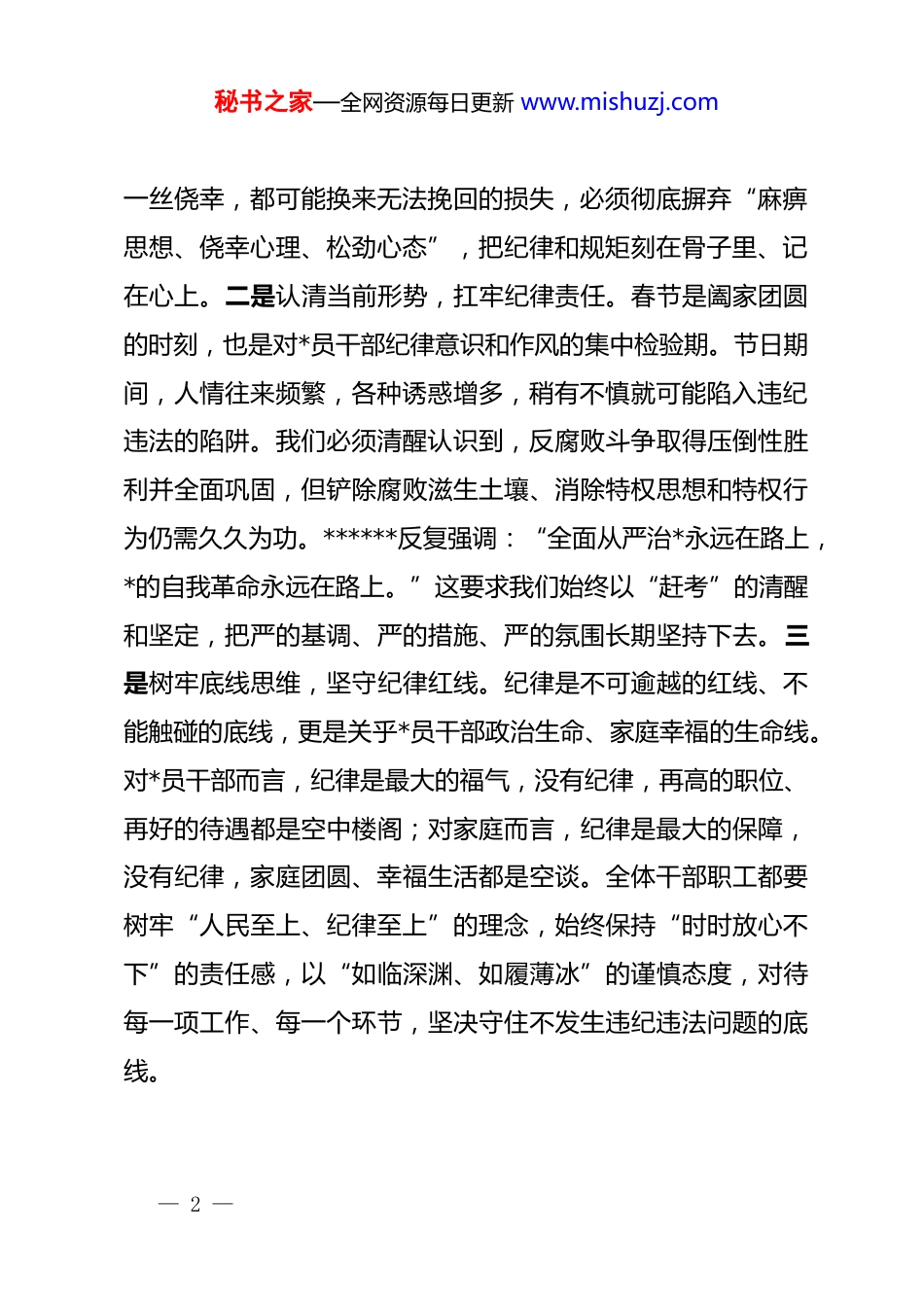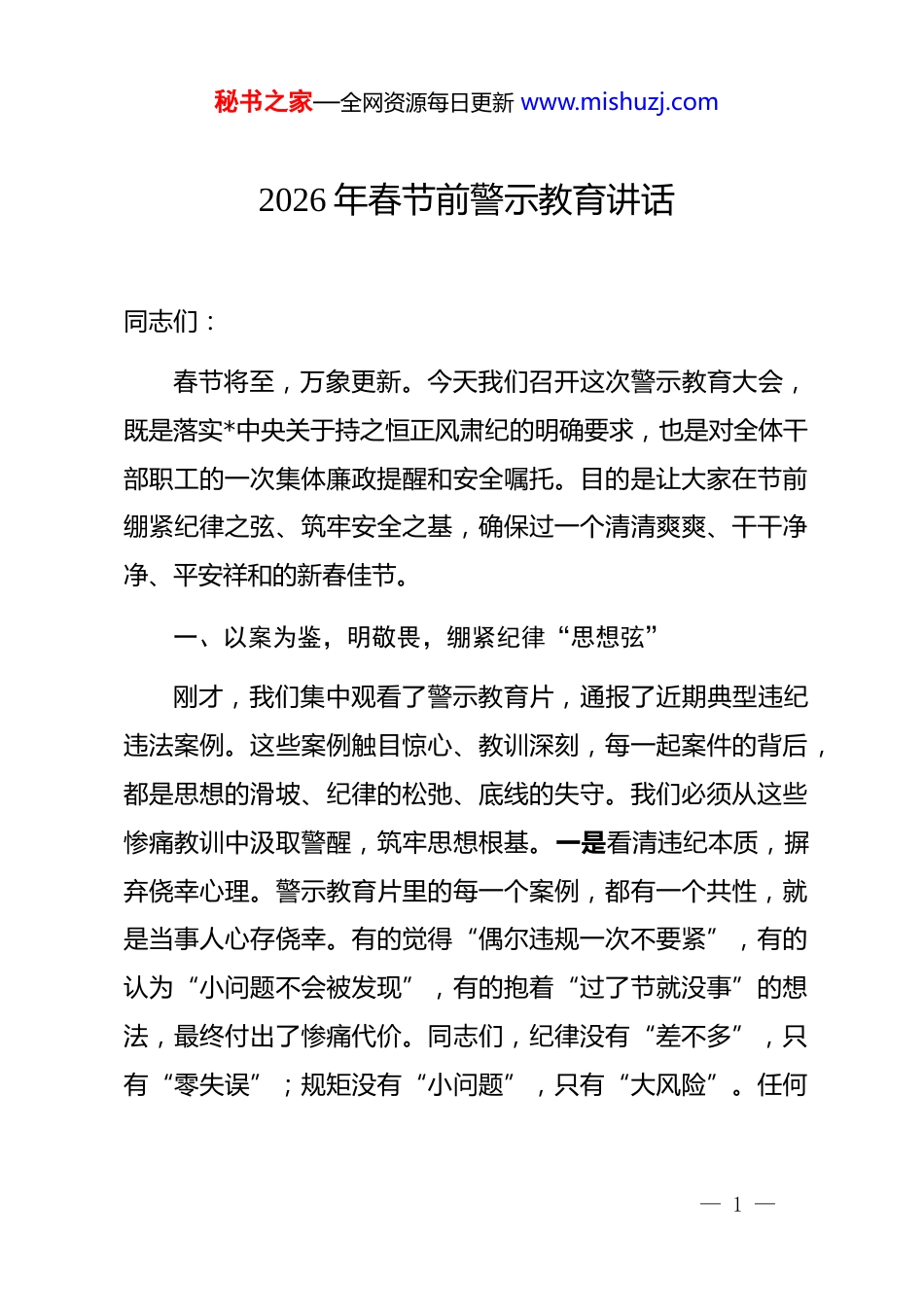 秘书之家—全网资源每日更新 www.mishuzj.com2026 年春节前警示教育讲话同志们:春节将至,万象更新。今天我们召开这次警示教育大会,既是落实*中央关于持之恒正风肃纪的明确要求,也是对全体干部职工的一次集体廉政提醒和安全嘱托。目的是让大家在节前绷紧纪律之弦、筑牢安全之基,确保过一个清清爽爽、干干净净、平安祥和的新春佳节。一、以案为鉴,明敬畏,绷紧纪律“思想弦”刚才,我们集中观看了警示教育片,通报了近期典型违纪违法案例。这些案例触目惊心、教训深刻,每一起案件的背后,都是思想的滑坡、纪律的松弛、底线的失守。我们必须从这些惨痛教训中汲取警醒,筑牢思想根基。一是看清违纪本质,摒弃侥幸心理。警示教育片里的每一个案例,都有一个共性,就是当事人心存侥幸。有的觉得“偶尔违规一次不要紧”,有的认为“小问题不会被发现”,有的抱着“过了节就没事”的想法,最终付出了惨痛代价。同志们,纪律没有“差不多”,只有“零失误”;规矩没有“小问题”,只有“大风险”。任何— 1 —秘书之家—全网资源每日更新 www.mishuzj.com一丝侥幸,都可能换来无法挽回的损失,必须彻底摒弃“麻痹思想、侥幸心理、松劲心态”,把纪律和规矩刻在骨子里、记在心上。二是认清当前形势,扛牢纪律责任。春节是阖家团圆的时刻,也是对*员干部纪律意识和作风的集中检验期。节日期间,人情往来频繁,各种诱惑增多,稍有不慎就可能陷入违纪违法的陷阱。我们必须清醒认识到,反腐败斗争取得压倒性胜利并全面巩固,但铲除腐败滋生土壤、消除特权思想和特权行为仍需久久为功。******反复强调:“全面从严治*永远在路上,*的自我革命永远在路上。”这要求我们始终以“赶考”的清醒和坚定,把严的基调、严的措施、严的氛围长期坚持下去。三是树牢底线思维,坚守纪律红线。纪律是不可逾越的红线、不能触碰的底线,更是关乎*员干部政治生命、家庭幸福的生命线。对*员干部而言,纪律是最大的福气,没有纪律,再高的职位、再好的待遇都是空中楼阁;对家庭而言,纪律是最大的保障,没有纪律,家庭团圆、幸福生活都是空谈。全体干部职工都要树牢“人民至上、纪律至上”的理念,始终保持“时时放心不下”的责任感,以“如临深渊、如履薄冰”的谨慎态度,对待每一项工作、每一个环节,坚决守住不发生违纪违法问题的底线。— 2 —秘书之家—全网资源每日更新 www.mishuzj.com二、聚焦重点,除隐患,筑牢安全“防护墙”春节前的安全工作,不能大水漫灌,必须精准滴灌;不能面面俱到,必须突出重点。我们要聚焦高风险领域、关键环节、薄弱点位,靶向发力、精准施策,把隐患消除在萌芽状态,把风险管控在未发之时。一是盯紧生产一线,守住作业安全关。生产一线是安全风险最集中的地方,必须盯紧看牢。要严控特殊作业风险,动火、高处、有限空间、临时用电等高风险作业,必须严格执行作业许可制度,做到“作业前有风险辨识、有安全交底,作业中有专人监护、有全程管控,作业后有现场清理、有复盘总结”,坚决杜绝无证作业、违规作业。要严控设备运行风险,对所有生产设备、特种设备开展一次全面“体检”,重点检查老旧设备、高负荷运转设备的运行状态,做好防冻、防凝、防滑、防漏电维护,及时更换老化部件、维修故障设备,坚决不让设备“带病运行”。要严控人员操作风险,加强现场作业监管,管理人员要下沉一线、跟班督导,及时纠正违章指挥、违章作业、违反劳动纪律的“三违”行为,对屡教不改的,要严肃处理、绝不姑息。二是抓实重点领域,织密风险防控网。结合单位实际,重点抓好消防安全、危化品安全、建筑施工安全、交通运输安全等重点领域安全管控。消防安全方面,全面— 3 —秘书之家—全网资源每日更新 www.mishuzj.com排查各办公场所、仓库、员工宿舍等场所,重点检查消防设施是否完好、电气线路是否老化、消防通道是否畅通、电动自行车是否违规停放充电,特别是节日期间值班值守、动火用电管理,要定人定岗定责,坚决防范火灾事故。危化品安全方面,涉及危化品储存、运输、使用的部门,要严格落实危化品全流程管控,做到分类存放、标识清晰、防护到位,强化重大危险源包保...