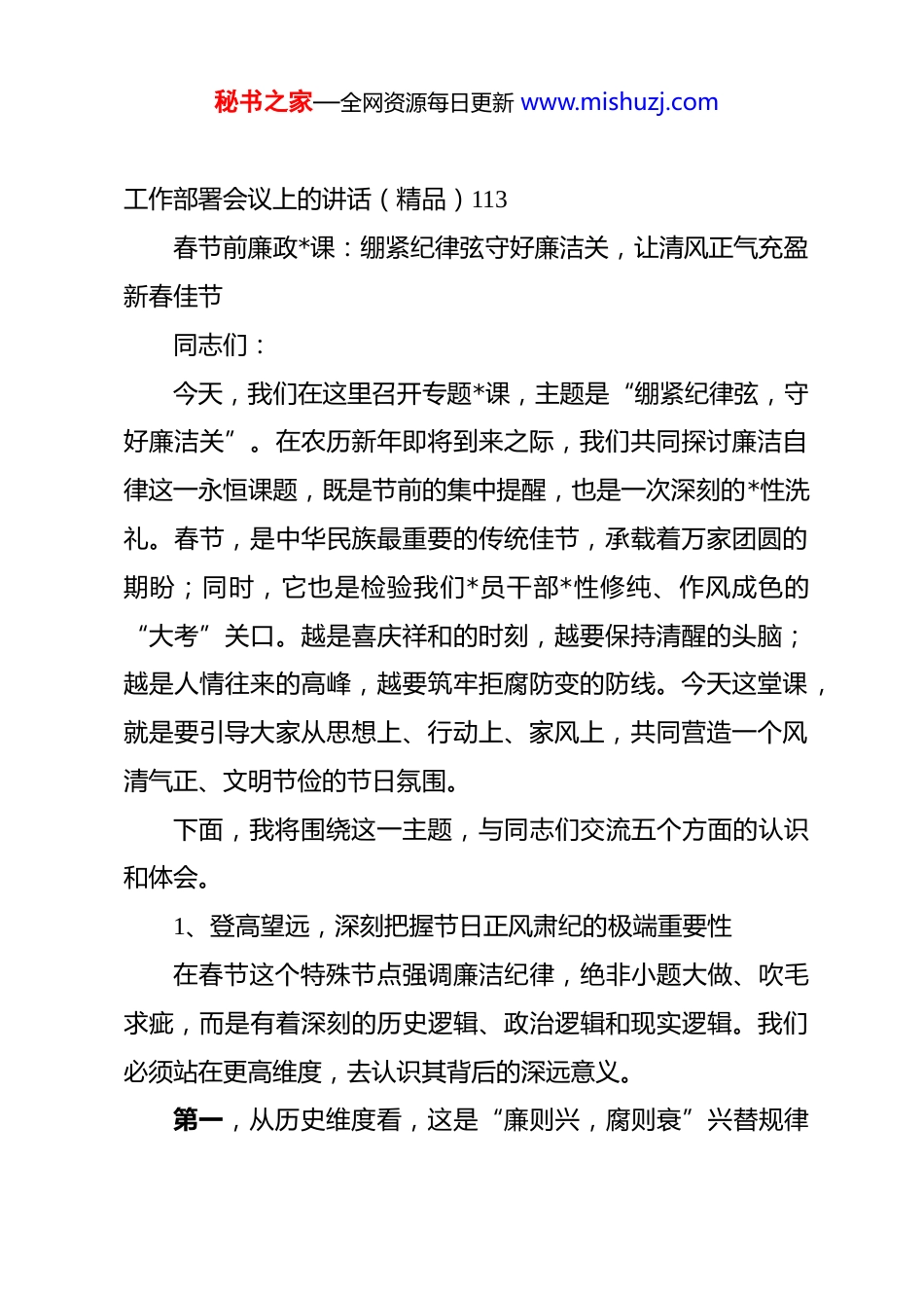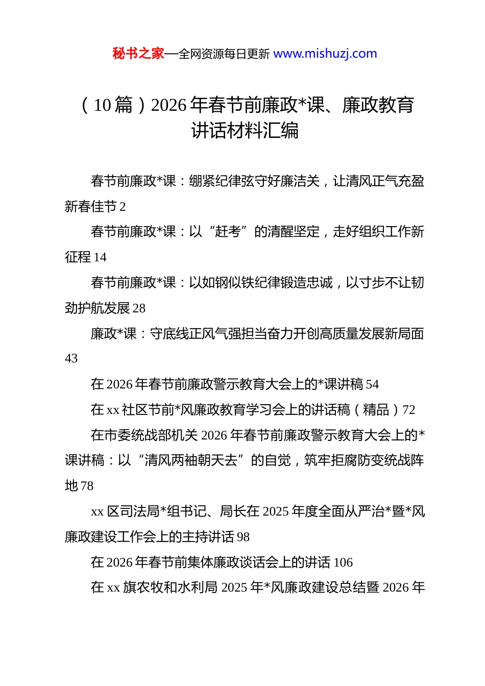 秘书之家—全网资源每日更新 www.mishuzj.com(10 篇)2026 年春节前廉政*课、廉政教育讲话材料汇编春节前廉政*课:绷紧纪律弦守好廉洁关,让清风正气充盈新春佳节 2春节前廉政*课:以“赶考”的清醒坚定,走好组织工作新征程 14春节前廉政*课:以如钢似铁纪律锻造忠诚,以寸步不让韧劲护航发展 28廉政*课:守底线正风气强担当奋力开创高质量发展新局面43在 2026 年春节前廉政警示教育大会上的*课讲稿 54在 xx 社区节前*风廉政教育学习会上的讲话稿(精品)72在市委统战部机关 2026 年春节前廉政警示教育大会上的*课讲稿:以“清风两袖朝天去”的自觉,筑牢拒腐防变统战阵地 78xx 区司法局*组书记、局长在 2025 年度全面从严治*暨*风廉政建设工作会上的主持讲话 98在 2026 年春节前集体廉政谈话会上的讲话 106在 xx 旗农牧和水利局 2025 年*风廉政建设总结暨 2026 年秘书之家—全网资源每日更新 www.mishuzj.com工作部署会议上的讲话(精品)113春节前廉政*课:绷紧纪律弦守好廉洁关,让清风正气充盈新春佳节同志们:今天,我们在这里召开专题*课,主题是“绷紧纪律弦,守好廉洁关”。在农历新年即将到来之际,我们共同探讨廉洁自律这一永恒课题,既是节前的集中提醒,也是一次深刻的*性洗礼。春节,是中华民族最重要的传统佳节,承载着万家团圆的期盼;同时,它也是检验我们*员干部*性修纯、作风成色的“大考”关口。越是喜庆祥和的时刻,越要保持清醒的头脑;越是人情往来的高峰,越要筑牢拒腐防变的防线。今天这堂课,就是要引导大家从思想上、行动上、家风上,共同营造一个风清气正、文明节俭的节日氛围。下面,我将围绕这一主题,与同志们交流五个方面的认识和体会。1、登高望远,深刻把握节日正风肃纪的极端重要性在春节这个特殊节点强调廉洁纪律,绝非小题大做、吹毛求疵,而是有着深刻的历史逻辑、政治逻辑和现实逻辑。我们必须站在更高维度,去认识其背后的深远意义。第一,从历史维度看,这是“廉则兴,腐则衰”兴替规律秘书之家—全网资源每日更新 www.mishuzj.com的深刻昭示。“奢靡之始,危亡之渐。”纵览中华五千年历史,从“历览前贤国与家,成由勤俭破由奢”的咏叹,到“清风两袖朝天去,免得闾阎话短长”的自勉,廉洁文化始终是中华优秀传统文化的精神内核。一部厚重的历史,反复印证着一个铁律:官吏清廉则政治清明、国家兴盛;反之,则纲纪废弛、社稷倾额。民间俗语“廉不廉,看过年”,更是以最朴素的方式道出了人民群众评判干部的标准。春节作为百节之首,其风气具有“风向标”意义,不仅关乎一地一时的形象,更潜移默化地影响着全年的政治生态。我们作为新时代的共产*人,必须从历史的兴衰成败中汲取智慧,深刻认识到廉洁自律不仅是个人修为,更是关系到*的事业兴衰、国家长治久安的“国之大者”第二,从政治维度看,这是检验全面从严治*成效的“前沿哨所”。*的二十大以来,以***同志为核心的*中央以前所未有的决心和力度推进全面从严治*,对持之以恒正风肃纪作出了一系列战略部署。中央八项规定已经成为改变中国政治生态的“金色名片”。然而,作风建设永远在路上,反腐败斗争形势依然严峻复杂。尤其是在春节期间,人情往来密集,走亲访友频繁,“四风”问题极易改头换面、潜入地下,披上“人情味”的外衣,穿上“土特产”的马甲,躲进“电子红包”的青纱帐。能否有效防范和纠治这些隐形变异问题,是对我们政治秘书之家—全网资源每日更新 www.mishuzj.com判断力、政治领悟力、政治执行力的直接检验,是检验 dj 学习教育成果是否入脑入心的重要标尺,更是衡量我们是否忠诚拥护“两个确立”、坚决做到“两个维护”的试金石。抓好春节期间的作风建设,就是以实际行动巩固全面从严治*的伟大成果。第三,从现实维度看,这是保护干部、关爱家庭的“暖心工程”。“堤溃蚁穴,气泄针芒。”大量的案例警示我们,许多领导干部的堕落轨迹,都是从节日期间收受一份“薄礼”、参加一次“盛情”的宴请开始的。起初可能只是觉得“盛情难却”“礼尚往来”,但一步步在温水煮青蛙式的“围猎”中放松了警惕、迷失了方向,最终滑向了违纪违...