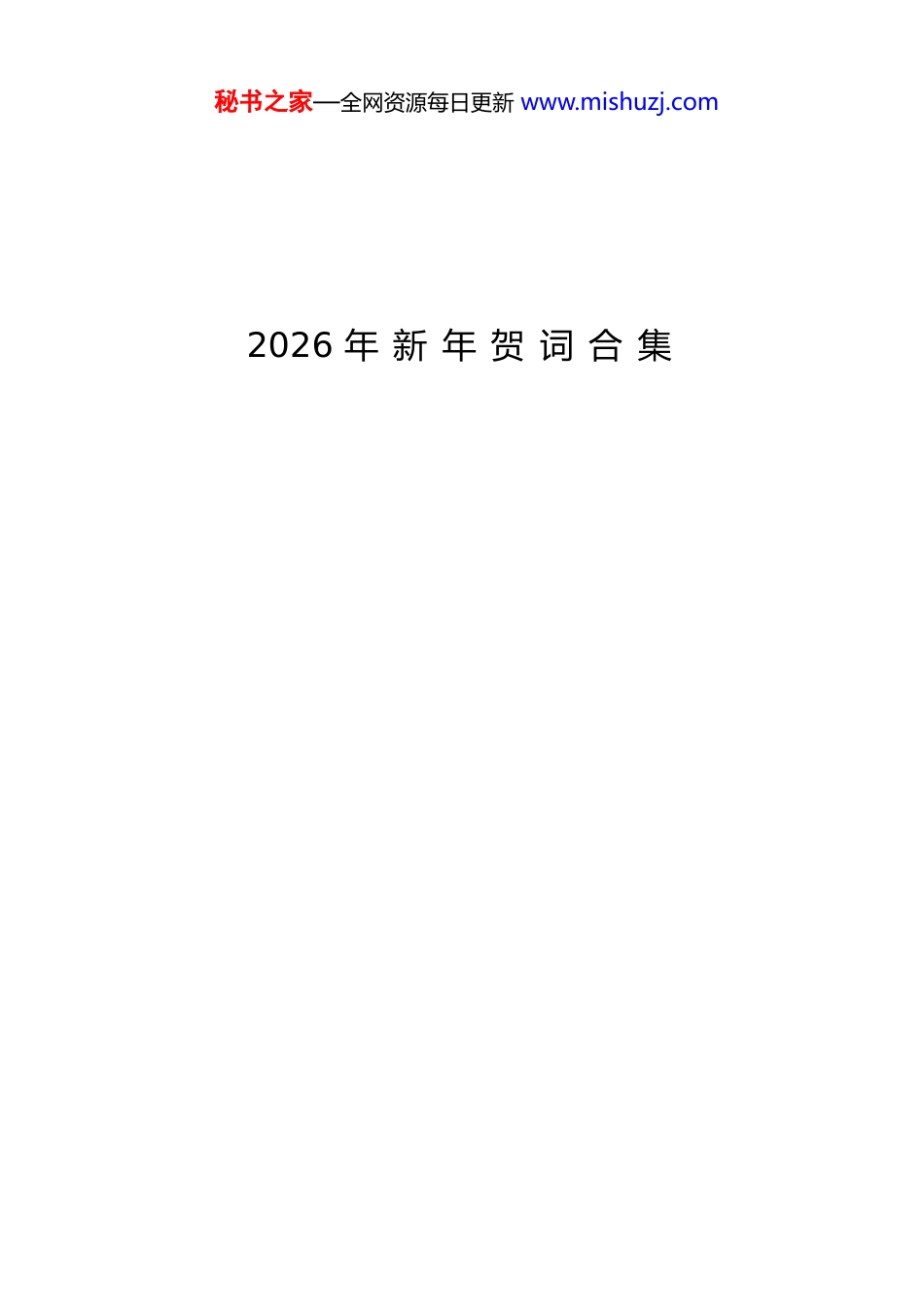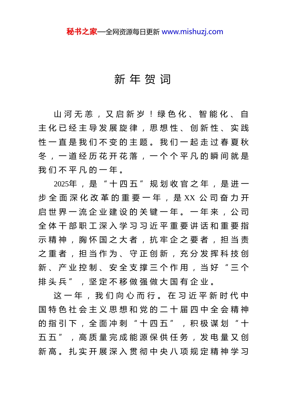 秘书之家—全网资源每日更新 www.mishuzj.com2026 年 新 年 贺 词 合 集秘书之家—全网资源每日更新 www.mishuzj.com新 年 贺 词山 河 无 恙 , 又 启 新 岁 ! 绿 色 化 、 智 能 化 、 自主 化 已 经 主 导 发 展 旋 律 , 思 想 性 、 创 新 性 、 实 践性 一 直 是 我 们 不 变 的 主 题 。 我 们 一 起 走 过 春 夏 秋冬 , 一 道 经 历 花 开 花 落 , 一 个 个 平 凡 的 瞬 间 就 是我 们 不 平 凡 的 一 年 。2025年 , 是 “ 十 四 五 ” 规 划 收 官 之 年 , 是 进 一步 全 面 深 化 改 革 的 重 要 一 年 , 是 XX 公 司 奋 力 开启 世 界 一 流 企 业 建 设 的 关 键 一 年 。 一 年 来 , 公 司全 体 干 部 职 工 深 入 学 习 习 近 平 重 要 讲 话 和 重 要 指示 精 神 , 胸 怀 国 之 大 者 , 抗 牢 企 之 要 者 , 担 当 责之 重 者 , 担 当 作 为 、 守 正 创 新 , 充 分 发 挥 科 技 创新 、 产 业 控 制 、 安 全 支 撑 三 个 作 用 , 当 好 “ 三 个排 头 兵 ” , 坚 定 不 移 做 强 做 大 国 有 企 业 。这 一 年 , 我 们 向 心 而 行 。 在 习 近 平 新 时 代 中国 特 色 社 会 主 义 思 想 和 党 的 二 十 届 四 中 全 会 精 神的 指 引 下 , 全 面 冲 刺 “ 十 四 五 ” , 积 极 谋 划 “ 十五 五 ” , 高 质 量 完 成 能 源 保 供 任 务 , 发 电 量 又 创新 高 。 扎 实 开 展 深 入 贯 彻 中 央 八 项 规 定 精 神 学 习秘书之家—全网资源每日更新 www.mishuzj.com教 育 , 坚 持 融 入 日 常 、 抓 在 经 常 , 提 振 了 精 气 神 、锤 炼 了 好 作 风 。 全 力 配 合 做 好 国 资 委 党 委 巡 视 ,抓 紧 抓 实 巡 视 整 改 , 做 好 巡 视 “ 后 半 篇 文 章 ” 。开 展 党 建 价 值 提 升 工 程 , 大 力 开 展 基 层 党 组 织 标准 化 规 范 化 建 设 , 开 展 “ 揭 榜 挂 帅 ” 和 “ 创 先 争优 ” 专 项 行 动 , 支 部 战 斗 堡 垒 作 用 和 党 员 先 锋 模范 作 用 有 效 发 挥 。 持 续 强 化 政 治 巡 察 , 完 成 对XX 家 基 层 党 组 织 的 常 规 巡 察 , 对 整 改 落 实 情 况开 展 了 “ 回 头 看 ” ; 持 续 加 强 廉 洁 文 化 建 设 , 开展 廉 洁 文 化 建 设 宣 传 月 暨 廉 洁 文 化 “ 四 进 ” 系 列活 动 , 通 过 10 项 专 题 活 动 持 续 推 动 廉 洁 理 念 深 入人 心 。这 一 年 , 我 们 向 智 而 行 。 做 智 能 化 建 设 的 引领 者 , 把 智 能 化 作 为 驱 动 高 质 量 发 展 的 “ 核 心 引擎 ” , 在 工 业 软 件 、 工 业 互 联 网 平 台 、 AI 大 模 型等 关 键 领 域 实 现 “ 国 产 化 替 代 ” 和 自 主 可 控 。 在XX 省 率 先 打 造 第 一 个 “ 黑 灯 工 厂 ” , 建 立 全 流程 、 智 能 化 标 杆 体 系 , 实 现 跨 设 备 、 跨 系 统 、 跨企 业 的 数 据 互 通 与 协 同 优 化 。 构 建 生 产 运 营 “ 智慧 大 脑 ” 中 枢 , 实 现 运 营 全 过 程 的 实 时 感 知 、 动态 分 析 和 科 学 智 慧 。 牵 头 搭 建 行 业 级 产 业 互 联 网平 台 , 带 动 上 下 游 中 小 企 业 “ 上 云 用 数 赋 智 ” 。秘书之家—全网资源每日更新 www.mishuzj.com我 们 ...