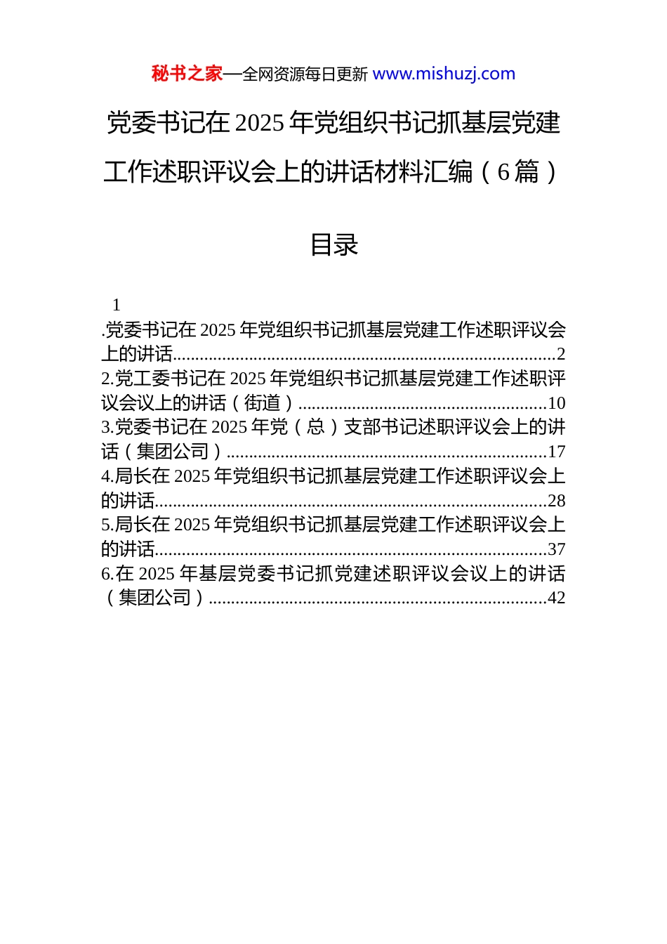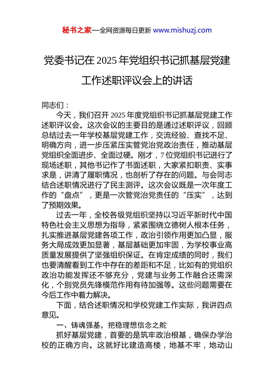 秘书之家—全网资源每日更新 www.mishuzj.com党委书记在 2025 年党组织书记抓基层党建工作述职评议会上的讲话材料汇编(6 篇)目录1.党委书记在 2025 年党组织书记抓基层党建工作述职评议会上的讲话.....................................................................................22.党工委书记在 2025 年党组织书记抓基层党建工作述职评议会议上的讲话(街道).......................................................103.党委书记在 2025 年党(总)支部书记述职评议会上的讲话(集团公司).......................................................................174.局长在 2025 年党组织书记抓基层党建工作述职评议会上的讲话.......................................................................................285.局长在 2025 年党组织书记抓基层党建工作述职评议会上的讲话.......................................................................................376.在 2025 年基层党委书记抓党建述职评议会议上的讲话(集团公司)...........................................................................42秘书之家—全网资源每日更新 www.mishuzj.com党委书记在 2025 年党组织书记抓基层党建工作述职评议会上的讲话同志们:今天,我们召开 2025 年度党组织书记抓基层党建工作述职评议会。这次会议的主要目的是通过述职评议,回顾总结过去一年学校基层党建工作,交流经验、查找不足、明确方向,进一步压紧压实管党治党政治责任,推动基层党组织全面进步、全面过硬。刚才,7 位党组织书记进行了现场述职,其他书记作了书面述职,大家紧扣职责、实事求是,讲清了履职情况,也剖析了存在的问题。与会同志结合述职情况进行了民主测评。这次会议既是一次年度工作的“盘点”,更是一次管党治党责任的“压实”,达到了预期效果。过去一年,全校各级党组织坚持以习近平新时代中国特色社会主义思想为指导,紧紧围绕立德树人根本任务,扎实推进基层党建各项工作,政治引领作用更加凸显,服务大局成效更加显著,基层基础更加牢固,为学校事业高质量发展提供了坚强组织保证。在肯定成绩的同时,我们也要清醒看到工作中存在的差距和不足,比如有的党组织政治功能发挥还不够充分,党建与业务工作融合还需深化,个别党员先锋模范作用有待加强等。这些问题需要在今后工作中着力解决。下面,结合述职情况和学校党建工作实际,我讲四点意见。一、铸魂强基,把稳理想信念之舵抓好基层党建,首要的是筑牢政治根基,确保办学治校的正确方向。这就好比建造高楼,地基不牢,地动山秘书之家—全网资源每日更新 www.mishuzj.com摇;信仰不坚,方向必偏。我们必须把政治建设摆在首位,让忠诚核心、拥戴核心、维护核心、捍卫核心成为全校党员干部最鲜明的政治品格。(一)要深化理论武装,补足精神之钙。政治上的坚定,源于理论上的清醒。要持续巩固拓展主题教育成果,建立健全“第一议题”制度,及时跟进学习党的创新理论最新成果,特别是习近平总书记关于教育、科技、人才的重要论述。学习不能停留在读报纸、念文件上,要像“秤砣”一样沉下去,深入课堂、深入宿舍、深入师生,在调研中理解,在交流中升华,把“基本原理”变成“生动道理”,引导广大师生深刻领悟“两个确立”的决定性意义,增强“四个意识”、坚定“四个自信”、做到“两个维护”。要创新学习方式,运用好“学习强国”等平台,开展沉浸式、互动式学习,让理论灌输更有温度、思想引领更有力度。(二)要严守政治规矩,恪守忠诚之本。高校是意识形态斗争的前沿阵地,必须把严守政治纪律和政治规矩作为生命线。要严格执行新形势下党内政治生活若干准则,提高“三会一课”质量,用好批评和自我批评武器,增强党内政治生活的政治性、时代性、原则性、战斗性。这就像人体的免疫系统,经常“红脸出汗”,才能“排毒杀菌”,保持肌体健康。要加强对课堂教学、论坛讲座、网络平台等阵地的管理,绝不给错误思想言论提供传播渠道。要教育引导党员干部自觉在思想上政治上行动上同以习近平...