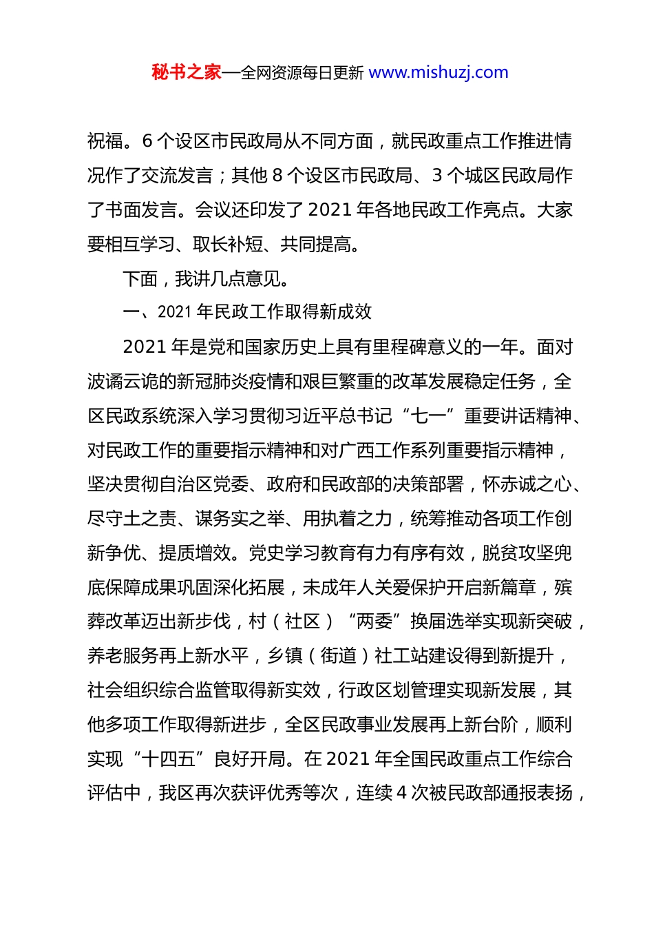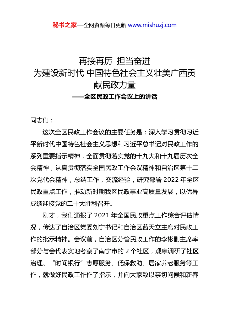 秘书之家—全网资源每日更新 www.mishuzj.com再接再厉 担当奋进为建设新时代 中国特色社会主义壮美广西贡献民政力量——全区民政工作会议上的讲话同志们:这次全区民政工作会议的主要任务是:深入学习贯彻习近平新时代中国特色社会主义思想和习近平总书记对民政工作的系列重要指示精神,全面贯彻落实党的十九大和十九届历次全会精神,认真贯彻落实全国民政工作会议精神和自治区第十二次党代会精神,总结工作,交流经验,研究部署 2022 年全区民政重点工作,推动新时期我区民政事业高质量发展,以优异成绩迎接党的二十大胜利召开。刚才,我们通报了 2021 年全国民政重点工作综合评估情况,传达了自治区党委刘宁书记和自治区蓝天立主席对民政工作的批示精神。会议前,自治区分管民政工作的李彬副主席率部分与会代表实地考察了南宁市的 2 个社区,观摩调研了社区治理、“时间银行”志愿服务、低保救助、居家养老服务等工作,就做好民政工作作了指示,并向大家致以亲切问候和新春秘书之家—全网资源每日更新 www.mishuzj.com祝福。6 个设区市民政局从不同方面,就民政重点工作推进情况作了交流发言;其他 8 个设区市民政局、3 个城区民政局作了书面发言。会议还印发了 2021 年各地民政工作亮点。大家要相互学习、取长补短、共同提高。下面,我讲几点意见。一、2021 年民政工作取得新成效2021 年是党和国家历史上具有里程碑意义的一年。面对波谲云诡的新冠肺炎疫情和艰巨繁重的改革发展稳定任务,全区民政系统深入学习贯彻习近平总书记“七一”重要讲话精神、对民政工作的重要指示精神和对广西工作系列重要指示精神,坚决贯彻自治区党委、政府和民政部的决策部署,怀赤诚之心、尽守土之责、谋务实之举、用执着之力,统筹推动各项工作创新争优、提质增效。党史学习教育有力有序有效,脱贫攻坚兜底保障成果巩固深化拓展,未成年人关爱保护开启新篇章,殡葬改革迈出新步伐,村(社区)“两委”换届选举实现新突破,养老服务再上新水平,乡镇(街道)社工站建设得到新提升,社会组织综合监管取得新实效,行政区划管理实现新发展,其他多项工作取得新进步,全区民政事业发展再上新台阶,顺利实现“十四五”良好开局。在 2021 年全国民政重点工作综合评估中,我区再次获评优秀等次,连续 4 次被民政部通报表扬,秘书之家—全网资源每日更新 www.mishuzj.com得到了刘宁书记和蓝天立主席的批示肯定。过去一年,我们重点抓了以下工作:(一)社会救助兜底保障精准有力,巩固了脱贫攻坚的胜利成果。扎实推进巩固拓展脱贫攻坚兜底保障成果同乡村振兴有效衔接,保持社会救助政策的连续性、稳定性并适当调整优化,建成覆盖 329 万低收入人口的动态监测信息平台,完善数据比对和监测预警机制,落实“按户施保”和“按人施保”相结合的救助政策,全区 634 万脱贫人口和 44.64 万防止返贫监测对象中,分别有 145 万和 30.1 万纳入低保或特困救助供养范围,守住了不发生大规模返贫的底线。全年共筹集并发放民政专项资金 138 亿多元,其中困难群众基本生活救助补助资金123.4 亿元,将 277.4 万人纳入低保、25 万人纳入特困救助供养,实施临时救助 57.3 万人次,为 39.8 万人发放边民生活补助,兜牢了困难群众基本生活安全网。建立健全城镇困难群众常态化救助帮扶机制,兜紧了基本生活、基本医疗、教育救助等 6 条保障线,城镇困难群众脱困解困工作得到了蓝天立主席的批示肯定。各地注重深化改革创新,进一步提升救助服务的准度和温度。南宁市积极探索居住地申办低保等社会救助改革,获评“2021 年度社会救助领域创新实践优秀案例”。来宾市创新村(居)务监督委员会参与社会救助监督试点,推动秘书之家—全网资源每日更新 www.mishuzj.com救助更精准。崇左市严格把好低收入人口核对管理“三道关口”,实现进出更有序。(二)特殊群体关爱帮扶扎实有效,夯实了全面小康的底盘。提升儿童福利保障能力,覆盖范围延伸至年满 18 周岁仍在义务教育或高中阶段就读的孤儿和事实无人抚养儿童。加快儿童福利机构优化提质和创新转型。建立孤儿基本生活最低养育标准...