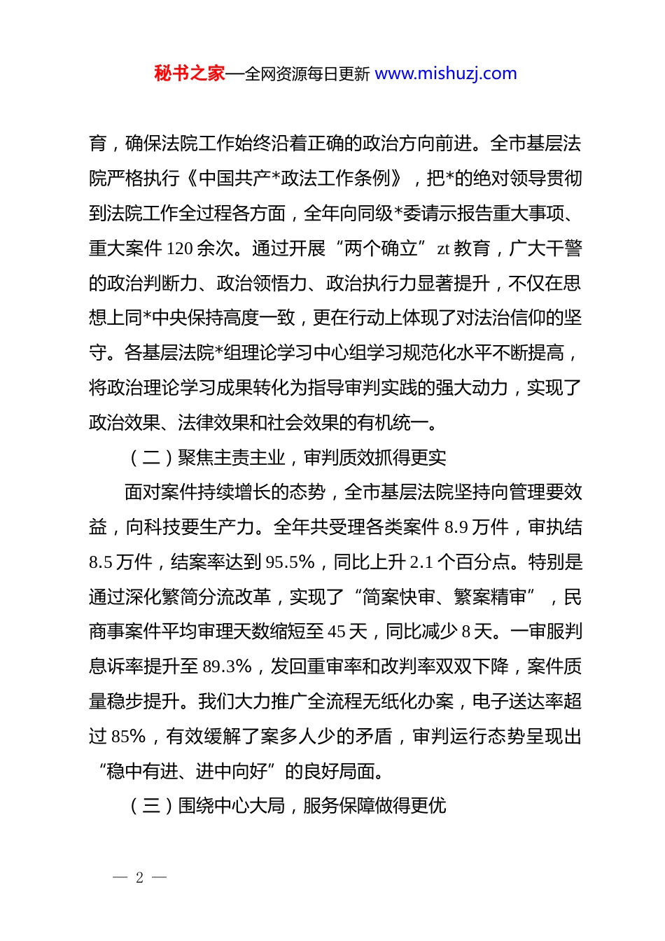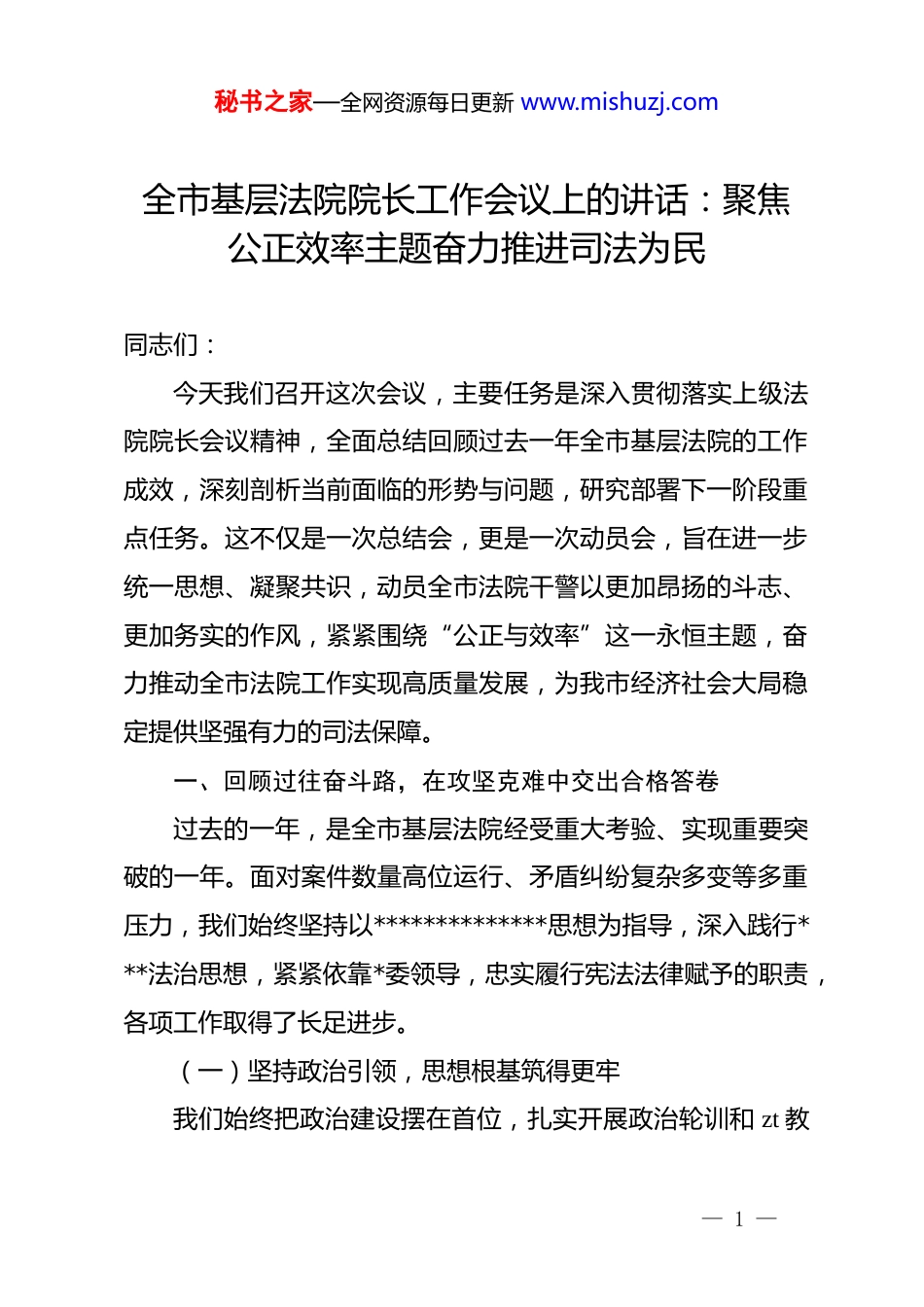 秘书之家—全网资源每日更新 www.mishuzj.com全市基层法院院长工作会议上的讲话:聚焦公正效率主题奋力推进司法为民同志们:今天我们召开这次会议,主要任务是深入贯彻落实上级法院院长会议精神,全面总结回顾过去一年全市基层法院的工作成效,深刻剖析当前面临的形势与问题,研究部署下一阶段重点任务。这不仅是一次总结会,更是一次动员会,旨在进一步统一思想、凝聚共识,动员全市法院干警以更加昂扬的斗志、更加务实的作风,紧紧围绕“公正与效率”这一永恒主题,奋力推动全市法院工作实现高质量发展,为我市经济社会大局稳定提供坚强有力的司法保障。一、回顾过往奋斗路,在攻坚克难中交出合格答卷过去的一年,是全市基层法院经受重大考验、实现重要突破的一年。面对案件数量高位运行、矛盾纠纷复杂多变等多重压力,我们始终坚持以**************思想为指导,深入践行***法治思想,紧紧依靠*委领导,忠实履行宪法法律赋予的职责,各项工作取得了长足进步。(一)坚持政治引领,思想根基筑得更牢我们始终把政治建设摆在首位,扎实开展政治轮训和 zt 教— 1 —秘书之家—全网资源每日更新 www.mishuzj.com育,确保法院工作始终沿着正确的政治方向前进。全市基层法院严格执行《中国共产*政法工作条例》,把*的绝对领导贯彻到法院工作全过程各方面,全年向同级*委请示报告重大事项、重大案件 120 余次。通过开展“两个确立”zt 教育,广大干警的政治判断力、政治领悟力、政治执行力显著提升,不仅在思想上同*中央保持高度一致,更在行动上体现了对法治信仰的坚守。各基层法院*组理论学习中心组学习规范化水平不断提高,将政治理论学习成果转化为指导审判实践的强大动力,实现了政治效果、法律效果和社会效果的有机统一。(二)聚焦主责主业,审判质效抓得更实面对案件持续增长的态势,全市基层法院坚持向管理要效益,向科技要生产力。全年共受理各类案件 8.9 万件,审执结8.5 万件,结案率达到 95.5%,同比上升 2.1 个百分点。特别是通过深化繁简分流改革,实现了“简案快审、繁案精审”,民商事案件平均审理天数缩短至 45 天,同比减少 8 天。一审服判息诉率提升至 89.3%,发回重审率和改判率双双下降,案件质量稳步提升。我们大力推广全流程无纸化办案,电子送达率超过 85%,有效缓解了案多人少的矛盾,审判运行态势呈现出“稳中有进、进中向好”的良好局面。(三)围绕中心大局,服务保障做得更优— 2 —秘书之家—全网资源每日更新 www.mishuzj.com我们自觉将法院工作置于全市发展大局中谋划推进。在优化营商环境方面,出台了《关于为民营经济发展提供司法服务和保障的意见》,妥善审理涉企纠纷 2.3 万件,涉案金额达 150亿元。特别是对陷入困境但具有挽救价值的企业,积极适用破产重整程序,成功帮助 5 家重点企业“涅槃重生”,盘活资产近 8 亿元。在维护社会稳定方面,严厉打击各类刑事犯罪,全年审结刑事案件 3200 余件,常态化开展扫黑除恶斗争,坚决维护国家安全和社会安定。同时,积极参与社会治理,发出的司法建议反馈率达到 92%,为*委政府科学决策提供了有力参考。(四)践行司法为民,群众实惠落得更多始终坚持以人民为中心的发展思想,着力解决人民群众在司法领域的急难愁盼问题。深化“一站式”多元解纷和诉讼服务体系建设,全市基层法院诉讼服务中心全面升级,实现了“走进一个厅,事务全办清”。大力推进诉源治理,坚持和发展新时代“枫桥经验”,将调解工作关口前移,诉前调解成功率达到 42%。在执行攻坚方面,开展了“涉民生案件专项执行行动”,全年执行到位金额 35 亿元,发放司法救助金 450 万元,有效兑现了胜诉当事人的合法权益,让人民群众切实感受到了司法的温度。二、找准当下短板处,在自我剖析中保持清醒头脑— 3 —秘书之家—全网资源每日更新 www.mishuzj.com在肯定成绩的同时,我们必须保持清醒的头脑,正视存在的问题和不足。对照人民群众的新期待,对照高质量发展的要求,我们的工作还存在一些不容忽视的短板和弱项。(一)审判理念转变还不到位部分干警机械办案、就案办案的思维惯性依然存在。在...