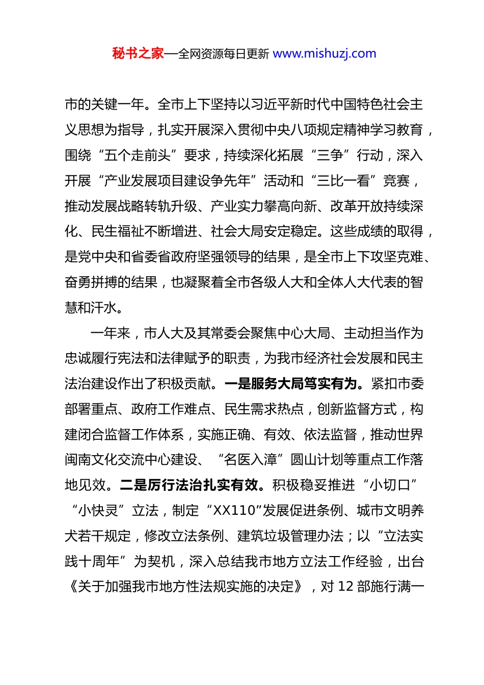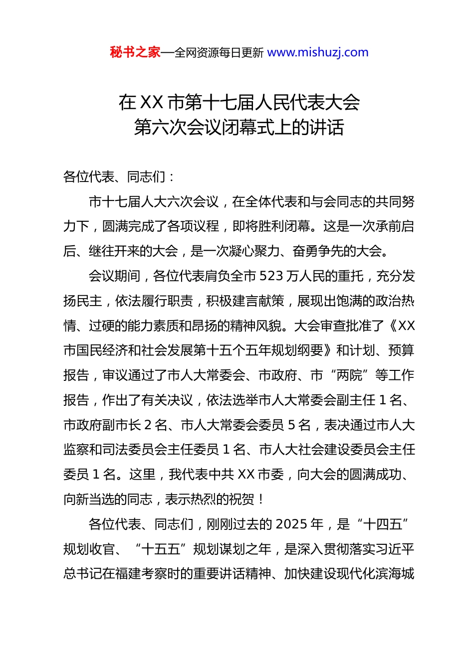 秘书之家—全网资源每日更新 www.mishuzj.com在 XX 市第十七届人民代表大会第六次会议闭幕式上的讲话各位代表、同志们:市十七届人大六次会议,在全体代表和与会同志的共同努力下,圆满完成了各项议程,即将胜利闭幕。这是一次承前启后、继往开来的大会,是一次凝心聚力、奋勇争先的大会。会议期间,各位代表肩负全市 523 万人民的重托,充分发扬民主,依法履行职责,积极建言献策,展现出饱满的政治热情、过硬的能力素质和昂扬的精神风貌。大会审查批准了《XX市国民经济和社会发展第十五个五年规划纲要》和计划、预算报告,审议通过了市人大常委会、市政府、市“两院”等工作报告,作出了有关决议,依法选举市人大常委会副主任 1 名、市政府副市长 2 名、市人大常委会委员 5 名,表决通过市人大监察和司法委员会主任委员 1 名、市人大社会建设委员会主任委员 1 名。这里,我代表中共 XX 市委,向大会的圆满成功、向新当选的同志,表示热烈的祝贺!各位代表、同志们,刚刚过去的 2025 年,是“十四五”规划收官、“十五五”规划谋划之年,是深入贯彻落实习近平总书记在福建考察时的重要讲话精神、加快建设现代化滨海城秘书之家—全网资源每日更新 www.mishuzj.com市的关键一年。全市上下坚持以习近平新时代中国特色社会主义思想为指导,扎实开展深入贯彻中央八项规定精神学习教育,围绕“五个走前头”要求,持续深化拓展“三争”行动,深入开展“产业发展项目建设争先年”活动和“三比一看”竞赛,推动发展战略转轨升级、产业实力攀高向新、改革开放持续深化、民生福祉不断增进、社会大局安定稳定。这些成绩的取得,是党中央和省委省政府坚强领导的结果,是全市上下攻坚克难、奋勇拼搏的结果,也凝聚着全市各级人大和全体人大代表的智慧和汗水。一年来,市人大及其常委会聚焦中心大局、主动担当作为忠诚履行宪法和法律赋予的职责,为我市经济社会发展和民主法治建设作出了积极贡献。一是服务大局笃实有为。紧扣市委部署重点、政府工作难点、民生需求热点,创新监督方式,构建闭合监督工作体系,实施正确、有效、依法监督,推动世界闽南文化交流中心建设、“名医入漳”圆山计划等重点工作落地见效。二是厉行法治扎实有效。积极稳妥推进“小切口”“小快灵”立法,制定“XX110”发展促进条例、城市文明养犬若干规定,修改立法条例、建筑垃圾管理办法;以“立法实践十周年”为契机,深入总结我市地方立法工作经验,出台《关于加强我市地方性法规实施的决定》,对 12 部施行满一秘书之家—全网资源每日更新 www.mishuzj.com年的地方性法规集中开展“回头看”,做到立良法、促发展、保善治。三是为民履职务实有方。坚持把全过程人民民主理念融入人大工作各环节,深化落实“双联”制度,持续加强和改进代表工作,督促生命公园建设管理规范提升,推动“非世遗”土楼确权登记,助力补齐“民生六位”等短板弱项,努力做到“民有所呼、我有所应”。四是自身建设严实有力。强化党建引领,完善制度规范,开展“干部队伍建设提升年”和“人大代表提能力促履职”活动,全面加强人大“一机关两队伍”建设,展现了人大良好形象。市委对市人大常委会和各位人大代表一年来的工作,是满意的、是充分肯定的。各位代表、同志们,2026 年是开局“十五五”、奋进新征程的“新起点”,是谱写新篇章、再上新台阶的“再出发”。希望全市各级人大及其常委会坚持以习近平新时代中国特色社会主义思想为指导,深入贯彻党的二十大和二十届历次全会精神,按照党中央和省委省政府部署要求,围绕市委十二届十次全会、市委经济工作会议部署以及本次会议确定的目标任务,锐意进取、接续奋斗,把人民代表大会制度优势更好转化为 XX高质量发展的强大动能,为加快建设现代化滨海城市作出新的更大贡献。第一,强化政治引领,在把牢正确方向上彰显更高站位。秘书之家—全网资源每日更新 www.mishuzj.com坚持党的领导是人民代表大会制度的本质特征和最大优势。全市各级人大及其常委会要把坚持党的全面领导贯穿人大工作全过程、各方面,确保人大工作始终沿着正确方向前进。思想上要同心同向。坚持不...