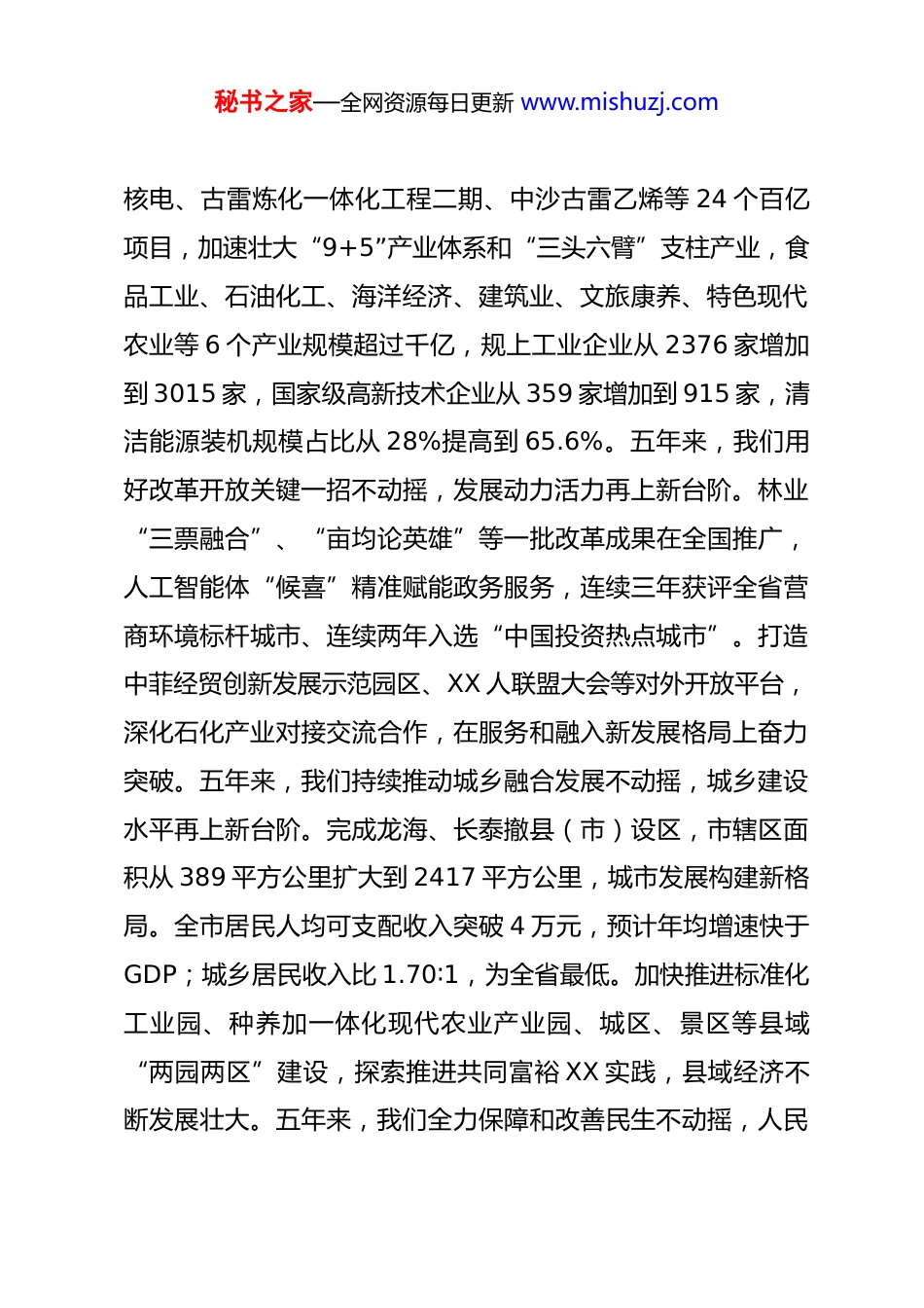 秘书之家—全网资源每日更新 www.mishuzj.com在政协第十四届 XX 市委员会第五次会议上的讲话各位委员、同志们:齐心共绘新蓝图,协力同启新征程。今天,政协第十四届XX 市委员会第五次会议隆重开幕了,这是在全市上下深入学习贯彻党的二十届四中全会精神、奋力推动“十五五”开局争优的重要节点上召开的一次盛会,是全市人民政治生活中的一件大事。在此,我代表中共 XX 市委,对大会的胜利召开表示热烈的祝贺!向出席会议的各位委员、同志们致以诚挚的问候!刚刚过去的 2025 年,是“十四五”规划收官之年。过去五年,我们坚持一年跨一步、年年有进步,实现了五年上台阶的奋斗目标。五年来,我们锚定建设现代化滨海城市不动摇,综合实力再上新台阶。全市地区生产总值连续跨越 5 千亿元、6 千亿元两个量级,地区生产总值、固定资产投资、规模以上工业增加值、金融机构本外币贷款余额年均增速可望排名全省前列,人均地区生产总值从 2020 年的 9.07 万元预计提高到2025 年的 12 万元以上。五年来,我们扭住产业发展项目建设不动摇,现代化产业体系再上新台阶。接续开展产业发展项目建设年、攻坚年、提升年、增效年、争先年等活动,实施 XX秘书之家—全网资源每日更新 www.mishuzj.com核电、古雷炼化一体化工程二期、中沙古雷乙烯等 24 个百亿项目,加速壮大“9+5”产业体系和“三头六臂”支柱产业,食品工业、石油化工、海洋经济、建筑业、文旅康养、特色现代农业等 6 个产业规模超过千亿,规上工业企业从 2376 家增加到 3015 家,国家级高新技术企业从 359 家增加到 915 家,清洁能源装机规模占比从 28%提高到 65.6%。五年来,我们用好改革开放关键一招不动摇,发展动力活力再上新台阶。林业“三票融合”、“亩均论英雄”等一批改革成果在全国推广,人工智能体“候喜”精准赋能政务服务,连续三年获评全省营商环境标杆城市、连续两年入选“中国投资热点城市”。打造中菲经贸创新发展示范园区、XX 人联盟大会等对外开放平台,深化石化产业对接交流合作,在服务和融入新发展格局上奋力突破。五年来,我们持续推动城乡融合发展不动摇,城乡建设水平再上新台阶。完成龙海、长泰撤县(市)设区,市辖区面积从 389 平方公里扩大到 2417 平方公里,城市发展构建新格局。全市居民人均可支配收入突破 4 万元,预计年均增速快于GDP;城乡居民收入比 1.70∶1,为全省最低。加快推进标准化工业园、种养加一体化现代农业产业园、城区、景区等县域“两园两区”建设,探索推进共同富裕 XX 实践,县域经济不断发展壮大。五年来,我们全力保障和改善民生不动摇,人民秘书之家—全网资源每日更新 www.mishuzj.com生活品质再上新台阶。保持八成财力用于民生,支出从 2020年的 347.46 亿元稳步增加到 2025 年的 477.41 亿元,年均增长 6.6%,“民生六位”加快补强。全市主要流域国省控断面优良水质比例首次实现“双百”达标。传承弘扬新时代“XX110”先进事迹,群众安全感率连续 5 年保持 99%以上,连续四届蝉联全国文明城市,荣获全国双拥模范城“八连冠”。成绩源于深耕细作,突破来自拼搏进取。这些成绩的取得根本在于习近平总书记回到福建、亲临 XX 考察的教导指引,在于党中央和省委的坚强领导,在于全市上下同心同德、鼓足干劲、共同奋斗。这其中,饱含着各级政协组织、广大政协委员和社会各界人士的智慧、心血和汗水。全市各级政协组织、广大政协委员深入学习贯彻习近平总书记关于加强和改进人民政协工作的重要思想,牢牢把握团结和民主两大主题,主动融入中心工作,聚焦做大做强食品产业、推动民营经济高质量发展、加快世界闽南文化交流中心建设等方面的重点难点问题,认真履行政治协商、民主监督、参政议政职能,广泛凝聚共识,有力有效服务全市经济社会发展。市委对政协工作是满意的,是充分肯定的。在此,我代表中共 XX 市委,向全市各级政协组织和广大政协委员的辛勤付出,向各民主党派、工商联、无党派人士、人民团体和社会各界人士的大力支持,表示衷心的秘书之家—全网资源每日更新 www.mishuzj.com感谢!2026 年是“十五...