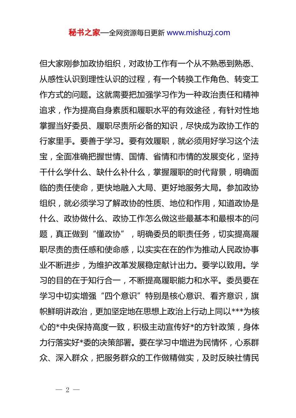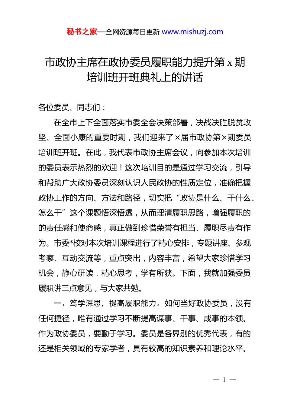 秘书之家—全网资源每日更新 www.mishuzj.com市政协主席在政协委员履职能力提升第 x 期培训班开班典礼上的讲话各位委员、同志们:在全市上下全面落实市委全会决策部署,决战决胜脱贫攻坚、全面小康的重要时期,我们迎来了×届市政协第×期委员培训班开班。在此,我代表市政协主席会议,向参加本次培训的委员表示热烈的欢迎!这次培训目的是通过学习交流,引导和帮助广大政协委员深刻认识人民政协的性质定位,准确把握政协工作的方向、方法和路径,切实把“政协是什么、干什么、怎么干”这个课题悟深悟透,从而理清履职思路,增强履职的的责任感和使命感,真正做到珍惜荣誉有担当、履职尽责有作为。市委*校对本次培训课程进行了精心安排,专题讲座、参观考察、互动交流等,重点突出,内容丰富,希望大家珍惜学习机会,静心研读,精心思考,学有所获。下面,我就加强委员履职讲三点意见,与大家共勉。一、笃学深思,提高履职能力。如何当好政协委员,没有任何捷径,唯有通过学习不断提高谋事、干事、成事的本领。作为政协委员,要勤于学习。委员是各界别的优秀代表,有的还是相关领域的专家学者,具有较高的知识素养和理论水平。— 1 —秘书之家—全网资源每日更新 www.mishuzj.com但大家刚参加政协组织,对政协工作有一个从不熟悉到熟悉、从感性认识到理性认识的过程,有一个转换工作角色、转变工作方式的问题。这就需要把加强学习作为一种政治责任和精神追求,作为提高自身素质和履职水平的有效途径,有针对性地掌握当好委员、履职尽责所必备的知识,尽快成为政协工作的行家里手。要善于学习。要有效履职,就必须用好学习这个法宝,全面准确把握世情、国情、省情和市情的发展变化,坚持干什么学什么、缺什么补什么,掌握履职的时代背景,明确面临的责任使命,更快地融入大局、更好地服务大局。参加政协组织,就必须学习了解政协的性质、地位和作用,知道政协是什么、政协做什么、政协工作怎么做这些最基本和最根本的问题,真正做到“懂政协”,明确委员的职责任务,切实提高履职尽责的责任感和使命感,以实实在在的作为推动人民政协事业不断进步,为维护改革发展稳定献计出力。要学以致用。学习的目的在于知行合一,不断提高履职能力和水平。委员要在学习中切实增强“四个意识”特别是核心意识、看齐意识,旗帜鲜明讲政治,更加坚定地在思想上政治上行动上同以***为核心的*中央保持高度一致,积极主动宣传好*的方针政策,身体力行落实好*委的决策部署。要在学习中增进为民情怀,心系群众、深入群众,把服务群众的工作做精做实,及时反映社情民— 2 —秘书之家—全网资源每日更新 www.mishuzj.com意,帮助群众解决实际困难。要在学习中提高合作共事的能力,发扬民主,善于协商,增进共识,促进中国特色共同思想政治基础上的大团结大联合,汇聚起推动改革发展的强大合力。二、履职尽责,发挥表率作用。委员是政协履职的主体,市政协通过建立实施主席会议成员联系常委、专委会联系委员、委员列席常委会、社情民意直通车等制度,开展界别活动、举行集中培训等,为委员搭建了知情明政、参政议政的平台,目的就是凝聚委员们的智慧,促进委员主体作用的发挥。作为政协委员,要主动在履职中做表率、当模范,切实做到履职勤、站位高、能力强、调研实、建言精。履职要勤。参加政协就要热爱政协事业,勤勉履职。每年提交一份有质量的提案、反映一条有价值的社情民意、参加一次调研视察、撰写一篇调研报告、提一条可行的意见建议、办一件民生实事,这“六个一”是对政协委员履职最基本的要求。大家要处理好本职工作与政协工作的关系,积极参与政协的各项履职活动,以优秀的品格,模范的行为,塑造和树立政协委员履职尽责的良好形象。市政协对委员履职情况年终要考核通报,对热爱政协工作,履职业绩突出的委员给予表彰;对履职不积极,作用发挥不好的委员,要依照市委出台的《委员履职管理办法》,以及市政协近期将出台的《委员履职规则》,会同市委组织部、统战部,区别不— 3 —秘书之家—全网资源每日更新 www.mishuzj.com同情况进行告诫谈话、警告、劝其辞职、撤销委员资格的处...