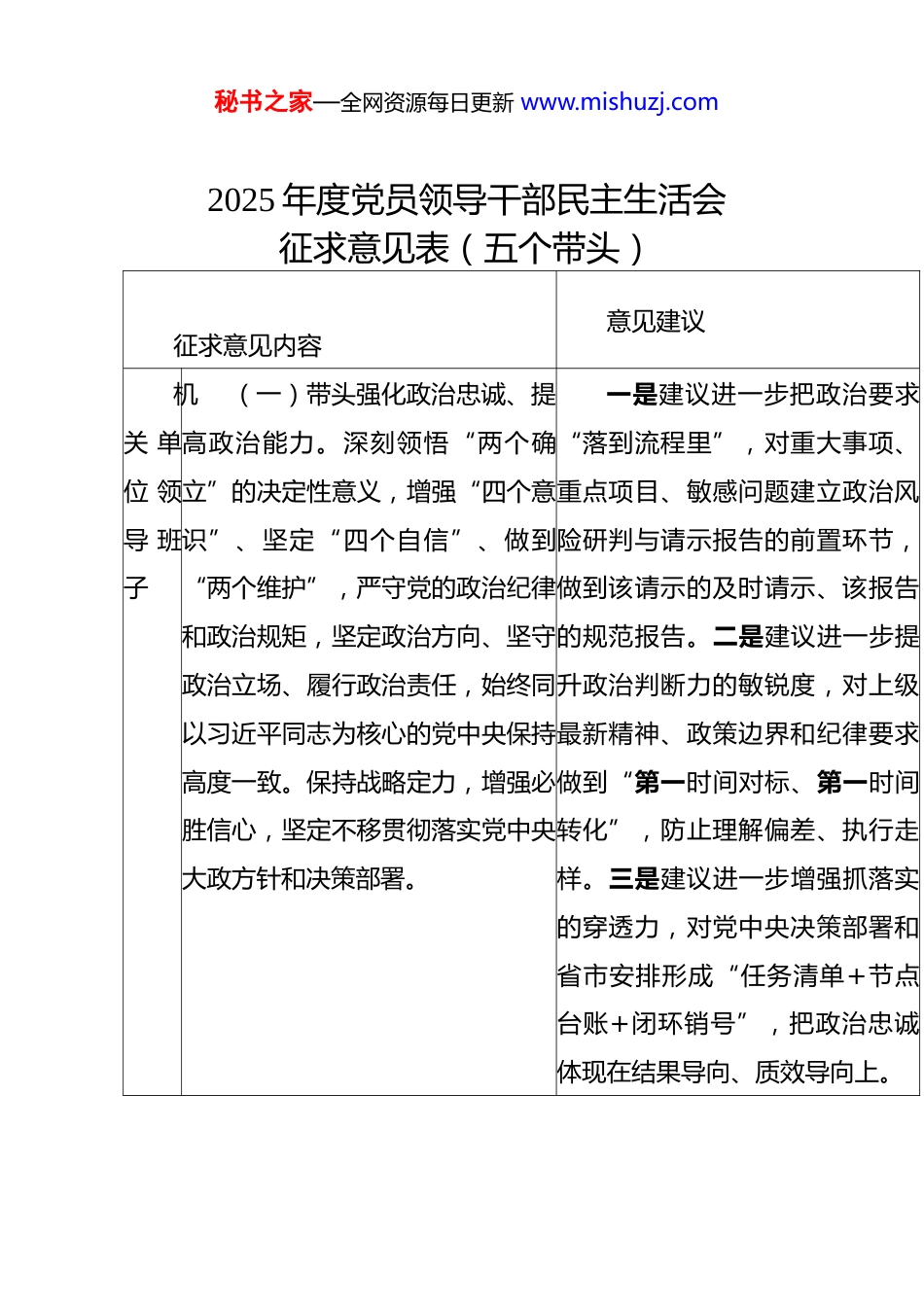 秘书之家—全网资源每日更新 www.mishuzj.com2025 年度党员领导干部民主生活会征求意见表(五个带头)征求意见内容意见建议机关 单位 领导 班子(一)带头强化政治忠诚、提高政治能力。深刻领悟“两个确立”的决定性意义,增强“四个意识”、坚定“四个自信”、做到“两个维护”,严守党的政治纪律和政治规矩,坚定政治方向、坚守政治立场、履行政治责任,始终同以习近平同志为核心的党中央保持高度一致。保持战略定力,增强必胜信心,坚定不移贯彻落实党中央大政方针和决策部署。一是建议进一步把政治要求“落到流程里”,对重大事项、重点项目、敏感问题建立政治风险研判与请示报告的前置环节,做到该请示的及时请示、该报告的规范报告。二是建议进一步提升政治判断力的敏锐度,对上级最新精神、政策边界和纪律要求做到“第一时间对标、第一时间转化”,防止理解偏差、执行走样。三是建议进一步增强抓落实的穿透力,对党中央决策部署和省市安排形成“任务清单+节点台账+闭环销号”,把政治忠诚体现在结果导向、质效导向上。秘书之家—全网资源每日更新 www.mishuzj.com(二)带头固本培元、增强党性。坚持把政治修养摆在党性修养的首位,自觉以习近平新时代中国特色社会主义思想凝心铸魂,坚守共产党人精神追求,解决好世界观、人生观、价值观总开关问题。认真学习党章党规党纪,始终用党性原则正心明道、修身律己,坚定理想信念、铸牢对党忠诚、厚植为民情怀、纯正道德品质、保持清正廉洁。一是建议理论学习再系统一些,避免碎片化、浅表化,突出“原原本本学+联系实际悟+带着问题研”,把学习成果转化为工作方法和制度安排。二是建议党性锤炼再经常一些,把自我检视作为常态,把批评和自我批评的“辣味”提起来,防止以工作忙为由弱化思想淬炼。三是建议纪律教育再深入一些,把党章党规党纪与典型案例结合起来,围绕重点岗位、关键环节开展针对性提醒谈话和廉政风险排查,做到早提醒、早纠偏。填表人及联系电话:填报时间:机关 单位 领导 班(三)带头敬畏人民、敬畏组织、敬畏法纪。走好新时代党的群众路线,落实“四下基层”制度,着力解决群众急难愁盼问题,密切党群干一是建议联系群众再实一点,调研多到一线、直奔问题,少“看材料、听汇报”,多“看现场、问对秘书之家—全网资源每日更新 www.mishuzj.com子群关系。严格贯彻执行民主集中制,严格执行领导班子议事决策规则,防止独断专行、搞“一言堂”。自觉筑牢拒腐防变的思想堤坝,规范权力运行,防止特权思想、特权现象,防止随意用权、任性用权。象”,把群众急难愁盼摸准摸透。二是建议民主集中制执行再严一点,重大事项严格按议事规则集体研究,完善会前酝酿、会上充分讨论、会后跟踪问效,防止议而不决、决而不行。三是建议依法依规用权再规范一点,围绕资金、项目、采购、执法、审批等关键领域加强内控与监督贯通,推动权力运行留痕可溯、风险可控。(四)带头干事创业、担当作为。树立和践行正确政绩观,完整准确全面贯彻新发展理念,统筹推进各项工作。坚持干字当头,积极识变应变求变,正确把握形势,增强忧患意识,坚持底线思维,用好发展机遇、一是建议担当精神再“硬”一点,面对难题敢啃“硬骨头”,对历史遗留、跨部门协同、推进阻力大的事项明确牵头领导、责任单位和完成时限。二是建议改秘书之家—全网资源每日更新 www.mishuzj.com潜力和优势,敢于斗争、善于斗争,以历史主动精神克难关、战风险、迎挑战,在推动高质量发展、加强基层治理、完成急难险重任务中担当作为,为实现“十五五”良好开局打牢基础。革创新再“准”一点,聚焦群众获得感和工作质效,把“能不能办、好不好办、办得快不快”作为改进方向,少做花架子、多做打基础的事。三是建议风险意识再“靠前”一点,围绕安全生产、信访稳定、舆情处置、财务合规、廉政风险等建立预警机制和应急预案,做到早识别、早处置、早化解。(五)带头坚决扛起管党治党责任。严于律己、严负其责、严管所辖,以永远在路上的坚韧和执着,持之以恒推进全面从严治党,扎实推进贯彻落实中央八项规定精神,常态化开展作风教育,扎牢作风建设制度...