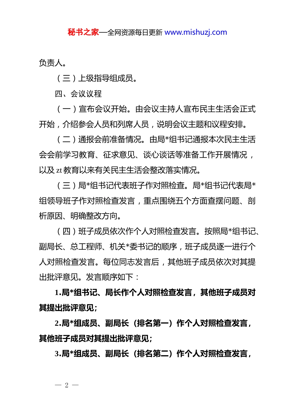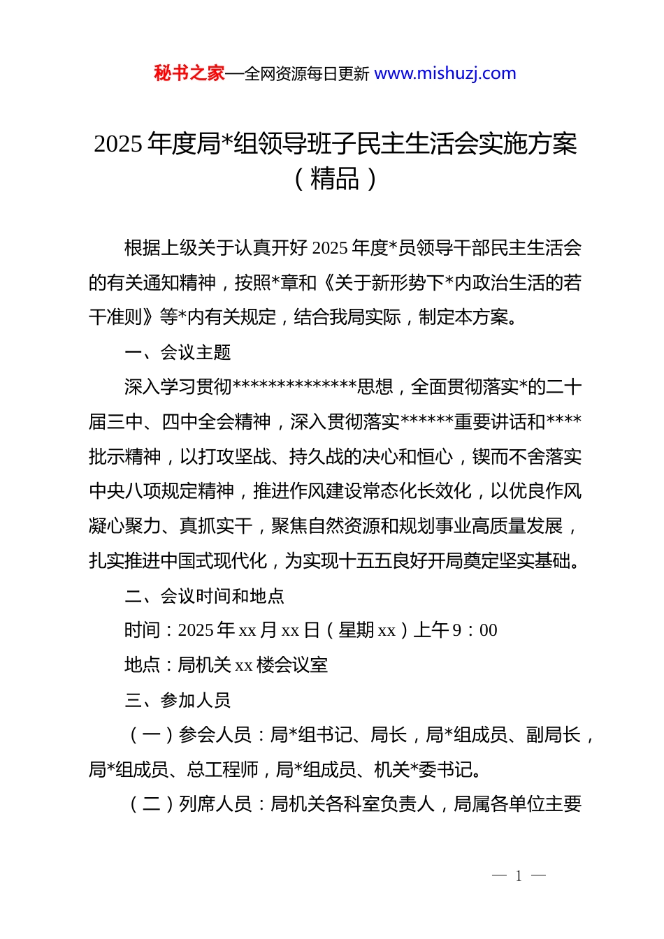 秘书之家—全网资源每日更新 www.mishuzj.com2025 年度局*组领导班子民主生活会实施方案(精品)根据上级关于认真开好 2025 年度*员领导干部民主生活会的有关通知精神,按照*章和《关于新形势下*内政治生活的若干准则》等*内有关规定,结合我局实际,制定本方案。一、会议主题深入学习贯彻**************思想,全面贯彻落实*的二十届三中、四中全会精神,深入贯彻落实******重要讲话和****批示精神,以打攻坚战、持久战的决心和恒心,锲而不舍落实中央八项规定精神,推进作风建设常态化长效化,以优良作风凝心聚力、真抓实干,聚焦自然资源和规划事业高质量发展,扎实推进中国式现代化,为实现十五五良好开局奠定坚实基础。二、会议时间和地点时间:2025 年 xx 月 xx 日(星期 xx)上午 9:00地点:局机关 xx 楼会议室三、参加人员(一)参会人员:局*组书记、局长,局*组成员、副局长,局*组成员、总工程师,局*组成员、机关*委书记。(二)列席人员:局机关各科室负责人,局属各单位主要— 1 —秘书之家—全网资源每日更新 www.mishuzj.com负责人。(三)上级指导组成员。四、会议议程(一)宣布会议开始。由会议主持人宣布民主生活会正式开始,介绍参会人员和列席人员,说明会议主题和议程安排。(二)通报会前准备情况。由局*组书记通报本次民主生活会会前学习教育、征求意见、谈心谈话等准备工作开展情况,以及 zt 教育以来有关民主生活会整改落实情况。(三)局*组书记代表班子作对照检查。局*组书记代表局*组领导班子作对照检查发言,重点围绕五个方面查摆问题、剖析原因、明确整改方向。(四)班子成员依次作个人对照检查发言。按照局*组书记、副局长、总工程师、机关*委书记的顺序,班子成员逐一进行个人对照检查发言。每位同志发言后,其他班子成员依次对其提出批评意见。发言顺序如下:1.局*组书记、局长作个人对照检查发言,其他班子成员对其提出批评意见;2.局*组成员、副局长(排名第一)作个人对照检查发言,其他班子成员对其提出批评意见;3.局*组成员、副局长(排名第二)作个人对照检查发言,— 2 —秘书之家—全网资源每日更新 www.mishuzj.com其他班子成员对其提出批评意见;4.局*组成员、副局长(排名第三)作个人对照检查发言,其他班子成员对其提出批评意见;5.局*组成员、总工程师作个人对照检查发言,其他班子成员对其提出批评意见;6.局*组成员、机关*委书记作个人对照检查发言,其他班子成员对其提出批评意见。(五)上级指导组点评指导。上级指导组同志对本次民主生活会进行点评,指出存在的问题和不足,提出整改要求和工作建议。(六)局*组书记作表态发言。局*组书记代表局*组领导班子作表态发言,表明整改决心,明确整改措施,对下一步工作进行安排部署。(七)宣布会议结束。由会议主持人宣布民主生活会结束。五、会前准备工作(一)深入开展理论学习。局*组和*员领导干部要把学习贯彻**************思想和*的二十届三中、四中全会精神贯穿民主生活会始终,一体学习领会******关于*的建设的重要思想、关于*的自我革命的重要思想以及关于加强 d 的纪律建设、作风建设的重要论述,学习贯彻***在二十届中央政治局第二十一次— 3 —秘书之家—全网资源每日更新 www.mishuzj.com集体学习时的重要讲话和对深入贯彻中央八项规定精神学习教育的****精神,学习贯彻***在*的二十届四中全会上的重要讲话精神和其他最新重要讲话精神,学习贯彻******关于自然资源工作的重要论述和****批示精神,学习贯彻《中共中央关于制定国民经济和社会发展第十五个五年规划的建议》,学习贯彻中央八项规定及其实施细则精神,学习《***谈治国理政》第五卷和*章、《中国共产 dj 律处分条例》、《中共中央办公厅关于锲而不舍落实中央八项规定精神推进作风建设常态化长效化的意见》等。同时,认真学习省委、市委相关全会等重要会议精神。要采取集体讨论、个人自学等方式深入开展学习,*员领导干部要相对集中 1-2 天进行个人自学,局*组理论学习中心组至少要开展 1 次专题学习研讨,切实把思想和行动统一到*中央决策部署和上级*委工作要求上来,...