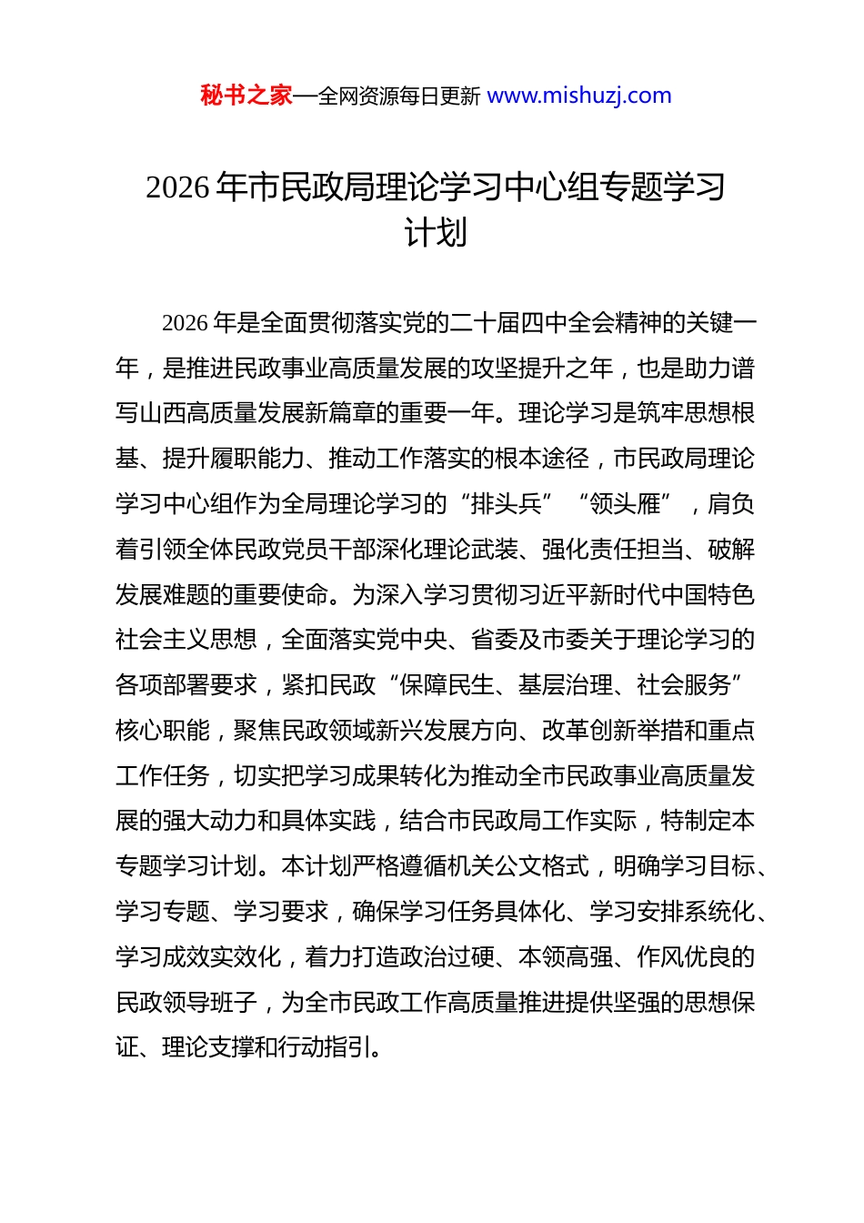 秘书之家—全网资源每日更新 www.mishuzj.com2026 年市民政局理论学习中心组专题学习计划 2026 年是全面贯彻落实党的二十届四中全会精神的关键一年,是推进民政事业高质量发展的攻坚提升之年,也是助力谱写山西高质量发展新篇章的重要一年。理论学习是筑牢思想根基、提升履职能力、推动工作落实的根本途径,市民政局理论学习中心组作为全局理论学习的“排头兵”“领头雁”,肩负着引领全体民政党员干部深化理论武装、强化责任担当、破解发展难题的重要使命。为深入学习贯彻习近平新时代中国特色社会主义思想,全面落实党中央、省委及市委关于理论学习的各项部署要求,紧扣民政“保障民生、基层治理、社会服务”核心职能,聚焦民政领域新兴发展方向、改革创新举措和重点工作任务,切实把学习成果转化为推动全市民政事业高质量发展的强大动力和具体实践,结合市民政局工作实际,特制定本专题学习计划。本计划严格遵循机关公文格式,明确学习目标、学习专题、学习要求,确保学习任务具体化、学习安排系统化、学习成效实效化,着力打造政治过硬、本领高强、作风优良的民政领导班子,为全市民政工作高质量推进提供坚强的思想保证、理论支撑和行动指引。秘书之家—全网资源每日更新 www.mishuzj.com一、2026 年专题学习指导思想2026 年市民政局理论学习中心组专题学习,坚持以习近平新时代中国特色社会主义思想为根本指导,深入学习贯彻习近平总书记各类重要论述精神、习近平总书记关于山西工作重要讲话和重要指示批示精神、习近平总书记关于民政工作的重要讲话和重要指示批示精神,全面落实党的二十届四中全会、中国共产党第二十届中央纪律检查委员会第五次全体会议及党中央、省委、市委重要会议精神,牢牢把握政治方向、强化政治引领、压实政治责任。立足市民政局核心职能,坚持学思用贯通、知信行统一,把理论学习与民政事业改革发展实践紧密结合,与解决群众急难愁盼问题紧密结合,与防范化解民政领域风险隐患紧密结合,聚焦普惠性、基础性、兜底性民生建设,聚焦基层治理体系和治理能力现代化建设,聚焦民政服务提质增效和改革创新。以提升理论素养、强化履职能力、锤炼优良作风为目标,创新学习形式、完善学习机制、深化学习成效,引导中心组成员深刻领悟“两个确立”的决定性意义,增强“四个意识”、坚定“四个自信”、做到“两个维护”,始终在思想上、政治上、行动上同以习近平同志为核心的党中央保持高度一致。不断推动理论学习往深里走、往实里走、往心里走,切实把学习成果转化为谋划工作的思路、推动工作的举措、秘书之家—全网资源每日更新 www.mishuzj.com解决问题的能力,奋力开创全市民政事业高质量发展新局面,为助力山西高质量发展、增进民生福祉贡献民政力量。二、2026 年专题学习重点内容1.、深入学习习近平新时代中国特色社会主义思想的世界观和方法论,夯实民政工作思想根基深入学习领会习近平新时代中国特色社会主义思想是当代中国马克思主义、二十一世纪马克思主义,是中华文化和中国精神的时代精华,是党和国家必须长期坚持的指导思想,深刻把握其核心要义、精神实质、丰富内涵和实践要求,切实增强学习贯彻的政治自觉、思想自觉和行动自觉。重点学习《习近平谈治国理政》第一至四卷、《习近平新时代中国特色社会主义思想学习纲要(2023 年版)》,认真研读习近平总书记《论党的自我革命》《论坚持人民至上》等重要著作,深刻领悟贯穿其中的立场观点方法,准确把握“六个必须坚持”的丰富内涵和实践要求。结合民政工作实际,深刻理解人民至上是民政工作的根本立场,把以人民为中心的发展思想贯穿民政工作全过程各方面,始终聚焦群众最关心、最直接、最现实的民生问题,着力补齐民生短板、增进民生福祉。深刻理解守正创新是民政事业发展的动力源泉,主动适应新时代民政工作新形势新任务新要求,打破传统工作思维,创新民政服务模式、完善政秘书之家—全网资源每日更新 www.mishuzj.com策体系、提升服务效能。深刻理解问题导向是民政工作的基本方法,聚焦民政领域存在的突出问题、薄弱环节,深入调研、精准施策,不断破解发展难题、提升工作质量。通...