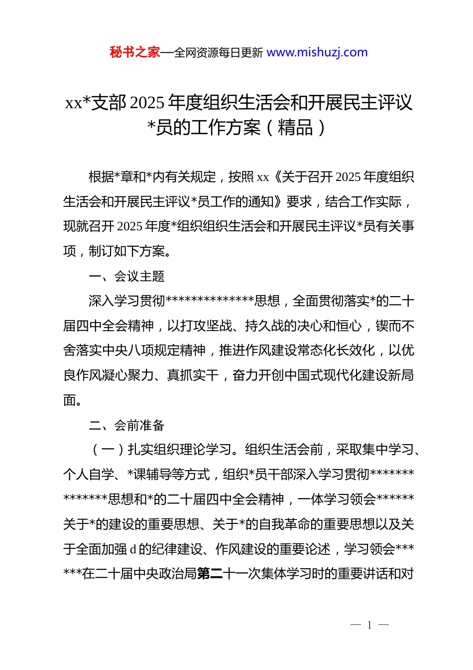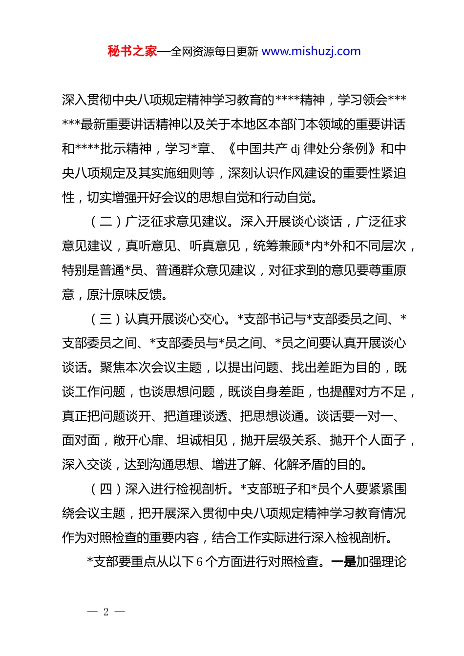 秘书之家—全网资源每日更新 www.mishuzj.comxx*支部 2025 年度组织生活会和开展民主评议*员的工作方案(精品)根据*章和*内有关规定,按照 xx《关于召开 2025 年度组织生活会和开展民主评议*员工作的通知》要求,结合工作实际,现就召开 2025 年度*组织组织生活会和开展民主评议*员有关事项,制订如下方案。一、会议主题深入学习贯彻**************思想,全面贯彻落实*的二十届四中全会精神,以打攻坚战、持久战的决心和恒心,锲而不舍落实中央八项规定精神,推进作风建设常态化长效化,以优良作风凝心聚力、真抓实干,奋力开创中国式现代化建设新局面。二、会前准备(一)扎实组织理论学习。组织生活会前,采取集中学习、个人自学、*课辅导等方式,组织*员干部深入学习贯彻**************思想和*的二十届四中全会精神,一体学习领会******关于*的建设的重要思想、关于*的自我革命的重要思想以及关于全面加强 d 的纪律建设、作风建设的重要论述,学习领会******在二十届中央政治局第二十一次集体学习时的重要讲话和对— 1 —秘书之家—全网资源每日更新 www.mishuzj.com深入贯彻中央八项规定精神学习教育的****精神,学习领会******最新重要讲话精神以及关于本地区本部门本领域的重要讲话和****批示精神,学习*章、《中国共产 dj 律处分条例》和中央八项规定及其实施细则等,深刻认识作风建设的重要性紧迫性,切实增强开好会议的思想自觉和行动自觉。(二)广泛征求意见建议。深入开展谈心谈话,广泛征求意见建议,真听意见、听真意见,统筹兼顾*内*外和不同层次,特别是普通*员、普通群众意见建议,对征求到的意见要尊重原意,原汁原味反馈。(三)认真开展谈心交心。*支部书记与*支部委员之间、*支部委员之间、*支部委员与*员之间、*员之间要认真开展谈心谈话。聚焦本次会议主题,以提出问题、找出差距为目的,既谈工作问题,也谈思想问题,既谈自身差距,也提醒对方不足,真正把问题谈开、把道理谈透、把思想谈通。谈话要一对一、面对面,敞开心扉、坦诚相见,抛开层级关系、抛开个人面子,深入交谈,达到沟通思想、增进了解、化解矛盾的目的。(四)深入进行检视剖析。*支部班子和*员个人要紧紧围绕会议主题,把开展深入贯彻中央八项规定精神学习教育情况作为对照检查的重要内容,结合工作实际进行深入检视剖析。*支部要重点从以下 6 个方面进行对照检查。一是加强理论— 2 —秘书之家—全网资源每日更新 www.mishuzj.com武装方面。重点检视是否坚持把学习贯彻**************思想作为首要政治任务,是否建立健全理论学习长效机制,是否做到学思用贯通、知信行统一。二是执行上级组织决定方面。重点检视是否坚决贯彻落实*中央决策部署和上级*组织各项工作安排,是否存在有令不行、有禁不止的问题,是否做到令行禁止、政令畅通。三是严格组织生活方面。重点检视是否严格落实“三会一课”、主题*日、组织生活会、民主评议*员等制度,是否坚持民主集中制原则,组织生活是否规范有效。四是加强*员管理监督方面。重点检视是否严格*员日常教育管理,是否认真落实*员发展程序,是否加强对流动*员的管理服务,是否注重运用监督执纪“四种形态”。五是做好群众工作方面。重点检视是否走好新时代*的群众路线,是否深入联系服务群众,是否及时回应群众关切、解决群众急难愁盼问题。六是抓好自身建设方面。重点检视*支部班子是否团结协作、发挥战斗堡垒作用,支部委员是否履职尽责、带头发挥模范作用,是否存在作风不实、纪律松弛等问题。*员要重点从以下 5 个方面查找差距不足。一是学习贯彻*的创新理论方面。重点检视是否自觉用**************思想武装头脑、指导实践、推动工作,是否存在学用脱节、理论联系实际不够等问题。二是加强*性锤炼方面。重点检视是否坚定理— 3 —秘书之家—全网资源每日更新 www.mishuzj.com想信念,是否牢记*员身份、强化*员意识,是否严守政治纪律和政治规矩,是否做到对*忠诚老实。三是联系服务群众方面。重点检视是否践行全心全意为人民服务的根本宗旨,是否主动深入群众、关心群众疾苦,是否存在脱离群众、漠视群众利益等问题。...