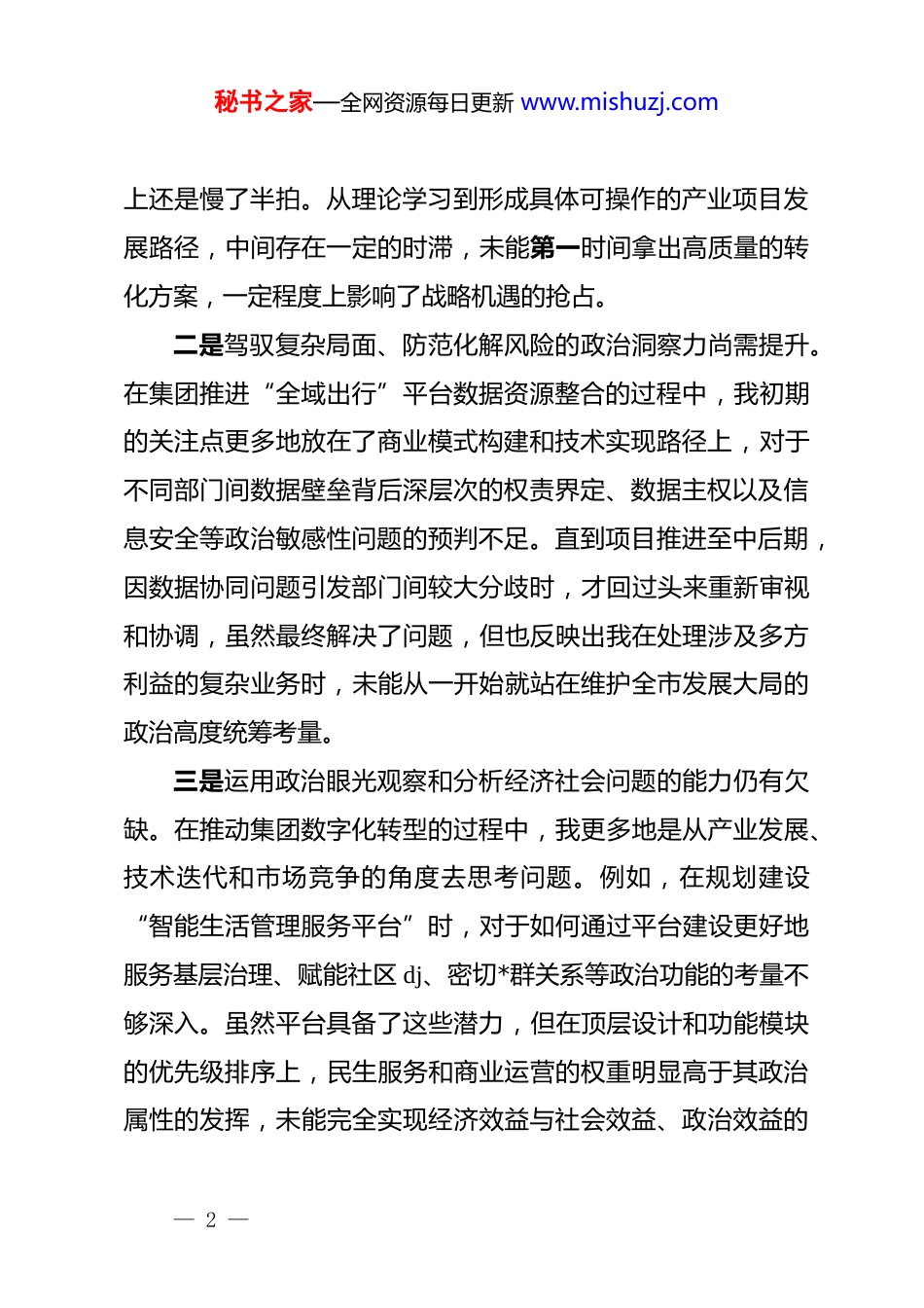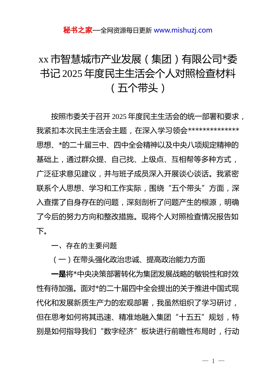 秘书之家—全网资源每日更新 www.mishuzj.comxx 市智慧城市产业发展(集团)有限公司*委书记 2025 年度民主生活会个人对照检查材料(五个带头)按照市委关于召开 2025 年度民主生活会的统一部署和要求,我紧扣本次民主生活会主题,在深入学习领会**************思想、*的二十届三中、四中全会精神以及中央八项规定精神的基础上,通过群众提、自己找、上级点、互相帮等多种方式,广泛征求意见建议,并与班子成员深入开展谈心谈话。我紧密联系个人思想、学习和工作实际,围绕“五个带头”方面,深入查摆了自身存在的问题,深刻剖析了问题产生的根源,明确了今后的努力方向和整改措施。现将个人对照检查情况报告如下。一、存在的主要问题(一)在带头强化政治忠诚、提高政治能力方面一是将*中央决策部署转化为集团发展战略的敏锐性和时效性有待加强。面对*的二十届四中全会提出的关于推进中国式现代化和发展新质生产力的宏观部署,我虽然组织了学习研讨,但在思考如何将其迅速、精准地融入集团“十五五”规划,特别是如何指导我们“数字经济”板块进行前瞻性布局时,行动— 1 —秘书之家—全网资源每日更新 www.mishuzj.com上还是慢了半拍。从理论学习到形成具体可操作的产业项目发展路径,中间存在一定的时滞,未能第一时间拿出高质量的转化方案,一定程度上影响了战略机遇的抢占。二是驾驭复杂局面、防范化解风险的政治洞察力尚需提升。在集团推进“全域出行”平台数据资源整合的过程中,我初期的关注点更多地放在了商业模式构建和技术实现路径上,对于不同部门间数据壁垒背后深层次的权责界定、数据主权以及信息安全等政治敏感性问题的预判不足。直到项目推进至中后期,因数据协同问题引发部门间较大分歧时,才回过头来重新审视和协调,虽然最终解决了问题,但也反映出我在处理涉及多方利益的复杂业务时,未能从一开始就站在维护全市发展大局的政治高度统筹考量。三是运用政治眼光观察和分析经济社会问题的能力仍有欠缺。在推动集团数字化转型的过程中,我更多地是从产业发展、技术迭代和市场竞争的角度去思考问题。例如,在规划建设“智能生活管理服务平台”时,对于如何通过平台建设更好地服务基层治理、赋能社区 dj、密切*群关系等政治功能的考量不够深入。虽然平台具备了这些潜力,但在顶层设计和功能模块的优先级排序上,民生服务和商业运营的权重明显高于其政治属性的发挥,未能完全实现经济效益与社会效益、政治效益的— 2 —秘书之家—全网资源每日更新 www.mishuzj.com有机统一。(二)在带头固本培元、增强*性方面一是理论学习与思想改造的结合不够紧密。在学习**************思想时,有时存在为了学习而学习的倾向,满足于完成“规定动作”,但在用*的创新理论改造主观世界、解决思想深处“总开关”问题上下的功夫还不够。比如,在面对集团存在的债务风险化解这一“硬骨头”时,虽然在会上强调要坚定信心、迎难而上,但夜深人静时,内心深处偶尔也会滋生畏难情绪,这正是理想信念不够坚如磐石,未能完全将理论学习成果转化为强大精神动力的表现。二是以*性原则检视工作得失的标准不够严格。日常工作中,我习惯于用业务指标、经营数据来衡量工作成效,用是否完成年度任务来评判工作好坏,但对照*章*规 dj 这面镜子,从*性原则的高度来反思决策过程、检视工作作风的自觉性还不够。例如,在推进“汽车驿站”项目建设时,面对进度滞后的情况,我首先想到的是调整工期、增派人手等行政管理手段,而较少反思自己作为“班长”,在其中是否存在急于求成、未能充分发扬民主听取各方意见从而导致前期论证不充分等*性修养方面的问题。三是*内政治生活的“炉火”纯度有待提升。作为*委书记,— 3 —秘书之家—全网资源每日更新 www.mishuzj.com我在主持*委会议或民主生活会时,有时为了维护班子团结和会议和谐氛围,对于一些同志发言中存在的苗头性、倾向性问题,提出的批评意见不够“辣味”,存在“和风细雨”多、“疾风骤雨”少的情况。这种“爱之深,责之切”的勇气和担当有所欠缺,没有真正做到“红脸出汗”,从长远看,不利于班子成员的共同进步和集团的健康...