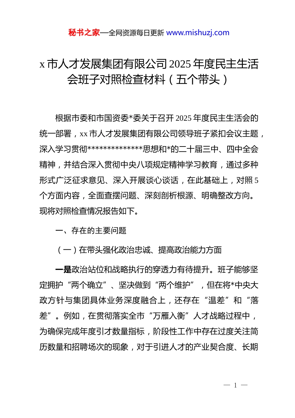 秘书之家—全网资源每日更新 www.mishuzj.comx 市人才发展集团有限公司 2025 年度民主生活会班子对照检查材料(五个带头)根据市委和市国资委*委关于召开 2025 年度民主生活会的统一部署,xx 市人才发展集团有限公司领导班子紧扣会议主题,深入学习贯彻**************思想和*的二十届三中、四中全会精神,并结合深入贯彻中央八项规定精神学习教育,通过多种形式广泛征求意见、深入开展谈心谈话,在此基础上,对照 5个方面内容,全面查摆问题、深刻剖析根源、明确整改方向。现将对照检查情况报告如下。一、存在的主要问题(一)在带头强化政治忠诚、提高政治能力方面一是政治站位和战略执行的穿透力有待提升。班子能够坚定拥护“两个确立”、坚决做到“两个维护”,但在将*中央大政方针与集团具体业务深度融合上,还存在“温差”和“落差”。例如,在贯彻落实全市“万雁入衡”人才战略过程中,为确保完成年度引才数量指标,阶段性工作中存在过度关注简历数量和招聘场次的现象,对于引进人才的产业契合度、长期— 1 —秘书之家—全网资源每日更新 www.mishuzj.com留存率和职业发展跟踪服务等体现战略核心目标的深层次工作,投入的精力和资源相对不足,使得政策执行的宏观导向在微观层面有所弱化。二是运用政治眼光观察和分析问题的能力尚需加强。班子在做经营决策时,习惯于从市场逻辑、经济效益出发,但从政治高度审视业务发展方向、防范化解潜在风险的敏锐性还不够。例如,在 2025 年探讨一项关于高端人才培训的合资项目时,初期论证报告过多地强调了项目的预期收益和市场占有率,对于合作方在意识形态、价值导向方面是否与国家重点产业人才培养战略完全契合的政治风险,未能进行充分的研判和压力测试,直到后续审查阶段才予以纠正,反映出在重大决策中政治“免疫力”仍需增强。三是贯彻落实上级决策部署的主动性和创造性有所欠缺。在执行市委、市政府关于服务重大产业布局的指令时,有时存在按部就班、照本宣科的倾向,缺乏结合集团自身优势进行创造性转化的工作热情。比如,在服务湘南湘西承接产业转移示范区建设中,集团提供的多是标准化的人事代理、劳务派遣等基础服务,对于如何围绕示范区内主导产业链,前瞻性地构建定制化、高附加值的人才供应链解决方案,主动谋划和系统推— 2 —秘书之家—全网资源每日更新 www.mishuzj.com进的力度不够,未能完全发挥出国有人才平台在区域发展中的战略支撑作用。(二)在带头固本培元、增强*性方面一是理论学习与业务实践“两张皮”现象依然存在。班子坚持通过中心组学习等方式,以**************思想凝心铸魂,但学思用贯通、知信行统一做得还不够到位。比如,虽然多次组织学习新发展理念,但在推动集团核心产品“雁城英才一体化数字平台”的迭代升级时,仍停留在对现有线下业务的线上化模仿,未能深刻运用新发展理念指导实践,通过大数据分析、人工智能等手段来预测产业人才需求、优化人才服务生态、创造全新业务增长点,理论学习的成效未能充分转化为推动高质量发展的创新动能。二是面对困难挑战时坚守理想信念的韧劲有待磨砺。在集团改革发展的攻坚期,面对一些投入大、见效慢的战略性业务,班子成员有时会产生畏难情绪和急于求成的思想。例如,2025年下半年,“雁城英才一体化数字平台”在推广初期面临用户活跃度不高、数据协同不畅的难题时,班子内部一度出现了“投入产出不成正比”“是否应缩减技术研发投入”等消极声音,虽然后来统一了思想、坚持了下去,但这暴露出在面对挫— 3 —秘书之家—全网资源每日更新 www.mishuzj.com折时,用坚定的理想信念砥砺斗争意志、保持战略定力的修炼尚有不足。三是*性原则在干部选拔任用中的标尺作用未被提到最高。班子在干部工作中,总体上能够坚持“凭能力用干部,以实绩论英雄”的导向,但在个别批次的内部干部调整和晋升中,为了平衡各方关系、调动多方积极性,有时会在坚持原则的刚性上有所妥协,对一些专业能力突出但综合协调能力稍弱的干部,未能给予更具挑战性的岗位去锻炼,这在一定程度上影响了最优人才配置和干部队伍整体战斗力的提升。(三)在带头敬畏人民、...