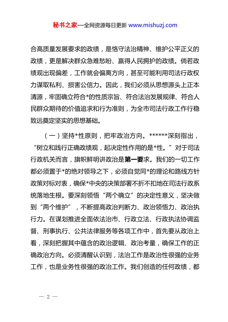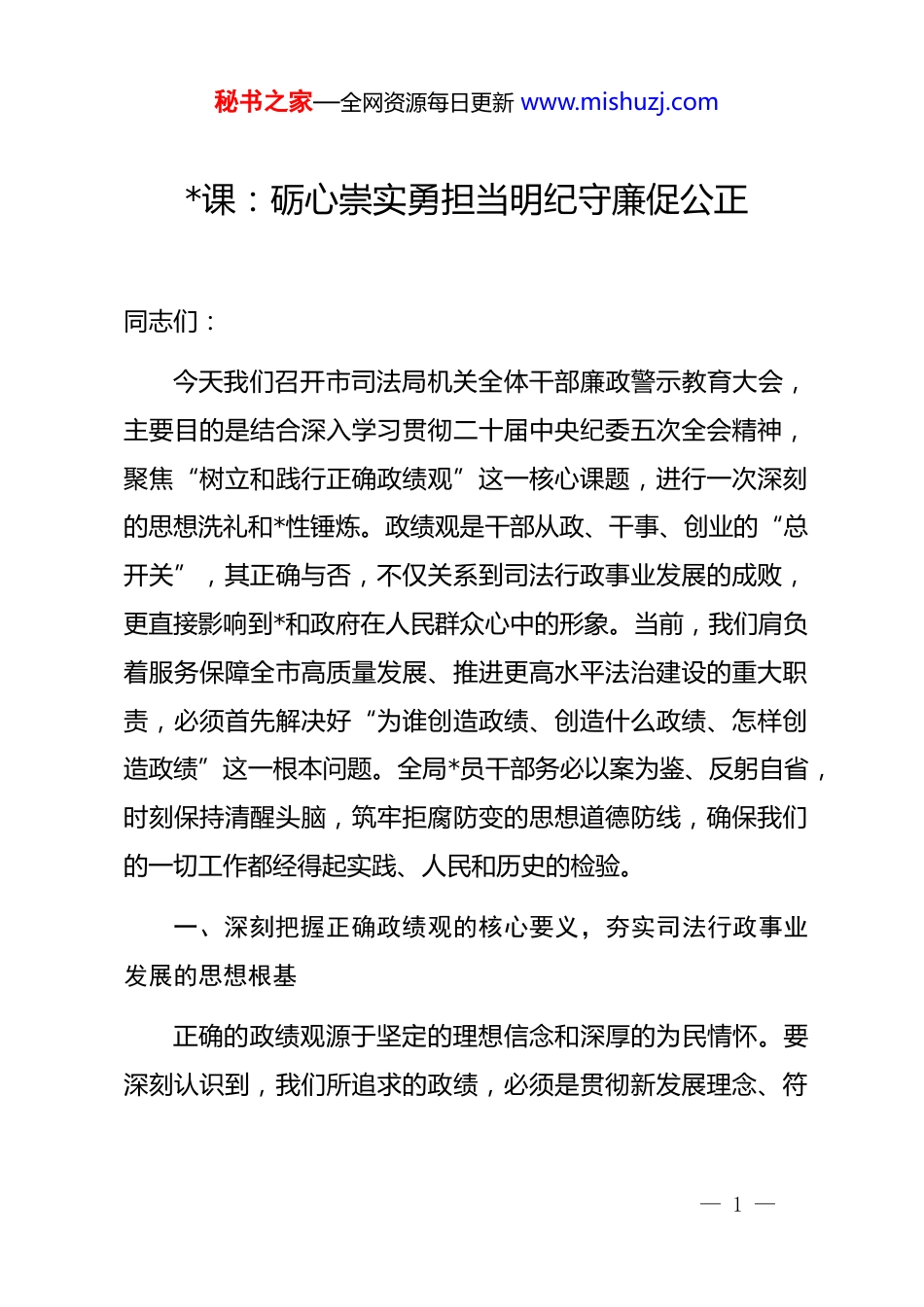 秘书之家—全网资源每日更新 www.mishuzj.com*课:砺心崇实勇担当明纪守廉促公正同志们:今天我们召开市司法局机关全体干部廉政警示教育大会,主要目的是结合深入学习贯彻二十届中央纪委五次全会精神,聚焦“树立和践行正确政绩观”这一核心课题,进行一次深刻的思想洗礼和*性锤炼。政绩观是干部从政、干事、创业的“总开关”,其正确与否,不仅关系到司法行政事业发展的成败,更直接影响到*和政府在人民群众心中的形象。当前,我们肩负着服务保障全市高质量发展、推进更高水平法治建设的重大职责,必须首先解决好“为谁创造政绩、创造什么政绩、怎样创造政绩”这一根本问题。全局*员干部务必以案为鉴、反躬自省,时刻保持清醒头脑,筑牢拒腐防变的思想道德防线,确保我们的一切工作都经得起实践、人民和历史的检验。一、深刻把握正确政绩观的核心要义,夯实司法行政事业发展的思想根基正确的政绩观源于坚定的理想信念和深厚的为民情怀。要深刻认识到,我们所追求的政绩,必须是贯彻新发展理念、符— 1 —秘书之家—全网资源每日更新 www.mishuzj.com合高质量发展要求的政绩,是恪守法治精神、维护公平正义的政绩,更是解决群众急难愁盼、赢得人民拥护的政绩。倘若政绩观出现偏差,工作就会偏离方向,甚至可能利用司法行政权力谋取私利、损害公信力。因此,我们必须从思想源头上正本清源,牢固确立符合*的性质宗旨、符合法治发展规律、符合人民群众期待的价值追求和行为准则,为全市司法行政工作行稳致远奠定坚实的思想基础。(一)坚持*性原则,把牢政治方向。******深刻指出,“树立和践行正确政绩观,起决定性作用的是*性。”对于司法行政机关而言,旗帜鲜明讲政治是第一要求。我们的一切工作都必须置于*的绝对领导之下,必须自觉同*的理论和路线方针政策对标对表,确保*中央的决策部署不折不扣地在司法行政系统落地生根。要深刻领悟“两个确立”的决定性意义,坚决做到“两个维护”,不断提高政治判断力、政治领悟力、政治执行力。在谋划推进全面依法治市、行政立法、行政执法协调监督、刑事执行、公共法律服务等各项工作中,首先要从政治上看,深刻把握其中蕴含的政治逻辑、政治考量,确保工作的正确政治方向。必须清醒认识到,法治工作是政治性很强的业务工作,也是业务性很强的政治工作。我们创造的任何政绩,都— 2 —秘书之家—全网资源每日更新 www.mishuzj.com应当是彰显*的执政理念、巩固*的执政根基的政绩,是强化*对全面依法治国集中统一领导的政绩。要坚决防止将政治与业务割裂开来的错误倾向,杜绝任何形式的“低级红”、“高级黑”,确保司法行政工作始终沿着中国特色社会主义法治道路坚定前行。要自觉将本职工作融入*和国家事业发展全局、融入全市中心工作来思考和推进,使司法行政工作与*的使命任务同频共振,在服务大局中彰显价值、创造实绩。(二)恪守为民宗旨,践行法治为民。******强调,“共产*人必须牢记,为民造福是最大政绩。”司法行政工作点多、线长、面广,与人民群众的切身利益息息相关。无论是普法宣传引导群众尊法学法,还是人民调解化解基层矛盾;无论是法律援助扶助贫弱群体,还是监狱、社区矫正工作教育改造罪犯,每一项职能都直接关系到人民群众的法治获得感、幸福感、安全感。树立和践行正确政绩观,就必须始终坚持以人民为中心的发展思想,把实现好、维护好、发展好最广大人民根本利益作为一切工作的出发点和落脚点。我们要创造的政绩,应当是让法治阳光普照每一个角落、让公平正义浸润每一寸心田的政绩。这要求我们必须深入基层、深入群众,倾听民声、了解民意,精准把握人民群众在民主、法治、公平、正义、安全、环— 3 —秘书之家—全网资源每日更新 www.mishuzj.com境等方面日益增长的需求。要聚焦人民群众在法治领域的急难愁盼问题,用心用情用力办好每一件立法民意征集、每一次法律咨询、每一桩矛盾纠纷调解、每一例法律援助案件。要坚决反对任何形式主义、官僚主义,不能关起门来搞政策、脱离实际定指标,更不能为了追求所谓的“亮点”、“创新”而忽视解决群众最关心、最直接、最现实的利益问题。真正的政绩,是人民群...