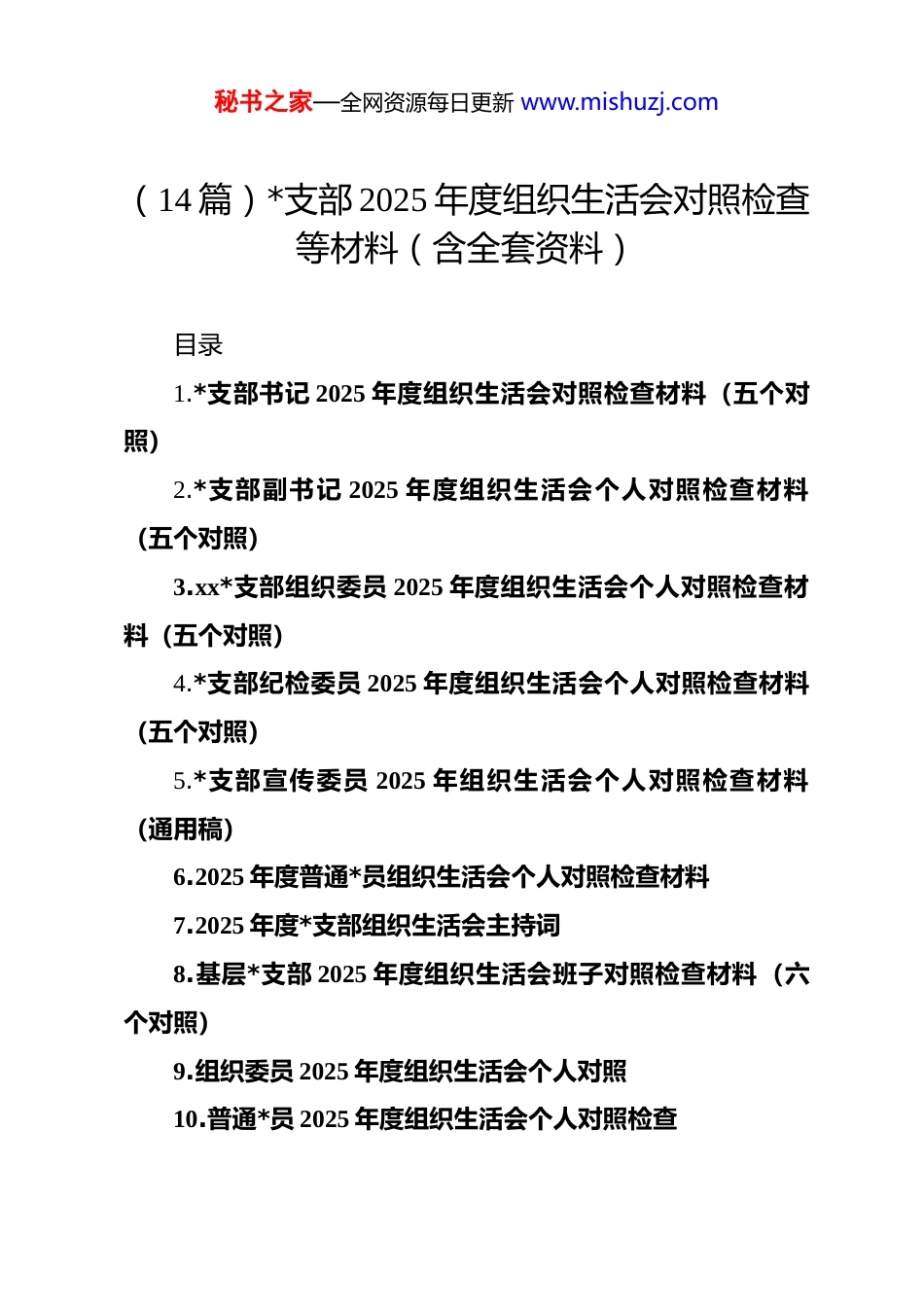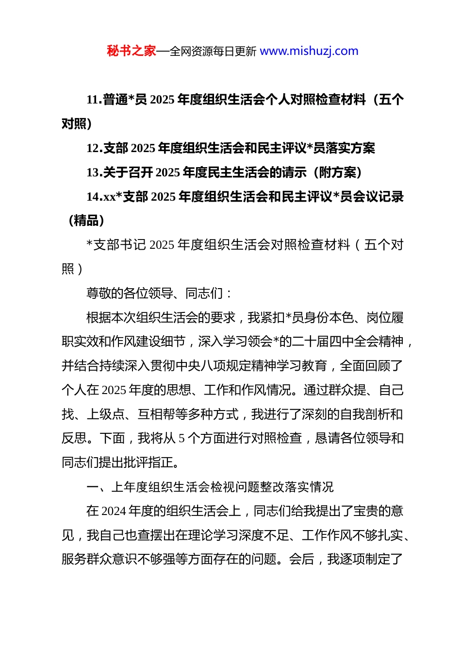 秘书之家—全网资源每日更新 www.mishuzj.com(14 篇)*支部 2025 年度组织生活会对照检查等材料(含全套资料)目录1.*支部书记 2025 年度组织生活会对照检查材料(五个对照)2.*支部副书记 2025 年度组织生活会个人对照检查材料(五个对照)3.xx*支部组织委员 2025 年度组织生活会个人对照检查材料(五个对照)4.*支部纪检委员 2025 年度组织生活会个人对照检查材料(五个对照)5.*支部宣传委员 2025 年组织生活会个人对照检查材料(通用稿)6.2025 年度普通*员组织生活会个人对照检查材料7.2025 年度*支部组织生活会主持词8.基层*支部 2025 年度组织生活会班子对照检查材料(六个对照)9.组织委员 2025 年度组织生活会个人对照10.普通*员 2025 年度组织生活会个人对照检查秘书之家—全网资源每日更新 www.mishuzj.com11.普通*员 2025 年度组织生活会个人对照检查材料(五个对照)12.支部 2025 年度组织生活会和民主评议*员落实方案13.关于召开 2025 年度民主生活会的请示(附方案)14.xx*支部 2025 年度组织生活会和民主评议*员会议记录(精品)*支部书记 2025 年度组织生活会对照检查材料(五个对照)尊敬的各位领导、同志们:根据本次组织生活会的要求,我紧扣*员身份本色、岗位履职实效和作风建设细节,深入学习领会*的二十届四中全会精神,并结合持续深入贯彻中央八项规定精神学习教育,全面回顾了个人在 2025 年度的思想、工作和作风情况。通过群众提、自己找、上级点、互相帮等多种方式,我进行了深刻的自我剖析和反思。下面,我将从 5 个方面进行对照检查,恳请各位领导和同志们提出批评指正。一、上年度组织生活会检视问题整改落实情况在 2024 年度的组织生活会上,同志们给我提出了宝贵的意见,我自己也查摆出在理论学习深度不足、工作作风不够扎实、服务群众意识不够强等方面存在的问题。会后,我逐项制定了秘书之家—全网资源每日更新 www.mishuzj.com详细的整改措施,并以高度的政治自觉积极推进落实。在强化理论武装,解决“学用脱节”问题方面,我彻底摒弃了“以干代学”的错误观念,制定了个人年度学习计划。坚持每日通过“学习强国”平台自学不少于一小时,每月精读一本理论或业务书籍,并撰写心得体会。特别是在学习******关于本行业本领域的****批示精神时,我不再满足于通读一遍,而是建立专门的学习台账,逐条梳理与我局职能相关的要求,并思考如何在支部工作中贯彻落实。例如,针对之前理论学习与业务工作结合不紧密的问题,我在 2025 年第二季度牵头组织了“dj 引领业务创新”专题研讨,引导支部*员同志们围绕如何优化审批流程、提升监管效能等实际问题,从*的创新理论中寻找答案和方法,推动了 3 项业务流程的微创新,切实用理论学习的成果指导了工作实践。在改进工作作风,解决“标准不高”问题方面,我带头向形式主义、官僚主义“开刀”。针对上年度查摆出的会议多、文件流转慢等问题,我推动建立了支部会议“前置沟通”机制,对议题不明确、准备不充分的会议坚决不开;同时,带头精简文件材料,要求凡是可以通过信息化手段传达的,一律不发纸质文件。2025 年,我主持召开的支部会议时长平均压缩了20%,文件流转效率提升了约 15%。在日常工作中,我要求自秘书之家—全网资源每日更新 www.mishuzj.com己和支部同志们发扬“钉钉子”精神,对每一项工作都追求极致。例如,在 2025 年 9 月的一次全局性汇报材料撰写任务中,我带领支部几位年轻同志,连续三天逐字逐句打磨文稿,核对每一个数据,确保了材料的高质量完成,改变了以往满足于“差不多”的状况,支部的整体工作标准得到了有效提升。在增强宗旨意识,解决“服务不优”问题方面,我将“群众满意不满意”作为检验工作的根本标准。我为自己设立了“基层联系日”,每季度至少利用两个工作日,不打招呼、不定路线,深入企业、社区和基层站所,与一线工作人员和办事群众面对面交流。在 2025 年的一次走访中,我了解到有几家小微企业对某项惠企政策的申报流程不清楚,反复跑了几次都未能成功办理。我立即将此问题带回局里,并协调相关业务科室,...