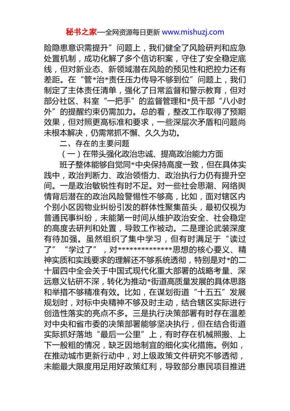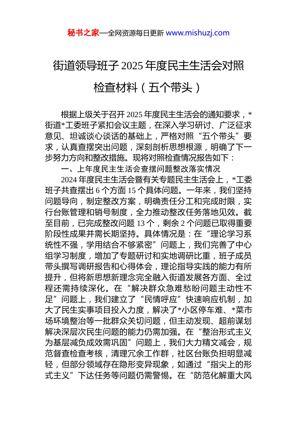 秘书之家—全网资源每日更新 www.mishuzj.com街道领导班子 2025 年度民主生活会对照检查材料(五个带头)根据上级关于召开 2025 年度民主生活会的通知要求,*街道*工委班子紧扣会议主题,在深入学习研讨、广泛征求意见、坦诚谈心谈话的基础上,严格对照“五个带头”要求,认真查摆突出问题,深刻剖析思想根源,明确了下一步努力方向和整改措施。现将对照检查情况报告如下:一、上年度民主生活会查摆问题整改落实情况2024 年度民主生活会暨有关专题民主生活会上,*工委班子共查摆出 6 个方面 15 个具体问题。一年来,我们坚持问题导向,制定整改方案,明确责任分工和完成时限,实行台账管理和销号制度,全力推动整改任务落地见效。截至目前,已完成整改问题 13 个,剩余 2 个问题已取得重要阶段性成果并需长期坚持。具体情况是:在“理论学习系统性不强,学用结合不够紧密”问题上,我们完善了中心组学习制度,增加了专题研讨和实地调研比重,班子成员带头撰写调研报告和心得体会,理论指导实践的能力有所提升,但将新思想新理念完全融入街道发展各方面、全过程还需持续深化。在“解决群众急难愁盼问题主动性不足”问题上,我们建立了“民情呼应”快速响应机制,加大了民生实事项目投入力度,解决了*小区停车难、*菜市场环境整治等一批群众关切问题,但主动发现、超前谋划解决深层次民生问题的能力仍需加强。在“整治形式主义为基层减负成效需巩固”问题上,我们大力精文减会,规范督查检查考核,清理冗余工作群,社区台账负担明显减轻,但部分领域存在隐形变异现象,如通过“指尖上的形式主义”下达任务等问题仍需警惕。在“防范化解重大风秘书之家—全网资源每日更新 www.mishuzj.com险隐患意识需提升”问题上,我们健全了风险研判和应急处置机制,成功化解了多个信访积案,守住了安全稳定底线,但对新业态、新领域潜在风险的预见性和把控力还有差距。在“管*治*责任压力传导不够到位”问题上,我们制定了主体责任清单,强化了日常监督和警示教育,但对部分社区、科室“一把手”的监督管理和*员干部“八小时外”的提醒约束仍需加力。总的看,整改工作取得了预期效果,但对照更高标准和要求,一些深层次矛盾和问题尚未根本解决,仍需常抓不懈、久久为功。二、存在的主要问题(一)在带头强化政治忠诚、提高政治能力方面班子整体能够自觉同*中央保持高度一致,但在具体实践中,政治判断力、政治领悟力、政治执行力仍有提升空间。一是政治敏锐性有时不足。对一些社会思潮、网络舆情背后潜在的政治风险警惕性不够高,比如,面对辖区内个别小区因物业纠纷引发的群体性聚集苗头,最初仅视为普通民事纠纷,未能第一时间从维护政治安全、社会稳定的高度去研判和处置,导致工作被动。二是理论武装深度有待加强。虽然组织了集中学习,但有时满足于“读过了”“学过了”,对**************思想的核心要义、精神实质和实践要求的理解还不够系统透彻,特别是对*的二十届四中全会关于中国式现代化重大部署的战略考量、深远意义钻研不深,转化为推动*街道高质量发展的具体思路和举措不够精准有效。比如,在谋划街道“十五五”发展规划时,对标中央精神不够及时主动,结合辖区实际进行创造性落实的亮点不多。三是执行决策部署有时存在温差对中央和省市委的决策部署能够坚决执行,但在结合街道实际抓好落地“最后一公里”上,有时存在机械照搬、上下一般粗的情况,缺乏因地制宜的细化实化措施。例如,在推动城市更新行动中,对上级政策文件研究不够透彻,未能最大限度用足用好政策红利,导致部分惠民项目推进秘书之家—全网资源每日更新 www.mishuzj.com速度不如预期。四是政治纪律规矩意识需持续绷紧。班子成员个人能严守纪律,但在带动分管领域和基层*员干部时刻绷紧政治纪律这根弦上,提醒、督促不够经常,对一些同志在非正式场合发表的不当言论,有时碍于情面批评指正不够坚决有力。(二)在带头固本培元、增强*性方面班子成员总体*性坚定,但对照更高标准,*性锤炼的自觉性和主动性仍需增强。一是理想信念“总开关”拧得不够紧。随着工作事务增多,有时静下心来加强主观世界改...