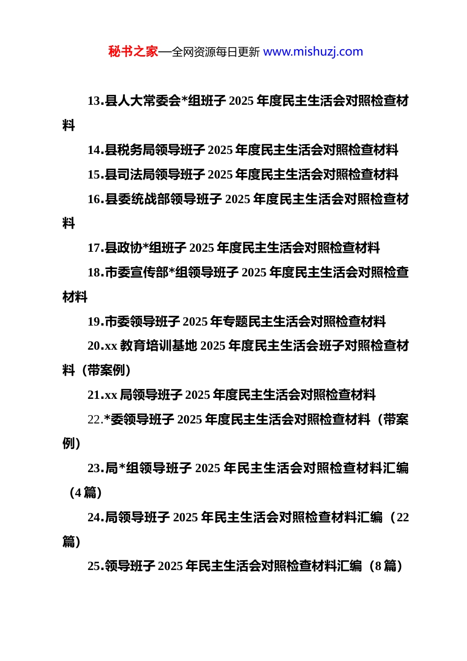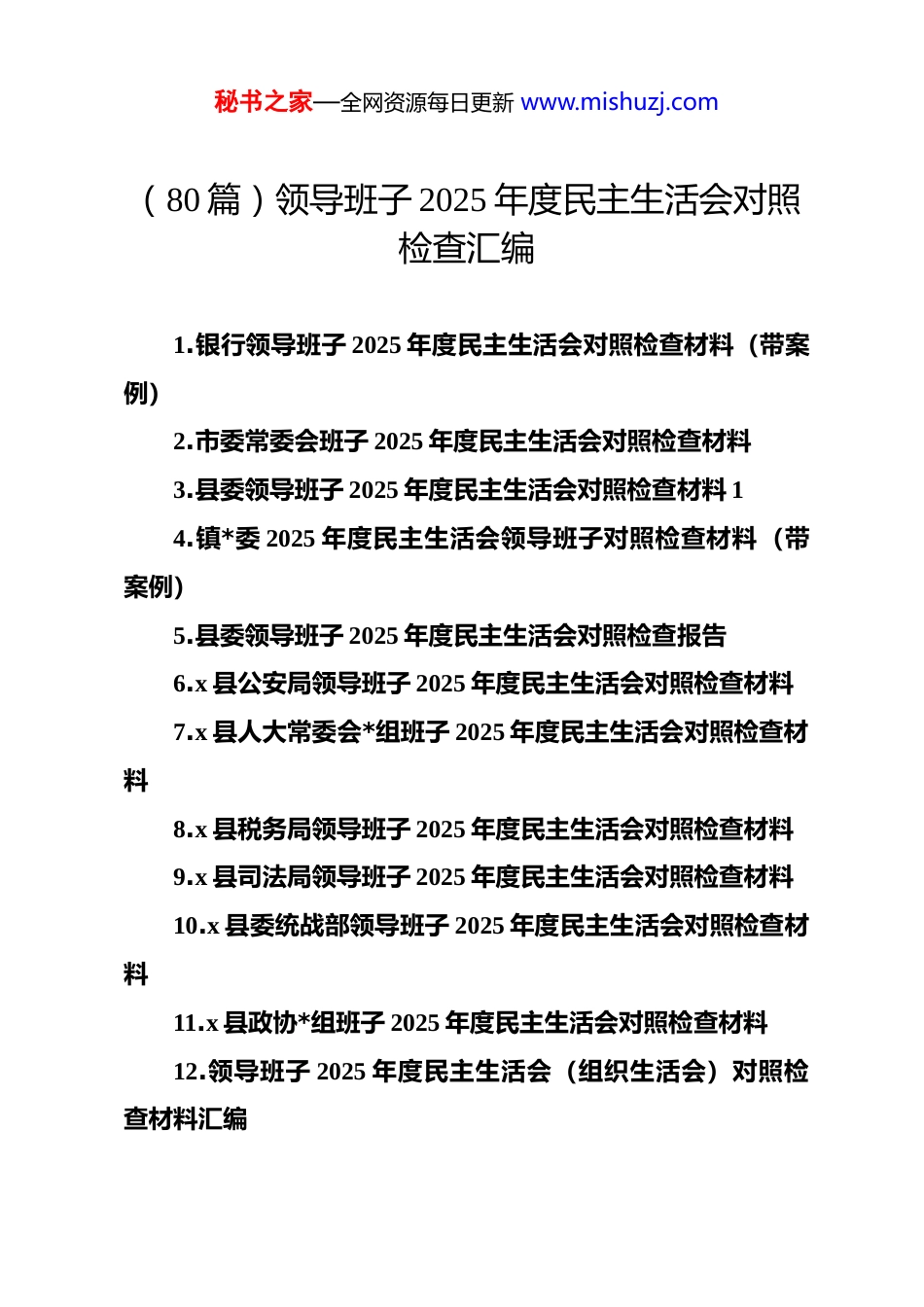 秘书之家—全网资源每日更新 www.mishuzj.com(80 篇)领导班子 2025 年度民主生活会对照检查汇编1.银行领导班子 2025 年度民主生活会对照检查材料(带案例)2.市委常委会班子 2025 年度民主生活会对照检查材料3.县委领导班子 2025 年度民主生活会对照检查材料 14.镇*委 2025 年度民主生活会领导班子对照检查材料(带案例)5.县委领导班子 2025 年度民主生活会对照检查报告6.x 县公安局领导班子 2025 年度民主生活会对照检查材料7.x 县人大常委会*组班子 2025 年度民主生活会对照检查材料8.x 县税务局领导班子 2025 年度民主生活会对照检查材料9.x 县司法局领导班子 2025 年度民主生活会对照检查材料10.x 县委统战部领导班子 2025 年度民主生活会对照检查材料11.x 县政协*组班子 2025 年度民主生活会对照检查材料12.领导班子 2025 年度民主生活会(组织生活会)对照检查材料汇编秘书之家—全网资源每日更新 www.mishuzj.com13.县人大常委会*组班子 2025 年度民主生活会对照检查材料14.县税务局领导班子 2025 年度民主生活会对照检查材料15.县司法局领导班子 2025 年度民主生活会对照检查材料16.县委统战部领导班子 2025 年度民主生活会对照检查材料17.县政协*组班子 2025 年度民主生活会对照检查材料18.市委宣传部*组领导班子 2025 年度民主生活会对照检查材料19.市委领导班子 2025 年专题民主生活会对照检查材料20.xx 教育培训基地 2025 年度民主生活会班子对照检查材料(带案例)21.xx 局领导班子 2025 年度民主生活会对照检查材料22.*委领导班子 2025 年度民主生活会对照检查材料(带案例)23.局*组领导班子 2025 年民主生活会对照检查材料汇编(4 篇)24.局领导班子 2025 年民主生活会对照检查材料汇编(22篇)25.领导班子 2025 年民主生活会对照检查材料汇编(8 篇)秘书之家—全网资源每日更新 www.mishuzj.com(集团公司)26.县委、区委领导班子 2025 年民主生活会对照检查材料汇编(8 篇)27.县政府办*组领导班子 2025 年民主生活会对照检查材料28.县人大常委会*组领导班子 2025 年度专题民主生活会对照检查材料29.乡镇*委班子 2025 年度民主生活会“五个带头”对照检查材料30.中央国企*委班子 2025 年度民主生活会对照检查材料31.2025 年度市税务局领导班子民主生活会对照检查材料32.公司领导班子 2025 年度民主生活会对照检查材料,(五个带头)33.国企*委班子 2025 年度民主生活会对照检查材料34.局 2025 年度民主生活会班子对照检查材料(五个带头)35.县工商联领导班子 2025 年度民主生活会对照检查材料(五个带头)36.县红十字会领导班子 2025 年度民主生活会对照检查材料(五个带头)37.银行班子成员 2025 年度民主生活会个人对照检查材料秘书之家—全网资源每日更新 www.mishuzj.com(五个带头)38.镇*委班子 2025 年度民主生活会对照检查材料(带案例)39.镇领导班子 2025 年度民主生活会对照检查材料.(带案例)银行领导班子 2025 年度民主生活会对照检查材料(带案例)根据省委、市委和总行*委关于召开 2025 年度民主生活会的统一部署和要求,xx 分行领导班子紧扣“深入学习贯彻**************思想,全面贯彻落实*的二十届三中、四中全会精神,深入贯彻落实******重要讲话和****批示精神,以打攻坚战、持久战的决心和恒心,锲而不舍落实中央八项规定精神,推进作风建设常态化长效化,以优良作风凝心聚力、真抓实干,聚焦高质量发展首要任务,扎实推进中国式现代化,为实现‘十五五’良好开局奠定坚实基础”这一主题,在扎实开展学习研讨、广泛征求意见建议、深入进行谈心谈话的基础上,全面查摆问题,深刻剖析根源,明确整改方向。现将班子对照检查情况报告如下。一、会前学习研讨情况分行*委高度重视此次民主生活会的会前学习环节,将其作秘书之家—全网资源每日更新 www.mishuzj.com为统一思想、深化认识、筑牢开好民主生活会思想基础的关键步骤。班子成员坚持以上率下,采取*委理论学习中心组集体学习与个人自学相结合、专题研讨与实践感悟相补充的...