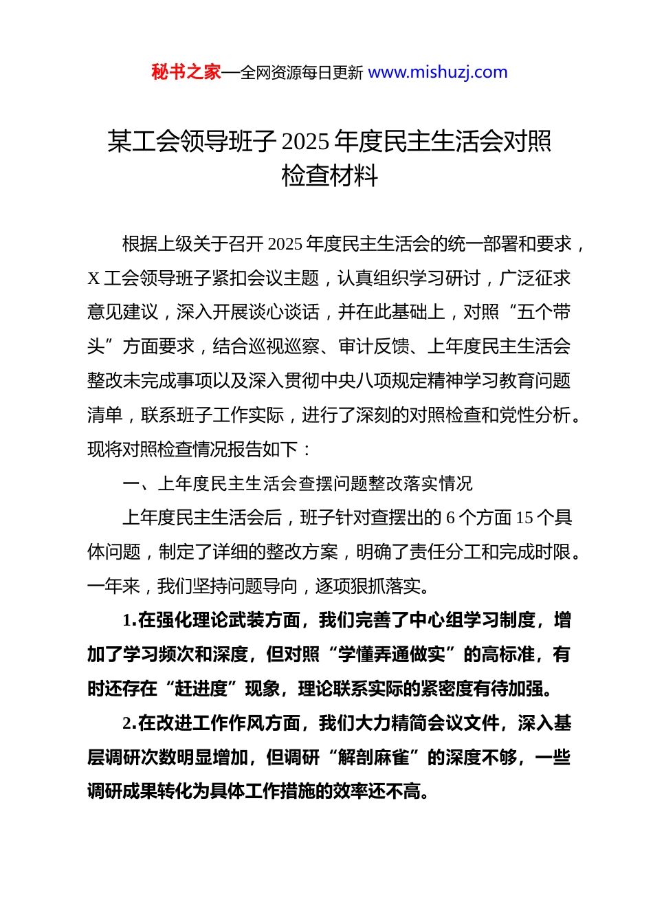秘书之家—全网资源每日更新 www.mishuzj.com某工会领导班子 2025 年度民主生活会对照检查材料 根据上级关于召开 2025 年度民主生活会的统一部署和要求,X 工会领导班子紧扣会议主题,认真组织学习研讨,广泛征求意见建议,深入开展谈心谈话,并在此基础上,对照“五个带头”方面要求,结合巡视巡察、审计反馈、上年度民主生活会整改未完成事项以及深入贯彻中央八项规定精神学习教育问题清单,联系班子工作实际,进行了深刻的对照检查和党性分析。现将对照检查情况报告如下:一、上年度民主生活会查摆问题整改落实情况上年度民主生活会后,班子针对查摆出的 6 个方面 15 个具体问题,制定了详细的整改方案,明确了责任分工和完成时限。一年来,我们坚持问题导向,逐项狠抓落实。1.在强化理论武装方面,我们完善了中心组学习制度,增加了学习频次和深度,但对照“学懂弄通做实”的高标准,有时还存在“赶进度”现象,理论联系实际的紧密度有待加强。2.在改进工作作风方面,我们大力精简会议文件,深入基层调研次数明显增加,但调研“解剖麻雀”的深度不够,一些调研成果转化为具体工作措施的效率还不高。秘书之家—全网资源每日更新 www.mishuzj.com3.在服务职工群众方面,我们加大了困难职工帮扶力度,拓展了普惠服务项目,但在回应新就业形态劳动者多元化、个性化诉求方面,服务的精准性和有效性还需提升。4.在全面从严治党方面,我们严格落实了“一岗双责”,加强了干部日常教育管理,但在运用批评与自我批评武器常态化监督提醒上,辣味仍显不足,存在“好人主义”倾向。总体看,上年度查摆的问题大部分已整改到位,但仍有 3个问题需要持续用力:一是工会改革向基层延伸的力度不平衡;二是干部队伍担当作为的锐气仍需提振;三是一些长期存在的形式主义顽疾尚未根除。这些问题已纳入本次民主生活会对照检查内容,我们将一并进行深刻剖析,务求彻底解决。二、存在的突出问题(一)带头强化政治忠诚、提高政治能力方面。班子能够自觉增强“四个意识”、坚定“四个自信”、做到“两个维护”,但深挖细查,仍存在一些差距。一是政治判断力的敏锐度有待加强。有时对国内外形势复杂变化给职工队伍带来的深刻影响认识不够超前,对意识形态领域可能出现的风险隐患洞察力不足,比如,在对职工群众进行思想引导时,对一些模糊认识或错误言论的批驳不够及时有力,未能总是做到防患于未然。二是政治领悟力的深度有待拓展。对党的创新理论,特别秘书之家—全网资源每日更新 www.mishuzj.com是习近平总书记关于工人阶级和工会工作的重要论述,虽然组织了学习,但有时满足于“读过了”“学过了”,对其蕴含的马克思主义立场、观点、方法掌握不够透彻,在如何创造性转化为推动 X 工运事业发展的具体思路和举措上,思考不深、办法不多。三是政治执行力的刚性有待提升。在落实党中央决策部署和上级工会要求时,有时存在“等靠要”思想,结合 X 实际进行再细化、再创新的主动性不足,个别工作存在“上下一般粗”的现象。比如,在推进产业工人队伍建设改革中,对于一些需要多方协调、攻坚克难的环节,存在畏难情绪,导致改革成效未能完全达到预期。(二)带头固本培元、增强党性方面。班子始终重视党性锻炼,但对照更高标准,修身正己的功夫还需下得更深。一是理论武装的自觉性系统性仍需增强。学习安排有时被动跟随上级部署多,主动谋划、系统设计不足,学习内容碎片化,缺乏“挤”和“钻”的精神。班子成员个人自学抓得紧度不一,导致理论功底深浅不均,运用党的创新理论指导实践、推动工作的能力存在短板。二是党性锤炼的韧劲和标准有所松懈。随着工作事务性增多,有时不自觉地放松了对主观世界的持续改造,艰苦奋斗、锐意进取的精神有所减退。在严格的党内政治生活锻炼上,有时满足于完成“规定动作”,主动拿起批评与自我秘书之家—全网资源每日更新 www.mishuzj.com批评武器进行思想交锋、灵魂触动的力度不够,自我革命的精神有所弱化。三是宗旨意识树立得不够牢固。虽然经常讲“以职工为中心”,但在实际工作中,有时习惯于坐在办公室听汇报、看材料,深入一线、深入职工,...
