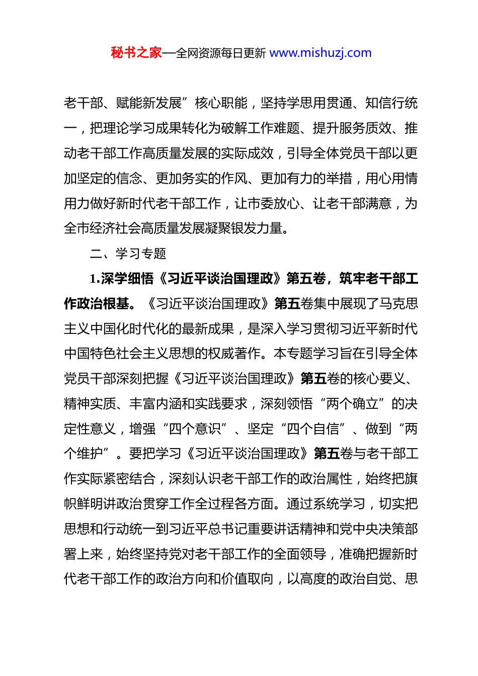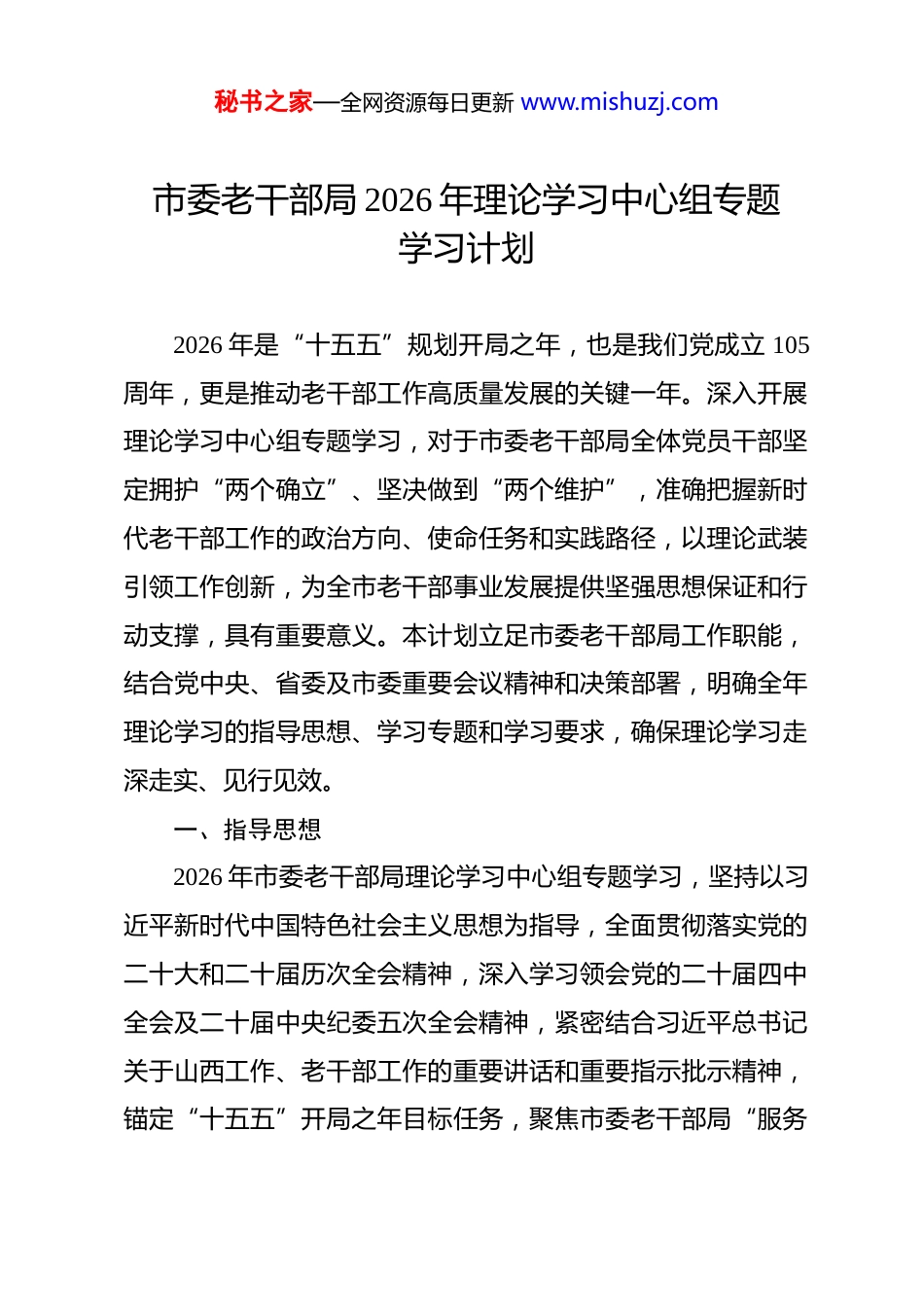 秘书之家—全网资源每日更新 www.mishuzj.com市委老干部局 2026 年理论学习中心组专题学习计划 2026 年是“十五五”规划开局之年,也是我们党成立 105周年,更是推动老干部工作高质量发展的关键一年。深入开展理论学习中心组专题学习,对于市委老干部局全体党员干部坚定拥护“两个确立”、坚决做到“两个维护”,准确把握新时代老干部工作的政治方向、使命任务和实践路径,以理论武装引领工作创新,为全市老干部事业发展提供坚强思想保证和行动支撑,具有重要意义。本计划立足市委老干部局工作职能,结合党中央、省委及市委重要会议精神和决策部署,明确全年理论学习的指导思想、学习专题和学习要求,确保理论学习走深走实、见行见效。一、指导思想2026 年市委老干部局理论学习中心组专题学习,坚持以习近平新时代中国特色社会主义思想为指导,全面贯彻落实党的二十大和二十届历次全会精神,深入学习领会党的二十届四中全会及二十届中央纪委五次全会精神,紧密结合习近平总书记关于山西工作、老干部工作的重要讲话和重要指示批示精神,锚定“十五五”开局之年目标任务,聚焦市委老干部局“服务秘书之家—全网资源每日更新 www.mishuzj.com老干部、赋能新发展”核心职能,坚持学思用贯通、知信行统一,把理论学习成果转化为破解工作难题、提升服务质效、推动老干部工作高质量发展的实际成效,引导全体党员干部以更加坚定的信念、更加务实的作风、更加有力的举措,用心用情用力做好新时代老干部工作,让市委放心、让老干部满意,为全市经济社会高质量发展凝聚银发力量。二、学习专题1.深学细悟《习近平谈治国理政》第五卷,筑牢老干部工作政治根基。《习近平谈治国理政》第五卷集中展现了马克思主义中国化时代化的最新成果,是深入学习贯彻习近平新时代中国特色社会主义思想的权威著作。本专题学习旨在引导全体党员干部深刻把握《习近平谈治国理政》第五卷的核心要义、精神实质、丰富内涵和实践要求,深刻领悟“两个确立”的决定性意义,增强“四个意识”、坚定“四个自信”、做到“两个维护”。要把学习《习近平谈治国理政》第五卷与老干部工作实际紧密结合,深刻认识老干部工作的政治属性,始终把旗帜鲜明讲政治贯穿工作全过程各方面。通过系统学习,切实把思想和行动统一到习近平总书记重要讲话精神和党中央决策部署上来,始终坚持党对老干部工作的全面领导,准确把握新时代老干部工作的政治方向和价值取向,以高度的政治自觉、思秘书之家—全网资源每日更新 www.mishuzj.com想自觉和行动自觉,扎实做好老干部思想政治建设、党组织建设等工作,引导广大老干部始终牢记初心使命,自觉拥护党中央权威和集中统一领导。要以理论学习强化政治担当,主动把老干部工作融入全市发展大局,找准工作切入点和着力点,以高质量服务彰显政治本色,让老干部在政治上有归属感、思想上有依靠感、生活上有幸福感。2.深入学习习近平总书记关于党的自我革命的重要思想,锻造过硬老干部工作队伍。习近平总书记关于党的自我革命的重要思想,是习近平新时代中国特色社会主义思想的重要组成部分,为新时代推进全面从严治党提供了根本遵循。本专题学习重点围绕习近平总书记在二十届中央纪委五次全会上的重要讲话精神,结合《中国共产党第二十届中央纪律检查委员会第五次全体会议公报》要求,深刻领会党的自我革命的重大意义、丰富内涵和实践要求。要深刻认识到,老干部工作队伍是党联系服务老干部的桥梁纽带,队伍的纯洁性和战斗力直接关系工作成效,必须以自我革命精神加强自身建设。通过学习《习近平著作选读》第一卷、第二卷中关于党的建设的重要论述,牢固树立纪律意识和规矩意识,持之以恒推进全面从严治党,严格落实中央八项规定及其实施细则精神,坚决纠治形式主义、官僚主义。要把自我革命要求融入队伍建设各环节,加强党性秘书之家—全网资源每日更新 www.mishuzj.com锻炼、能力提升和作风锤炼,着力打造政治强、业务精、作风实、纪律严的老干部工作队伍,以过硬作风为老干部提供精准化、精细化服务,以清廉形象赢得老干部信任和支持。3.学习贯彻党的二十届四中全会精神,锚定老干部工...
