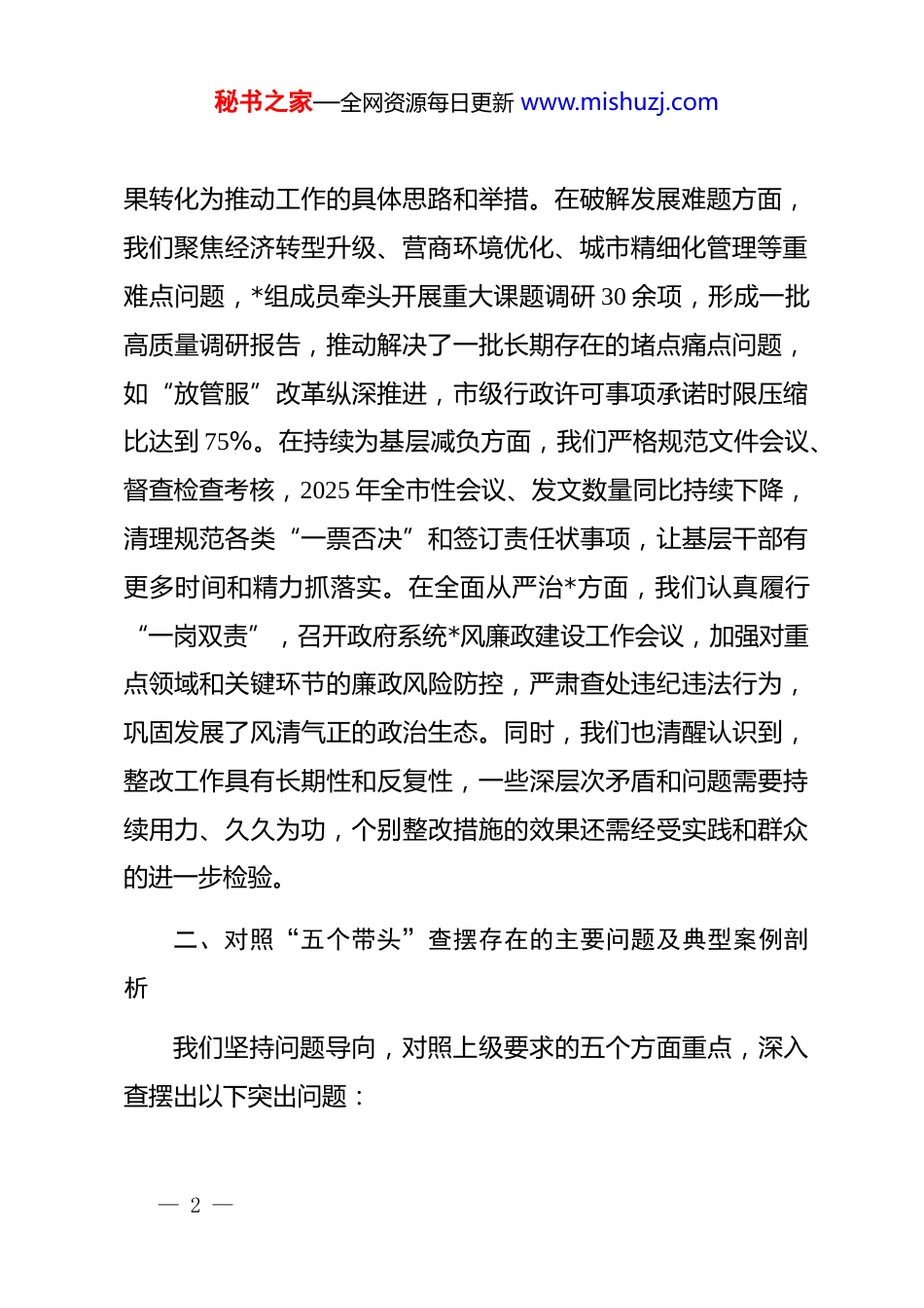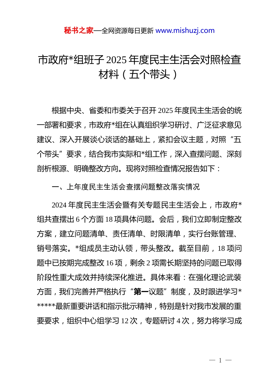 秘书之家—全网资源每日更新 www.mishuzj.com市政府*组班子 2025 年度民主生活会对照检查材料(五个带头)根据中央、省委和市委关于召开 2025 年度民主生活会的统一部署和要求,市政府*组在认真组织学习研讨、广泛征求意见建议、深入开展谈心谈话的基础上,紧扣会议主题,对照“五个带头”要求,结合我市实际和*组工作,深入查摆问题、深刻剖析根源、明确整改方向。现将对照检查情况报告如下:一、上年度民主生活会查摆问题整改落实情况2024 年度民主生活会暨有关专题民主生活会上,市政府*组共查摆出 6 个方面 18 项具体问题。会后,我们立即制定整改方案,建立问题清单、责任清单、时限清单,实行台账管理、销号落实。*组成员主动认领,带头整改。截至目前,18 项问题中已按期完成整改 16 项,剩余 2 项需长期坚持的问题已取得阶段性重大成效并持续深化推进。具体来看:在强化理论武装方面,我们完善并严格执行“第一议题”制度,及时跟进学习******最新重要讲话和指示批示精神,特别是针对我市发展的重要要求,组织中心组学习 12 次,专题研讨 4 次,努力将学习成— 1 —秘书之家—全网资源每日更新 www.mishuzj.com果转化为推动工作的具体思路和举措。在破解发展难题方面,我们聚焦经济转型升级、营商环境优化、城市精细化管理等重难点问题,*组成员牵头开展重大课题调研 30 余项,形成一批高质量调研报告,推动解决了一批长期存在的堵点痛点问题,如“放管服”改革纵深推进,市级行政许可事项承诺时限压缩比达到 75%。在持续为基层减负方面,我们严格规范文件会议、督查检查考核,2025 年全市性会议、发文数量同比持续下降,清理规范各类“一票否决”和签订责任状事项,让基层干部有更多时间和精力抓落实。在全面从严治*方面,我们认真履行“一岗双责”,召开政府系统*风廉政建设工作会议,加强对重点领域和关键环节的廉政风险防控,严肃查处违纪违法行为,巩固发展了风清气正的政治生态。同时,我们也清醒认识到,整改工作具有长期性和反复性,一些深层次矛盾和问题需要持续用力、久久为功,个别整改措施的效果还需经受实践和群众的进一步检验。二、对照“五个带头”查摆存在的主要问题及典型案例剖析我们坚持问题导向,对照上级要求的五个方面重点,深入查摆出以下突出问题:— 2 —秘书之家—全网资源每日更新 www.mishuzj.com(一)在带头强化政治忠诚、提高政治能力方面*组的政治敏锐性和政治鉴别力有待进一步加强。有时对中央的重大决策部署和省委、市委的工作要求,虽然能够及时组织传达学习,但在结合我市实际创造性地贯彻落实上,思考谋划不够深透,存在一定的“等靠要”思想,主动对接、争取政策支持的力度和时效性有待提升。比如,在争取国家重大科技基础设施布局、承接产业转移示范区建设等机遇面前,前期研究不够充分,反应不够迅速,导致错失了一些先机。政治能力训练也有不足,*组成员在面对复杂敏感问题时,有时习惯于凭经验处理,从政治高度观察、分析和解决问题的能力还需锤炼。在引导政府系统*员干部不断提高政治判断力、政治领悟力、政治执行力方面,系统性谋划和针对性举措还不多,个别部门和干部在执行过程中存在理解偏差、打折扣、搞变通的现象。落实意识形态工作责任制有时不够到位,对网络舆情、社会思潮中的风险点排查研判不够及时深入,阵地管理存在薄弱环节。(二)在带头固本培元、增强*性方面理论学习的系统性、深入性仍有差距。虽然能够坚持集体学习,但个人自学的主动性、系统性不够强,对**************思想的整体把握、融会贯通还有不足,存在“碎片化”现象。— 3 —秘书之家—全网资源每日更新 www.mishuzj.com运用*的创新理论指导实践、破解难题的能力有待提高,比如,在运用新发展理念统筹发展和安全、推动绿色低碳转型等方面,思路还不够开阔,创新性举措不多。*性锻炼的主动性、经常性不够。严格执行双重组织生活制度有时不到位,以普通*员身份参加支部活动有时存在“摆拍”现象,批评与自我批评的“辣味”不足,更多是工作建议,触及思想灵魂深处不够。理想信念教育的方式方法有待创新,满足于开会...