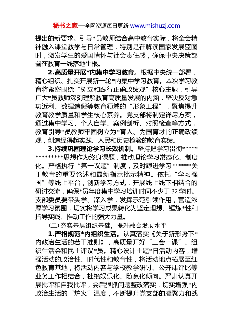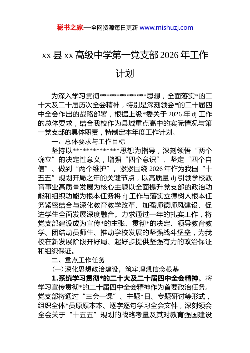秘书之家—全网资源每日更新 www.mishuzj.comxx 县 xx 高级中学第一党支部 2026 年工作计划为深入学习贯彻**************思想,全面落实*的二十大及二十届历次全会精神,特别是深刻领会*的二十届四中全会作出的战略部署,根据上级*委关于 2026 年 dj 工作的总体要求,结合我校作为县域重点高中的实际情况与第一党支部的具体职责,特制定本年度工作计划。一、总体要求与工作目标坚持以**************思想为指导,深刻领悟“两个确立”的决定性意义,增强“四个意识”、坚定“四个自信”、做到“两个维护”。紧紧围绕 2026 年作为我国“十五五”规划开局之年的关键节点,以高质量 dj 引领学校教育事业高质量发展为核心主题以全面提升党支部的政治功能和组织功能为根本任务将 dj 工作与落实立德树人根本任务紧密结合与深化教育教学改革、加强师德师风建设、促进学生全面发展深度融合。力求通过一年的扎实工作,将党支部建设成为宣传*的主张、贯彻*的决定、领导教育教学、团结动员师生、推动学校发展的坚强战斗堡垒,为我校在新发展阶段开好局、起好步提供坚强有力的政治保证和组织保证。二、重点工作任务(一)深化思想政治建设,筑牢理想信念根基1.系统学习贯彻*的二十大及二十届四中全会精神。将学习宣传贯彻*的二十届四中全会精神作为首要政治任务。党支部将通过“三会一课”、主题*日、专题研讨等形式,组织全体*员原原本本、逐字逐句学习全会文件,深刻领会全会关于“十五五”规划的战略考量及其对教育强国建设秘书之家—全网资源每日更新 www.mishuzj.com提出的新要求。引导*员教师结合高中教育实际,将全会精神融入课堂教学与日常管理,特别是在解读国家发展蓝图时,激发学生的爱国情怀与社会责任感,确保中央决策部署在教育一线落地生根。2.高质量开展*内集中学习教育。根据中央统一部署,精心组织、扎实开展新一轮*内集中学习教育。本次学习教育将紧密围绕“树立和践行正确政绩观”核心主题,引导广大*员教师深刻理解教育高质量发展的内涵,坚决反对急功近利、数据造假等教育领域的“形象工程”,聚焦提升教育教学质量和学生核心素养。党支部将制定详尽方案,通过集中学习、个人自学、案例剖析、对照检查等方式,教育引导*员教师牢固树立为*育人、为国育才的正确政绩观,创造经得起实践、人民和历史检验的教育实绩。3.持续巩固理论学习长效机制。坚持把学习贯彻**************思想作为终身课题,推动理论学习常态化、制度化。严格执行“第一议题”制度,及时跟进学习******关于教育的重要论述和最新指示批示精神。依托“学习强国”等线上平台,创新学习方式,开展线上线下相结合的研讨交流,确保*员年度集中学习培训时间不少于 32 学时。支部委员要带头学、深入学,发挥示范引领作用,营造浓厚学习氛围,切实将学习成果转化为坚定理想、锤炼*性和指导实践、推动工作的强大力量。(二)夯实基层组织基础,提升融合发展水平1.严格规范*内组织生活。认真落实《关于新形势下*内政治生活的若干准则》,高质量开好“三会一课”、组织生活会和民主评议*员。精心设计主题*日活动内容,增强活动的政治性、时代性和教育性,将活动地点拓展至红色教育基地,将活动内容与学校教学研讨、公开课评比等业务工作相结合,杜绝娱乐化、随意化倾向。严肃认真开展批评和自我批评,会后狠抓问题整改落实,切实增强*内政治生活的“炉火”温度,不断提升党支部的凝聚力和战秘书之家—全网资源每日更新 www.mishuzj.com斗力。2.加强*员队伍教育管理与结构优化。坚持政治标准,严格程序做好*员发展工作,重点在教学一线的优秀青年骨干教师中发展*员,持续优化*员队伍的年龄、学科和梯队结构,为*组织注入新鲜血液。加强对预备*员和入*积极分子的培养考察。强化*员日常监督管理,通过设立“*员示范岗”“*员责任区”,深化*员设岗定责、承诺践诺活动组织*员教师在教育教学改革、帮扶学困生、家校沟通等方面亮身份、当先锋、作表率,切实解决服务师生“最后一公里”问题。3.推动 dj 与教育教学业务深度融合。坚决克服 dj 与业务工作“两张皮”现象推动 dj 工作与学校中心工作同谋...