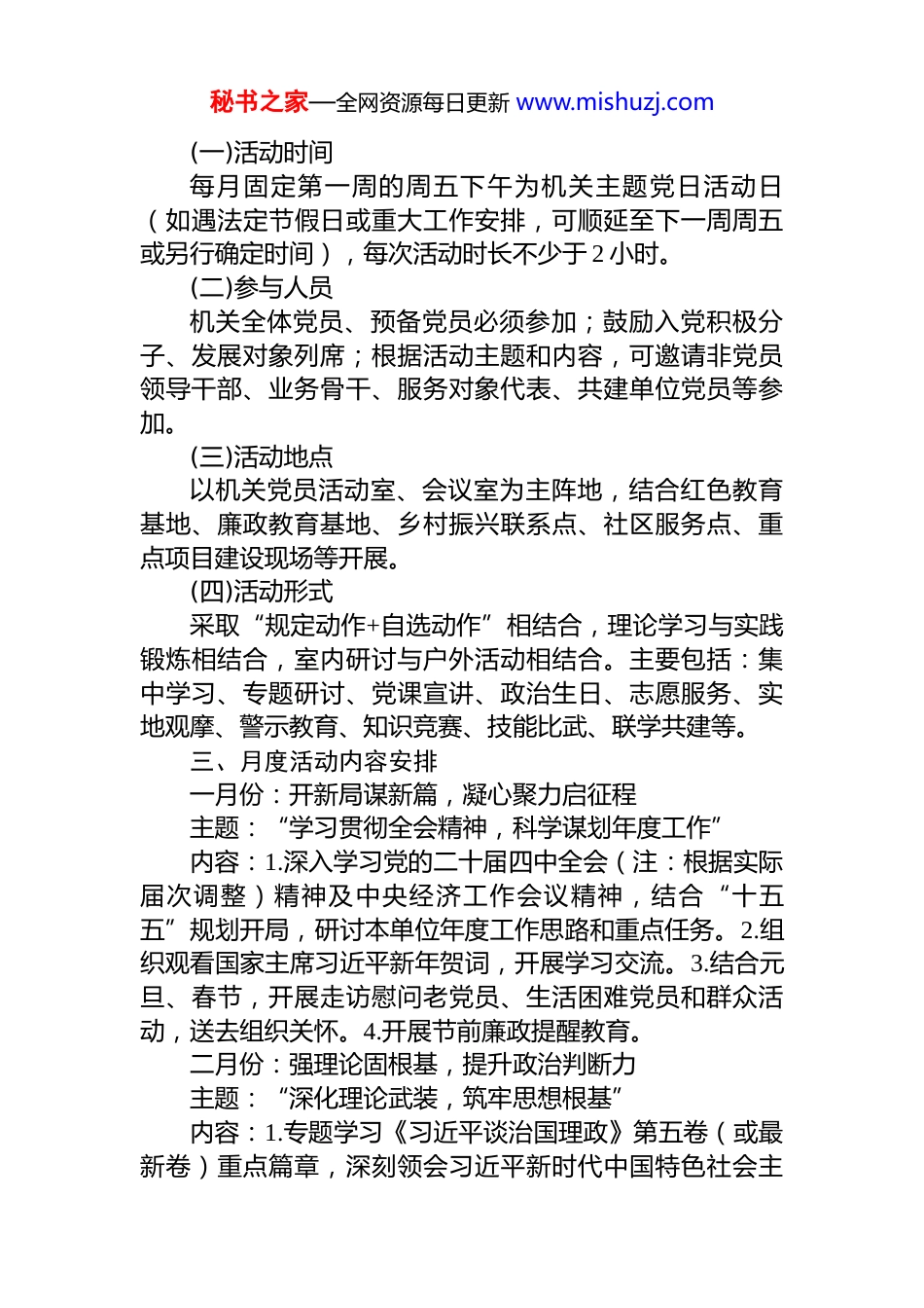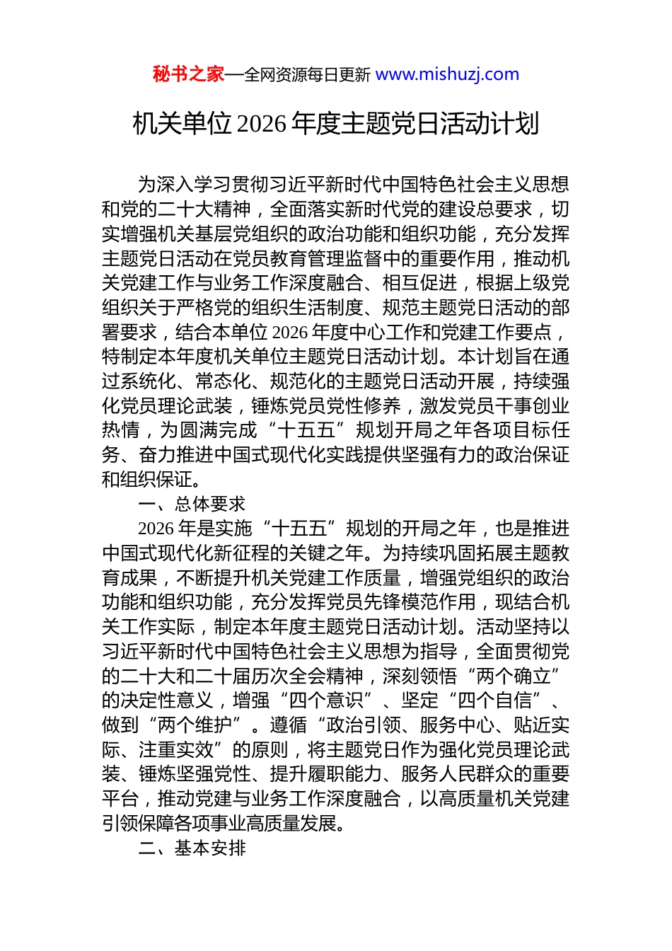 秘书之家—全网资源每日更新 www.mishuzj.com机关单位 2026 年度主题党日活动计划为深入学习贯彻习近平新时代中国特色社会主义思想和党的二十大精神,全面落实新时代党的建设总要求,切实增强机关基层党组织的政治功能和组织功能,充分发挥主题党日活动在党员教育管理监督中的重要作用,推动机关党建工作与业务工作深度融合、相互促进,根据上级党组织关于严格党的组织生活制度、规范主题党日活动的部署要求,结合本单位 2026 年度中心工作和党建工作要点,特制定本年度机关单位主题党日活动计划。本计划旨在通过系统化、常态化、规范化的主题党日活动开展,持续强化党员理论武装,锤炼党员党性修养,激发党员干事创业热情,为圆满完成“十五五”规划开局之年各项目标任务、奋力推进中国式现代化实践提供坚强有力的政治保证和组织保证。一、总体要求2026 年是实施“十五五”规划的开局之年,也是推进中国式现代化新征程的关键之年。为持续巩固拓展主题教育成果,不断提升机关党建工作质量,增强党组织的政治功能和组织功能,充分发挥党员先锋模范作用,现结合机关工作实际,制定本年度主题党日活动计划。活动坚持以习近平新时代中国特色社会主义思想为指导,全面贯彻党的二十大和二十届历次全会精神,深刻领悟“两个确立”的决定性意义,增强“四个意识”、坚定“四个自信”、做到“两个维护”。遵循“政治引领、服务中心、贴近实际、注重实效”的原则,将主题党日作为强化党员理论武装、锤炼坚强党性、提升履职能力、服务人民群众的重要平台,推动党建与业务工作深度融合,以高质量机关党建引领保障各项事业高质量发展。二、基本安排秘书之家—全网资源每日更新 www.mishuzj.com(一)活动时间每月固定第一周的周五下午为机关主题党日活动日(如遇法定节假日或重大工作安排,可顺延至下一周周五或另行确定时间),每次活动时长不少于 2 小时。(二)参与人员机关全体党员、预备党员必须参加;鼓励入党积极分子、发展对象列席;根据活动主题和内容,可邀请非党员领导干部、业务骨干、服务对象代表、共建单位党员等参加。(三)活动地点以机关党员活动室、会议室为主阵地,结合红色教育基地、廉政教育基地、乡村振兴联系点、社区服务点、重点项目建设现场等开展。(四)活动形式采取“规定动作+自选动作”相结合,理论学习与实践锻炼相结合,室内研讨与户外活动相结合。主要包括:集中学习、专题研讨、党课宣讲、政治生日、志愿服务、实地观摩、警示教育、知识竞赛、技能比武、联学共建等。三、月度活动内容安排一月份:开新局谋新篇,凝心聚力启征程主题:“学习贯彻全会精神,科学谋划年度工作”内容:1.深入学习党的二十届四中全会(注:根据实际届次调整)精神及中央经济工作会议精神,结合“十五五”规划开局,研讨本单位年度工作思路和重点任务。2.组织观看国家主席习近平新年贺词,开展学习交流。3.结合元旦、春节,开展走访慰问老党员、生活困难党员和群众活动,送去组织关怀。4.开展节前廉政提醒教育。二月份:强理论固根基,提升政治判断力主题:“深化理论武装,筑牢思想根基”内容:1.专题学习《习近平谈治国理政》第五卷(或最新卷)重点篇章,深刻领会习近平新时代中国特色社会主秘书之家—全网资源每日更新 www.mishuzj.com义思想的核心要义。 2.结合“2·19”邓小平逝世纪念日(1997 年),回顾改革开放历程,深化对中国特色社会主义的理解。3.组织学习中央一号文件精神(若发布),研讨服务“三农”工作举措。4.开展“书香机关”读书分享活动。三月份:学雷锋践宗旨,服务群众暖人心主题:“弘扬雷锋精神,践行初心使命”内容:1.结合“学雷锋纪念日”(3 月 5 日),组织党员深入社区、街头开展政策宣传、环境整治、扶弱助残等志愿服务活动。2.结合“三八”国际妇女节(3 月 8 日),开展关爱女性职工、学习巾帼榜样活动。3.结合“3·12”植树节,开展义务植树或护绿环保主题党日。4.结合“3·15”国际消费者权益日,开展相关法律法规宣传(若职能相关)。四月份:忆先烈承遗志,红色基因永流传主题:“缅怀革命先烈,传承红色基因”内容:1.清明节前后...