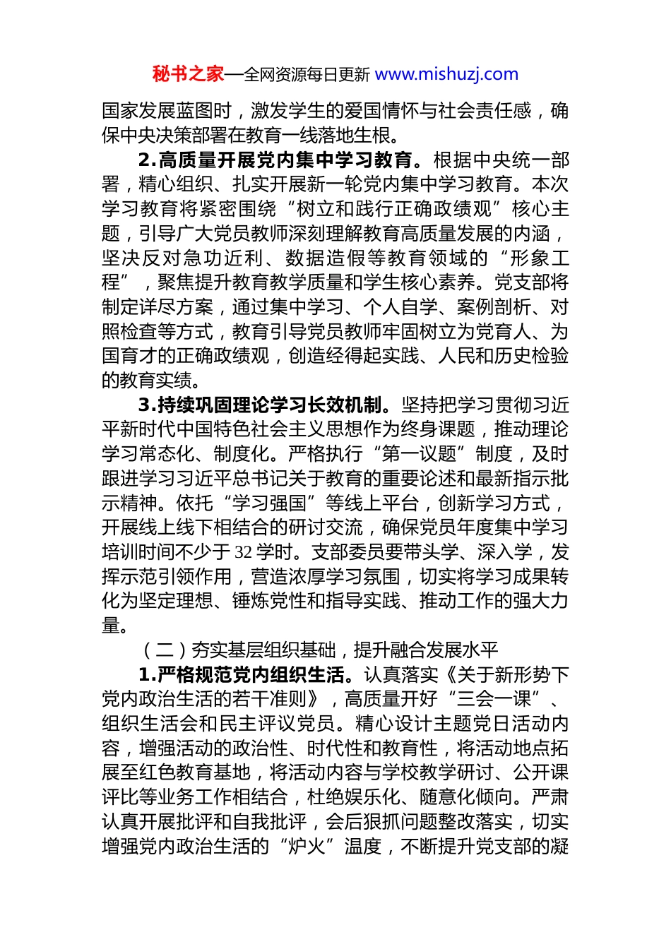 秘书之家—全网资源每日更新 www.mishuzj.com学校党支部 2026 年工作计划为深入学习贯彻习近平新时代中国特色社会主义思想,全面落实党的二十大及二十届历次全会精神,特别是深刻领会党的二十届四中全会作出的战略部署,根据上级党委关于 2026 年党建工作的总体要求,结合我校作为县域重点高中的实际情况与第一党支部的具体职责,特制定本年度工作计划。一、总体要求与工作目标坚持以习近平新时代中国特色社会主义思想为指导,深刻领悟“两个确立”的决定性意义,增强“四个意识”、坚定“四个自信”、做到“两个维护”。紧紧围绕2026 年作为我国“十五五”规划开局之年的关键节点,以高质量党建引领学校教育事业高质量发展为核心主题以全面提升党支部的政治功能和组织功能为根本任务将党建工作与落实立德树人根本任务紧密结合与深化教育教学改革、加强师德师风建设、促进学生全面发展深度融合。力求通过一年的扎实工作,将党支部建设成为宣传党的主张、贯彻党的决定、领导教育教学、团结动员师生、推动学校发展的坚强战斗堡垒,为我校在新发展阶段开好局、起好步提供坚强有力的政治保证和组织保证。二、重点工作任务(一)深化思想政治建设,筑牢理想信念根基1.系统学习贯彻党的二十大及二十届四中全会精神。将学习宣传贯彻党的二十届四中全会精神作为首要政治任务。党支部将通过“三会一课”、主题党日、专题研讨等形式,组织全体党员原原本本、逐字逐句学习全会文件,深刻领会全会关于“十五五”规划的战略考量及其对教育强国建设提出的新要求。引导党员教师结合高中教育实际,将全会精神融入课堂教学与日常管理,特别是在解读秘书之家—全网资源每日更新 www.mishuzj.com国家发展蓝图时,激发学生的爱国情怀与社会责任感,确保中央决策部署在教育一线落地生根。2.高质量开展党内集中学习教育。根据中央统一部署,精心组织、扎实开展新一轮党内集中学习教育。本次学习教育将紧密围绕“树立和践行正确政绩观”核心主题,引导广大党员教师深刻理解教育高质量发展的内涵,坚决反对急功近利、数据造假等教育领域的“形象工程”,聚焦提升教育教学质量和学生核心素养。党支部将制定详尽方案,通过集中学习、个人自学、案例剖析、对照检查等方式,教育引导党员教师牢固树立为党育人、为国育才的正确政绩观,创造经得起实践、人民和历史检验的教育实绩。3.持续巩固理论学习长效机制。坚持把学习贯彻习近平新时代中国特色社会主义思想作为终身课题,推动理论学习常态化、制度化。严格执行“第一议题”制度,及时跟进学习习近平总书记关于教育的重要论述和最新指示批示精神。依托“学习强国”等线上平台,创新学习方式,开展线上线下相结合的研讨交流,确保党员年度集中学习培训时间不少于 32 学时。支部委员要带头学、深入学,发挥示范引领作用,营造浓厚学习氛围,切实将学习成果转化为坚定理想、锤炼党性和指导实践、推动工作的强大力量。(二)夯实基层组织基础,提升融合发展水平1.严格规范党内组织生活。认真落实《关于新形势下党内政治生活的若干准则》,高质量开好“三会一课”、组织生活会和民主评议党员。精心设计主题党日活动内容,增强活动的政治性、时代性和教育性,将活动地点拓展至红色教育基地,将活动内容与学校教学研讨、公开课评比等业务工作相结合,杜绝娱乐化、随意化倾向。严肃认真开展批评和自我批评,会后狠抓问题整改落实,切实增强党内政治生活的“炉火”温度,不断提升党支部的凝秘书之家—全网资源每日更新 www.mishuzj.com聚力和战斗力。2.加强党员队伍教育管理与结构优化。坚持政治标准,严格程序做好党员发展工作,重点在教学一线的优秀青年骨干教师中发展党员,持续优化党员队伍的年龄、学科和梯队结构,为党组织注入新鲜血液。加强对预备党员和入党积极分子的培养考察。强化党员日常监督管理,通过设立“党员示范岗”“党员责任区”,深化党员设岗定责、承诺践诺活动组织党员教师在教育教学改革、帮扶学困生、家校沟通等方面亮身份、当先锋、作表率,切实解决服务师生“最后一公里”问题。3.推动党建与教育教学业务深度融合。坚决克服党建与...