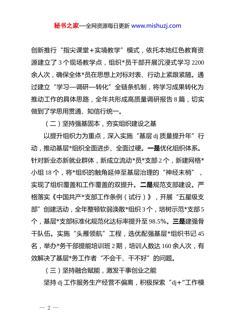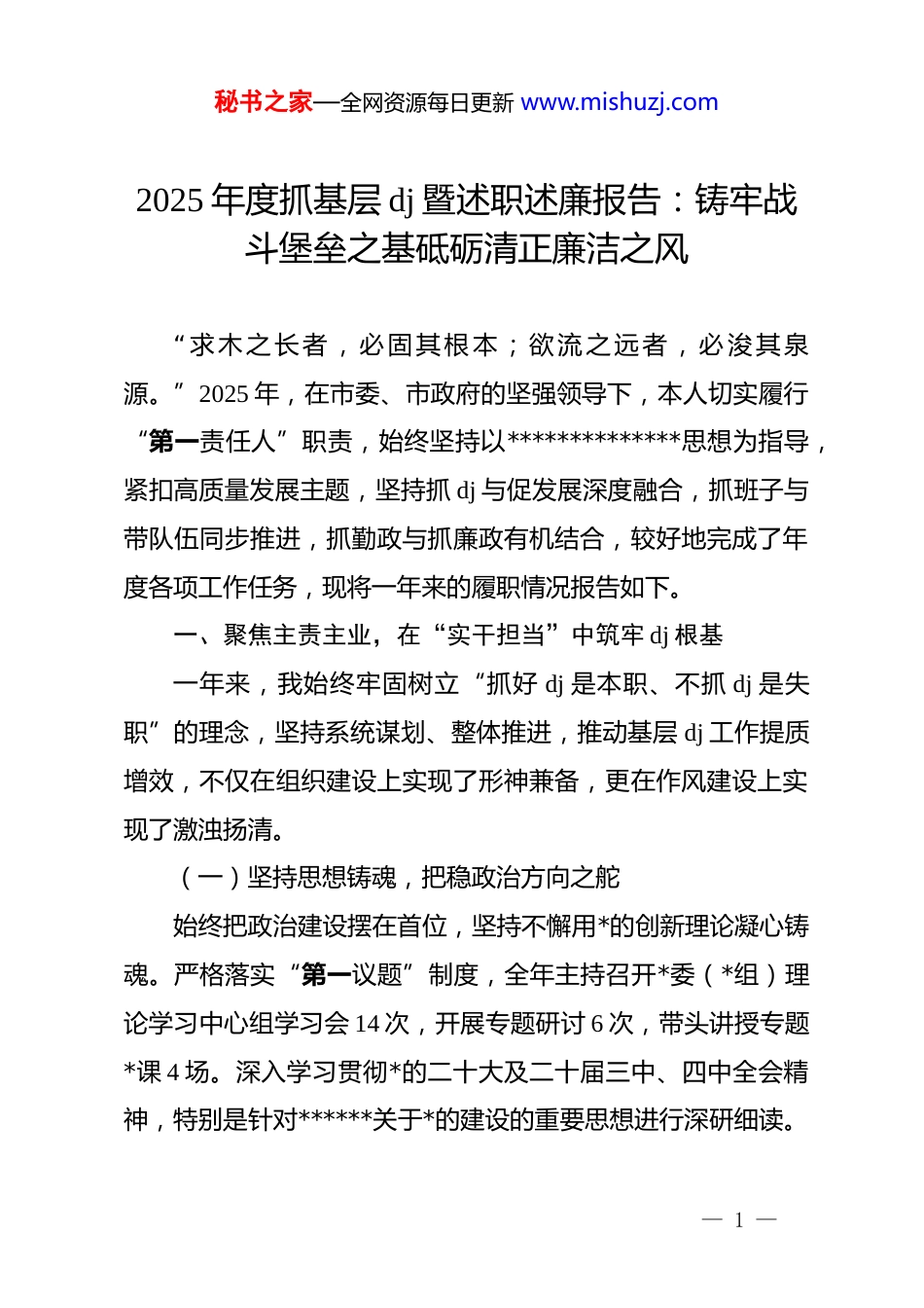 秘书之家—全网资源每日更新 www.mishuzj.com2025 年度抓基层 dj 暨述职述廉报告:铸牢战斗堡垒之基砥砺清正廉洁之风“求木之长者,必固其根本;欲流之远者,必浚其泉源。”2025 年,在市委、市政府的坚强领导下,本人切实履行“第一责任人”职责,始终坚持以**************思想为指导,紧扣高质量发展主题,坚持抓 dj 与促发展深度融合,抓班子与带队伍同步推进,抓勤政与抓廉政有机结合,较好地完成了年度各项工作任务,现将一年来的履职情况报告如下。一、聚焦主责主业,在“实干担当”中筑牢 dj 根基一年来,我始终牢固树立“抓好 dj 是本职、不抓 dj 是失职”的理念,坚持系统谋划、整体推进,推动基层 dj 工作提质增效,不仅在组织建设上实现了形神兼备,更在作风建设上实现了激浊扬清。(一)坚持思想铸魂,把稳政治方向之舵始终把政治建设摆在首位,坚持不懈用*的创新理论凝心铸魂。严格落实“第一议题”制度,全年主持召开*委(*组)理论学习中心组学习会 14 次,开展专题研讨 6 次,带头讲授专题*课 4 场。深入学习贯彻*的二十大及二十届三中、四中全会精神,特别是针对******关于*的建设的重要思想进行深研细读。— 1 —秘书之家—全网资源每日更新 www.mishuzj.com创新推行“指尖课堂+实境教学”模式,依托本地红色教育资源建立了 3 个现场教学点,组织*员干部开展沉浸式学习 2200余人次,确保全体*员在思想上对标对表、行动上紧跟紧随。通过建立“学习—调研—转化”全链条机制,将学习成果转化为推动工作的具体思路,全年共形成高质量调研报告 8 篇,切实做到了学思用贯通、知信行统一。(二)坚持强基固本,夯实组织建设之基以提升组织力为重点,深入实施“基层 dj 质量提升年”行动,推动基层*组织全面进步、全面过硬。一是优化组织体系。针对新业态新就业群体,新成立流动*员*支部 2 个,新建网格*小组 18 个,将*组织的触角延伸至基层治理的“神经末梢”,实现了组织覆盖和工作覆盖的双提升。二是规范支部建设。严格落实《中国共产*支部工作条例(试行)》,开展“五星级支部”创建活动,全年整顿软弱涣散*组织 3 个,培树示范*支部 5个,基层*支部标准化规范化达标率提升至 98.5%。三是建强骨干队伍。实施“头雁领航”工程,选优配强基层*组织书记 45名,举办*务干部提能培训班 2 期,培训人数达 160 余人次,有效解决了基层*务工作者“不会干、干不好”的问题。(三)坚持融合赋能,激发干事创业之能坚持 dj 工作服务生产经营不偏离,积极探索“dj+”工作模— 2 —秘书之家—全网资源每日更新 www.mishuzj.com式,找准 dj 工作与业务工作的结合点。深入开展“*员先锋岗”“*员责任区”创建活动,设立*员示范岗 68 个,划分*员责任区 42 个,引导广大*员在重点项目建设、乡村振兴、基层治理等急难险重任务中亮身份、作表率。全年共组建*员突击队12 支,攻克技术难题和业务瓶颈 15 项,协调解决群众急难愁盼问题 342 件。特别是在年度重点项目推进过程中,实行“支部建在项目上”,通过 dj 联建共建机制,有效化解了征地拆迁、手续办理等难题,推动项目建设提速增效,切实将 dj 优势转化为发展优势。(四)坚持正风肃纪,涵养清正廉洁之风认真履行管*治*政治责任,坚定不移推进*风廉政建设。一是压实主体责任。年初与下级*组织负责人签订《*风廉政建设责任书》35 份,制定年度全面从严治*任务清单和责任清单,形成了一级抓一级、层层抓落实的责任体系。二是强化日常监督。坚持挺纪在前,深化运用监督执纪“四种形态”,特别是第一种形态,全年开展谈心谈话 85 人次,对苗头性、倾向性问题及时咬耳扯袖、红脸出汗。三是筑牢思想防线。常态化开展警示教育,组织观看警示教育片 4 场,参观廉政教育基地 2 次,通报典型案例 6 起,用身边事教育身边人。深入排查廉政风险点,针对重点领域、关键环节制定防控措施 120 余条,扎紧织— 3 —秘书之家—全网资源每日更新 www.mishuzj.com密制度笼子,营造了风清气正的政治生态。二、直面短板弱项,在“深查细照”中检视存在不足在总结成绩...