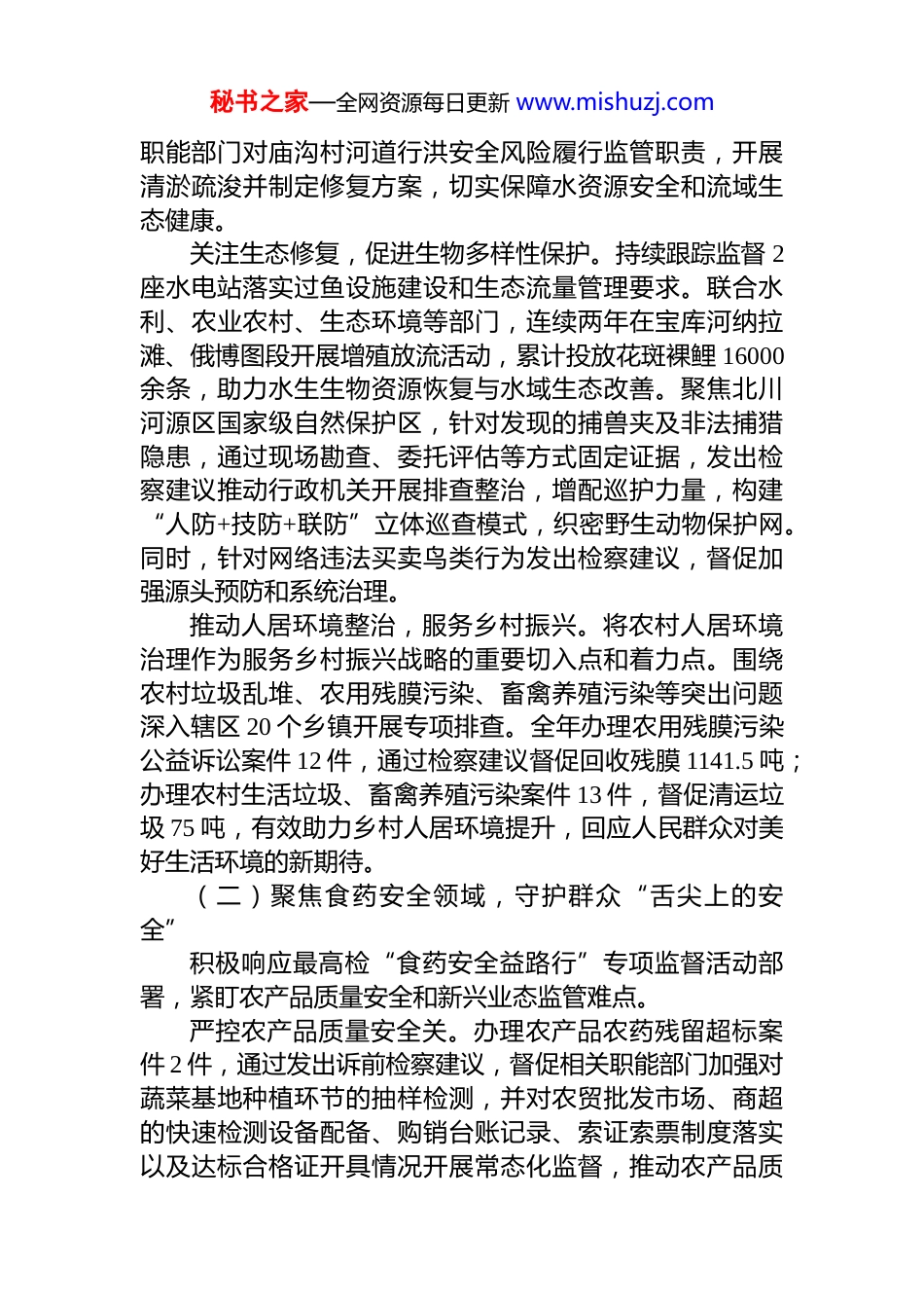 秘书之家—全网资源每日更新 www.mishuzj.comxx 县人民检察院 2025 年公益诉讼工作总结2025 年,xx 县人民检察院在上级检察机关和县委的坚强领导下,坚持以**************思想为指导,深入贯彻***法治思想和生态文明思想,紧紧围绕“维护国家利益和社会公共利益”核心职能,锚定服务全县经济社会高质量发展大局,秉持“高质效办好每一个案件”的价值追求,依法全面履行公益诉讼检察职责,各项工作取得新进展、新成效。现将全年工作总结如下:一、工作开展情况(一)聚力生态文明建设,守护绿水青山底色始终将生态环境和资源保护作为公益诉讼工作的重中之重,以系统观念和法治方式助力打造生态文明高地。创新机制,构建生态保护共同体。积极探索“检察+”融合履职路径,联合县委组织部、xx 北川河源区国家级自然保护区管理局、县林草局等单位,创新建立集“专业智慧库、生态主题*日、生态研学”于一体的“检政才”生态管护共同体试点,在察汗河设立专门办公室。联合印发试点实施方案,凝聚 11 个职能部门力量,明确 15 项具体任务,形成保护合力。制定并落实《xx 北川河源区国家级自然保护区联席会议制度》,全年联合开展生态环境巡查 20 余次,召开现场联席会 1 次,机制化协作效能初步显现。聚焦流域治理,筑牢水安全屏障。深入践行“河湖长+检察长”协作机制,围绕湟水河流域保护,紧盯河道清淤污染排查、行洪安全、饮用水安全等关键环节,开展专项巡查 3 次。针对发现的河道堵塞影响行洪、农村饮用水污染、二次供水安全隐患等问题,依法发出诉前检察建议 7 件。通过检察建议,推动属地政府对农村污水处理站排污问题进行整改,完成工艺提标升级并引入专业第三方运营;督促秘书之家—全网资源每日更新 www.mishuzj.com职能部门对庙沟村河道行洪安全风险履行监管职责,开展清淤疏浚并制定修复方案,切实保障水资源安全和流域生态健康。关注生态修复,促进生物多样性保护。持续跟踪监督 2座水电站落实过鱼设施建设和生态流量管理要求。联合水利、农业农村、生态环境等部门,连续两年在宝库河纳拉滩、俄博图段开展增殖放流活动,累计投放花斑裸鲤 16000余条,助力水生生物资源恢复与水域生态改善。聚焦北川河源区国家级自然保护区,针对发现的捕兽夹及非法捕猎隐患,通过现场勘查、委托评估等方式固定证据,发出检察建议推动行政机关开展排查整治,增配巡护力量,构建“人防+技防+联防”立体巡查模式,织密野生动物保护网。同时,针对网络违法买卖鸟类行为发出检察建议,督促加强源头预防和系统治理。推动人居环境整治,服务乡村振兴。将农村人居环境治理作为服务乡村振兴战略的重要切入点和着力点。围绕农村垃圾乱堆、农用残膜污染、畜禽养殖污染等突出问题深入辖区 20 个乡镇开展专项排查。全年办理农用残膜污染公益诉讼案件 12 件,通过检察建议督促回收残膜 1141.5 吨;办理农村生活垃圾、畜禽养殖污染案件 13 件,督促清运垃圾 75 吨,有效助力乡村人居环境提升,回应人民群众对美好生活环境的新期待。(二)聚焦食药安全领域,守护群众“舌尖上的安全”积极响应最高检“食药安全益路行”专项监督活动部署,紧盯农产品质量安全和新兴业态监管难点。严控农产品质量安全关。办理农产品农药残留超标案件 2 件,通过发出诉前检察建议,督促相关职能部门加强对蔬菜基地种植环节的抽样检测,并对农贸批发市场、商超的快速检测设备配备、购销台账记录、索证索票制度落实以及达标合格证开具情况开展常态化监督,推动农产品质秘书之家—全网资源每日更新 www.mishuzj.com量安全监管链条前移和闭环管理。规范网络餐饮新业态。针对网络餐饮外卖领域存在的资质审核不严、经营不规范等问题,依法向市场监管部门发出检察建议,推动开展专项整治行动,压实平台责任,加强入驻商户资质审核与日常动态监管,整治违规经营行为,净化网络餐饮环境,保障新兴消费模式下的食品安全。(三)围绕民生关切痛点,守护人民群众美好生活坚持以人民为中心的发展思想,将公益诉讼检察职能延伸至个人信息保护、国有财产保护、安全生产等民生领域。加强个人信息司法保护。...