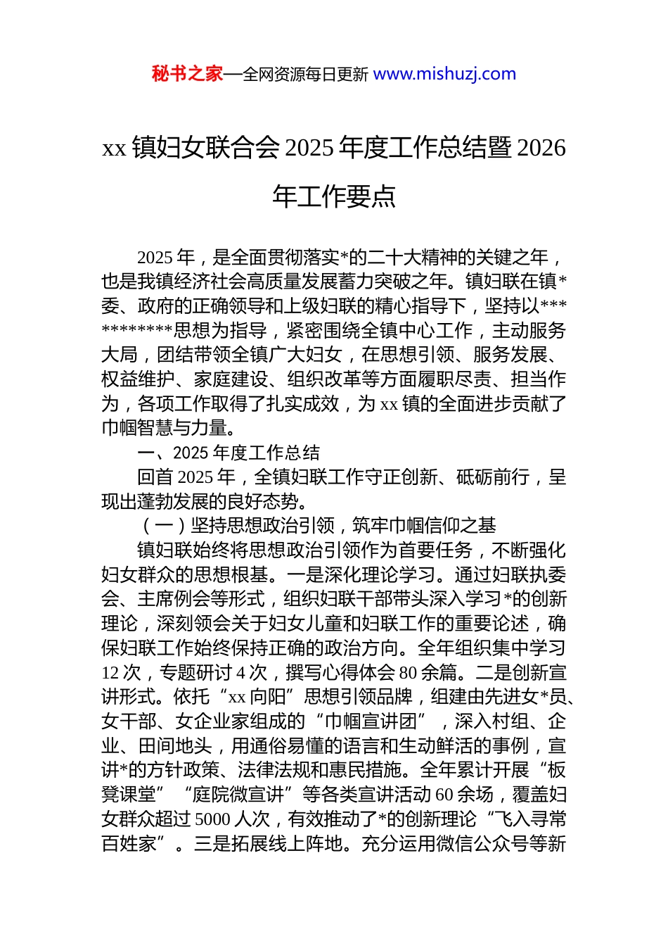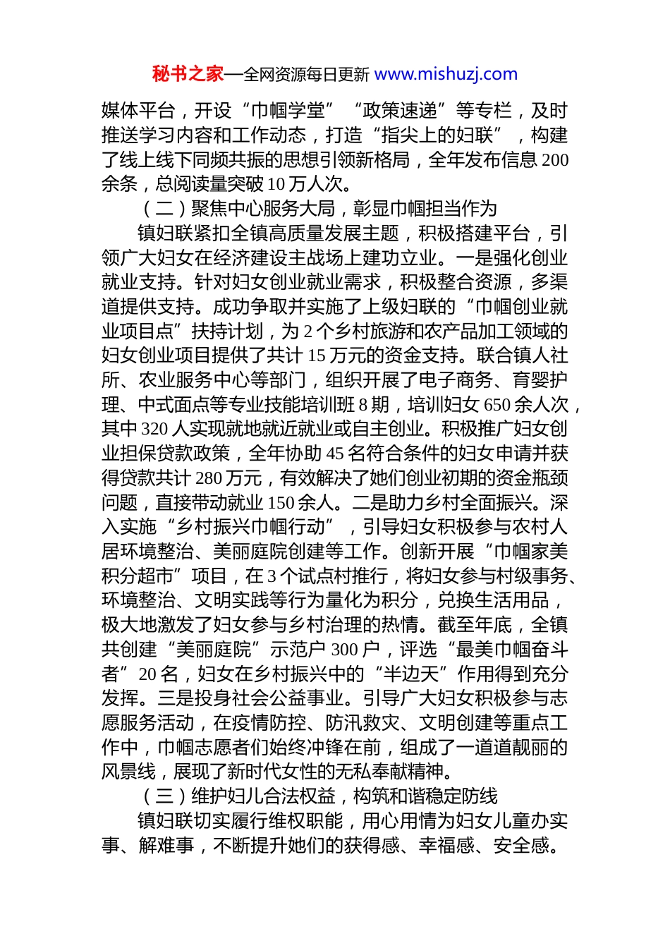 秘书之家—全网资源每日更新 www.mishuzj.comxx 镇妇女联合会 2025 年度工作总结暨 2026年工作要点2025 年,是全面贯彻落实*的二十大精神的关键之年,也是我镇经济社会高质量发展蓄力突破之年。镇妇联在镇*委、政府的正确领导和上级妇联的精心指导下,坚持以***********思想为指导,紧密围绕全镇中心工作,主动服务大局,团结带领全镇广大妇女,在思想引领、服务发展、权益维护、家庭建设、组织改革等方面履职尽责、担当作为,各项工作取得了扎实成效,为 xx 镇的全面进步贡献了巾帼智慧与力量。一、2025 年度工作总结回首 2025 年,全镇妇联工作守正创新、砥砺前行,呈现出蓬勃发展的良好态势。(一)坚持思想政治引领,筑牢巾帼信仰之基镇妇联始终将思想政治引领作为首要任务,不断强化妇女群众的思想根基。一是深化理论学习。通过妇联执委会、主席例会等形式,组织妇联干部带头深入学习*的创新理论,深刻领会关于妇女儿童和妇联工作的重要论述,确保妇联工作始终保持正确的政治方向。全年组织集中学习12 次,专题研讨 4 次,撰写心得体会 80 余篇。二是创新宣讲形式。依托“xx 向阳”思想引领品牌,组建由先进女*员、女干部、女企业家组成的“巾帼宣讲团”,深入村组、企业、田间地头,用通俗易懂的语言和生动鲜活的事例,宣讲*的方针政策、法律法规和惠民措施。全年累计开展“板凳课堂”“庭院微宣讲”等各类宣讲活动 60 余场,覆盖妇女群众超过 5000 人次,有效推动了*的创新理论“飞入寻常百姓家”。三是拓展线上阵地。充分运用微信公众号等新秘书之家—全网资源每日更新 www.mishuzj.com媒体平台,开设“巾帼学堂”“政策速递”等专栏,及时推送学习内容和工作动态,打造“指尖上的妇联”,构建了线上线下同频共振的思想引领新格局,全年发布信息 200余条,总阅读量突破 10 万人次。(二)聚焦中心服务大局,彰显巾帼担当作为镇妇联紧扣全镇高质量发展主题,积极搭建平台,引领广大妇女在经济建设主战场上建功立业。一是强化创业就业支持。针对妇女创业就业需求,积极整合资源,多渠道提供支持。成功争取并实施了上级妇联的“巾帼创业就业项目点”扶持计划,为 2 个乡村旅游和农产品加工领域的妇女创业项目提供了共计 15 万元的资金支持。联合镇人社所、农业服务中心等部门,组织开展了电子商务、育婴护理、中式面点等专业技能培训班 8 期,培训妇女 650 余人次,其中 320 人实现就地就近就业或自主创业。积极推广妇女创业担保贷款政策,全年协助 45 名符合条件的妇女申请并获得贷款共计 280 万元,有效解决了她们创业初期的资金瓶颈问题,直接带动就业 150 余人。二是助力乡村全面振兴。深入实施“乡村振兴巾帼行动”,引导妇女积极参与农村人居环境整治、美丽庭院创建等工作。创新开展“巾帼家美积分超市”项目,在 3 个试点村推行,将妇女参与村级事务、环境整治、文明实践等行为量化为积分,兑换生活用品,极大地激发了妇女参与乡村治理的热情。截至年底,全镇共创建“美丽庭院”示范户 300 户,评选“最美巾帼奋斗者”20 名,妇女在乡村振兴中的“半边天”作用得到充分发挥。三是投身社会公益事业。引导广大妇女积极参与志愿服务活动,在疫情防控、防汛救灾、文明创建等重点工作中,巾帼志愿者们始终冲锋在前,组成了一道道靓丽的风景线,展现了新时代女性的无私奉献精神。(三)维护妇儿合法权益,构筑和谐稳定防线镇妇联切实履行维权职能,用心用情为妇女儿童办实事、解难事,不断提升她们的获得感、幸福感、安全感。秘书之家—全网资源每日更新 www.mishuzj.com一是健全维权服务网络。依托镇、村两级综治中心,建立了覆盖全镇的妇女儿童维权服务站点,聘请法律顾问,开通维权热线,为妇女群众提供便捷高效的法律咨询和援助服务。全年共接待妇女群众来电来访 180 余人次,受理并成功调解婚姻家庭、邻里纠纷 78 起,调解成功率达 95%以上联合司法所开展“建设法治 xx·巾帼在行动”普法宣传活动15 场,发放《反家庭暴力法》《妇女权益保障法》等宣传资料 1 万余份。二是深化重点人群关爱。精准摸排全镇范围...