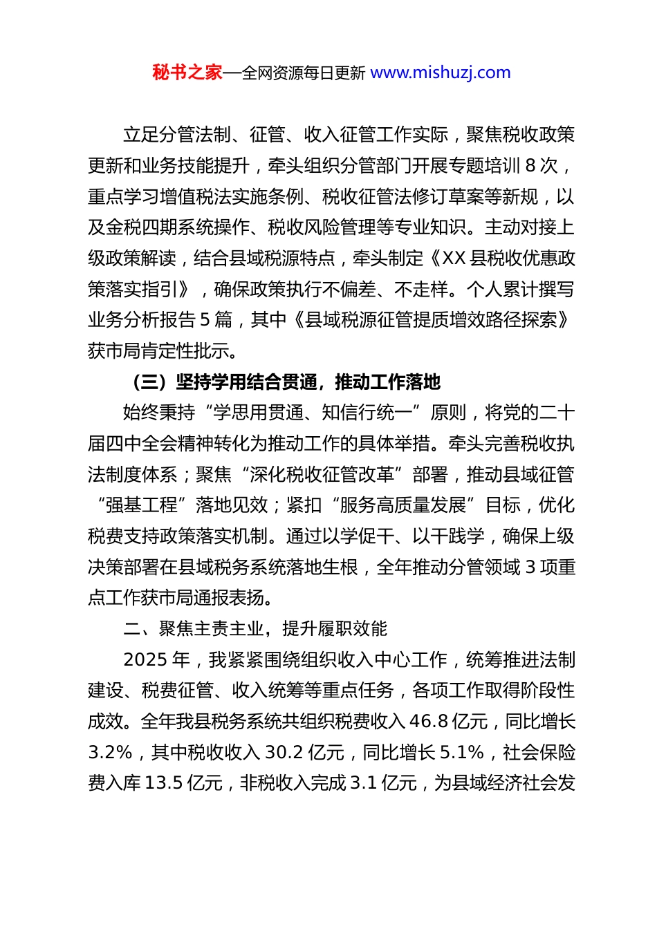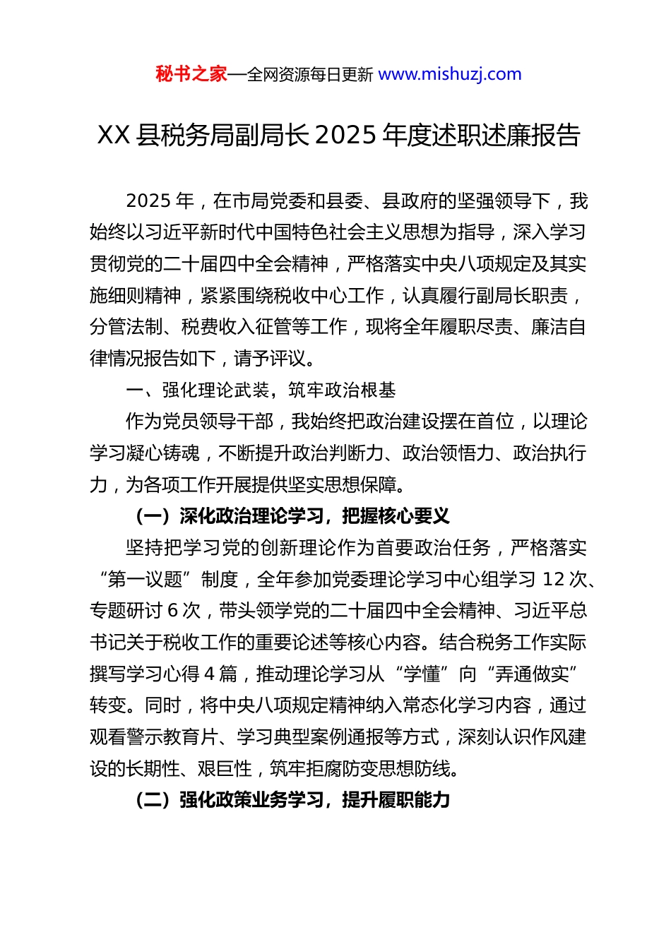 秘书之家—全网资源每日更新 www.mishuzj.comXX 县税务局副局长 2025 年度述职述廉报告2025 年,在市局党委和县委、县政府的坚强领导下,我始终以习近平新时代中国特色社会主义思想为指导,深入学习贯彻党的二十届四中全会精神,严格落实中央八项规定及其实施细则精神,紧紧围绕税收中心工作,认真履行副局长职责,分管法制、税费收入征管等工作,现将全年履职尽责、廉洁自律情况报告如下,请予评议。一、强化理论武装,筑牢政治根基作为党员领导干部,我始终把政治建设摆在首位,以理论学习凝心铸魂,不断提升政治判断力、政治领悟力、政治执行力,为各项工作开展提供坚实思想保障。(一)深化政治理论学习,把握核心要义坚持把学习党的创新理论作为首要政治任务,严格落实“第一议题”制度,全年参加党委理论学习中心组学习 12 次、专题研讨 6 次,带头领学党的二十届四中全会精神、习近平总书记关于税收工作的重要论述等核心内容。结合税务工作实际撰写学习心得 4 篇,推动理论学习从“学懂”向“弄通做实”转变。同时,将中央八项规定精神纳入常态化学习内容,通过观看警示教育片、学习典型案例通报等方式,深刻认识作风建设的长期性、艰巨性,筑牢拒腐防变思想防线。(二)强化政策业务学习,提升履职能力秘书之家—全网资源每日更新 www.mishuzj.com立足分管法制、征管、收入征管工作实际,聚焦税收政策更新和业务技能提升,牵头组织分管部门开展专题培训 8 次,重点学习增值税法实施条例、税收征管法修订草案等新规,以及金税四期系统操作、税收风险管理等专业知识。主动对接上级政策解读,结合县域税源特点,牵头制定《XX 县税收优惠政策落实指引》,确保政策执行不偏差、不走样。个人累计撰写业务分析报告 5 篇,其中《县域税源征管提质增效路径探索》获市局肯定性批示。(三)坚持学用结合贯通,推动工作落地始终秉持“学思用贯通、知信行统一”原则,将党的二十届四中全会精神转化为推动工作的具体举措。牵头完善税收执法制度体系;聚焦“深化税收征管改革”部署,推动县域征管“强基工程”落地见效;紧扣“服务高质量发展”目标,优化税费支持政策落实机制。通过以学促干、以干践学,确保上级决策部署在县域税务系统落地生根,全年推动分管领域 3 项重点工作获市局通报表扬。二、聚焦主责主业,提升履职效能2025 年,我紧紧围绕组织收入中心工作,统筹推进法制建设、税费征管、收入统筹等重点任务,各项工作取得阶段性成效。全年我县税务系统共组织税费收入 46.8 亿元,同比增长3.2%,其中税收收入 30.2 亿元,同比增长 5.1%,社会保险费入库 13.5 亿元,非税收入完成 3.1 亿元,为县域经济社会发秘书之家—全网资源每日更新 www.mishuzj.com展提供了坚实财力保障。(一)深耕法制建设,筑牢法治税务根基一是完善执法制度体系。牵头修订《税务行政处罚裁量基准》,细化 12 类 46 项执法标准,实现处罚尺度统一;严格落实行政执法“三项制度”,全年公示执法信息 6200 余条,开展重大执法决定法制审核 12 件,上传执法音像记录 360 余条,执法准确率达 100%。二是强化执法监督制约。建立“日常巡查+专项检查+重点督查”三位一体监督机制,全年开展执法质量检查 4 次,整改问题 32 个,追责问责 4 人次;聘请 2 名法律顾问,参与行政复议、涉税争议调解等工作,全年办理行政复议案件 3 件、行政诉讼案件 1 件,均实现案结事了。三是深化普法宣传教育。组织开展“税收宣传月”“春雨润苗”等活动 16 场,走访企业 2300 余户,发放宣传资料 5000 余份;打造“纳税人学堂”线上线下平台,开展政策培训 32 期,覆盖纳税人缴费人 1.2 万人次,纳税人税法遵从度同比提升 4.3个百分点。(二)狠抓收入征管,提升收入质效水平坚决贯彻“依法依规组织收入”原则,统筹推进税源管理税费征收等工作,确保收入平稳增长。一是强化税源精准管控。建立重点税源“一户一档”管理机制,将全县 86 户年纳税额50 万元以上企业纳入重点监控,全年重点税源贡献税收 18.7亿元,占税收总收入的 61.9%;深化税收大数据应用...