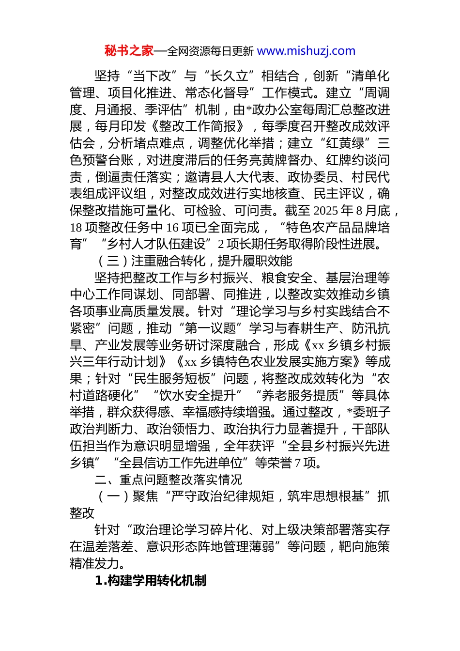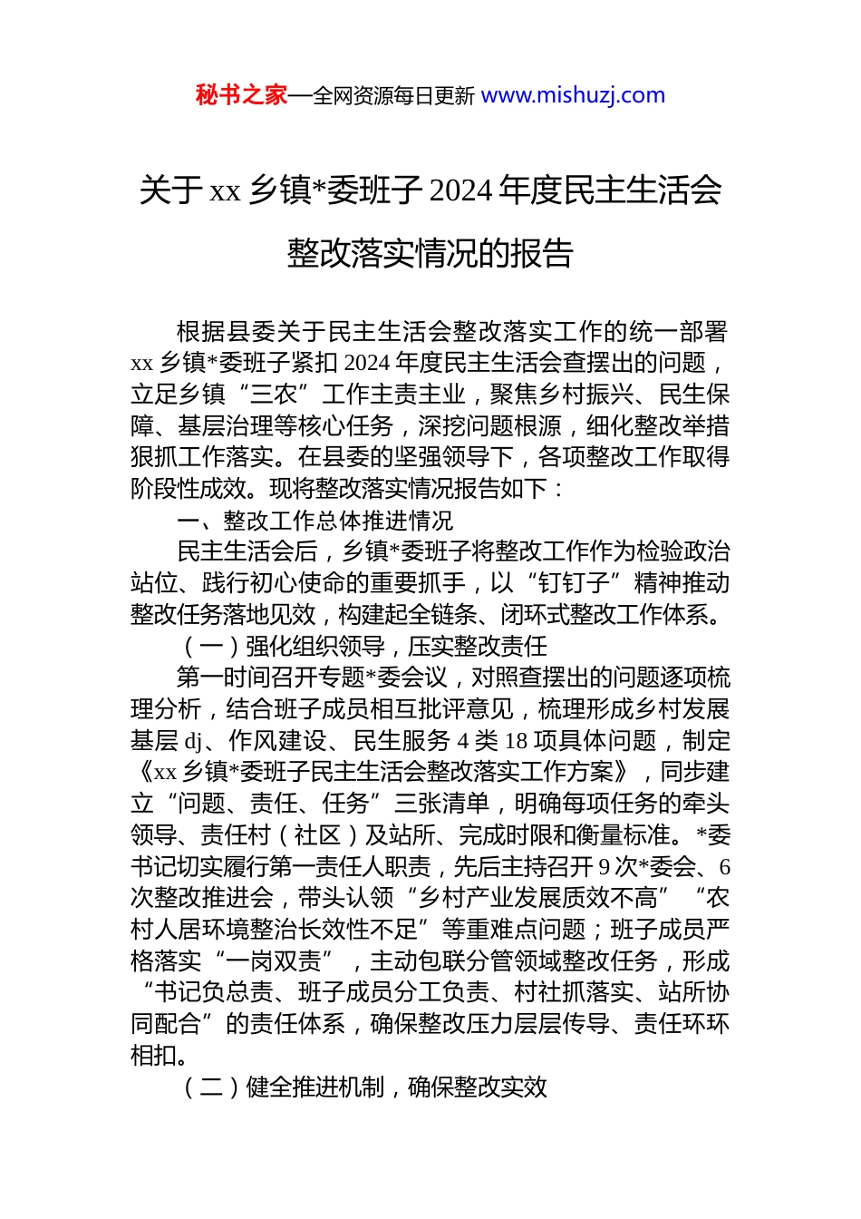 秘书之家—全网资源每日更新 www.mishuzj.com关于 xx 乡镇*委班子 2024 年度民主生活会整改落实情况的报告根据县委关于民主生活会整改落实工作的统一部署xx 乡镇*委班子紧扣 2024 年度民主生活会查摆出的问题,立足乡镇“三农”工作主责主业,聚焦乡村振兴、民生保障、基层治理等核心任务,深挖问题根源,细化整改举措狠抓工作落实。在县委的坚强领导下,各项整改工作取得阶段性成效。现将整改落实情况报告如下:一、整改工作总体推进情况民主生活会后,乡镇*委班子将整改工作作为检验政治站位、践行初心使命的重要抓手,以“钉钉子”精神推动整改任务落地见效,构建起全链条、闭环式整改工作体系。(一)强化组织领导,压实整改责任第一时间召开专题*委会议,对照查摆出的问题逐项梳理分析,结合班子成员相互批评意见,梳理形成乡村发展基层 dj、作风建设、民生服务 4 类 18 项具体问题,制定《xx 乡镇*委班子民主生活会整改落实工作方案》,同步建立“问题、责任、任务”三张清单,明确每项任务的牵头领导、责任村(社区)及站所、完成时限和衡量标准。*委书记切实履行第一责任人职责,先后主持召开 9 次*委会、6次整改推进会,带头认领“乡村产业发展质效不高”“农村人居环境整治长效性不足”等重难点问题;班子成员严格落实“一岗双责”,主动包联分管领域整改任务,形成“书记负总责、班子成员分工负责、村社抓落实、站所协同配合”的责任体系,确保整改压力层层传导、责任环环相扣。(二)健全推进机制,确保整改实效秘书之家—全网资源每日更新 www.mishuzj.com坚持“当下改”与“长久立”相结合,创新“清单化管理、项目化推进、常态化督导”工作模式。建立“周调度、月通报、季评估”机制,由*政办公室每周汇总整改进展,每月印发《整改工作简报》,每季度召开整改成效评估会,分析堵点难点,调整优化举措;建立“红黄绿”三色预警台账,对进度滞后的任务亮黄牌督办、红牌约谈问责,倒逼责任落实;邀请县人大代表、政协委员、村民代表组成评议组,对整改成效进行实地核查、民主评议,确保整改措施可量化、可检验、可问责。截至 2025 年 8 月底,18 项整改任务中 16 项已全面完成,“特色农产品品牌培育”“乡村人才队伍建设”2 项长期任务取得阶段性进展。(三)注重融合转化,提升履职效能坚持把整改工作与乡村振兴、粮食安全、基层治理等中心工作同谋划、同部署、同推进,以整改实效推动乡镇各项事业高质量发展。针对“理论学习与乡村实践结合不紧密”问题,推动“第一议题”学习与春耕生产、防汛抗旱、产业发展等业务研讨深度融合,形成《xx 乡镇乡村振兴三年行动计划》《xx 乡镇特色农业发展实施方案》等成果;针对“民生服务短板”问题,将整改成效转化为“农村道路硬化”“饮水安全提升”“养老服务提质”等具体举措,群众获得感、幸福感持续增强。通过整改,*委班子政治判断力、政治领悟力、政治执行力显著提升,干部队伍担当作为意识明显增强,全年获评“全县乡村振兴先进乡镇”“全县信访工作先进单位”等荣誉 7 项。二、重点问题整改落实情况(一)聚焦“严守政治纪律规矩,筑牢思想根基”抓整改针对“政治理论学习碎片化、对上级决策部署落实存在温差落差、意识形态阵地管理薄弱”等问题,靶向施策精准发力。1.构建学用转化机制秘书之家—全网资源每日更新 www.mishuzj.com创新“理论学习+田间实践”双学模式,把******关于“三农”工作的重要论述列为*委理论学习中心组、村(社区)*支部“三会一课”的首学内容,结合春耕备耕、秋收秋种、产业发展等重点任务开展靶向研学。围绕粮食安全专题,班子成员带队深入田间地头,调研耕地撂荒、农机推广等问题,形成《xx 乡镇耕地保护与粮食增产对策建议》;围绕乡村产业发展专题,组织村干部、种植大户赴先进乡镇考察学习,引进优质品种和先进技术,制定《xx乡镇特色种植产业扶持办法》。全年开展专题研学 8 次,出台促进乡村发展政策举措 22 条,其中“特色果蔬种植扶持8 条”带动新增种植面积 1200 亩,惠及农户 320 户。2.严守政治纪律规矩修订《xx 乡镇*委议事决策规...