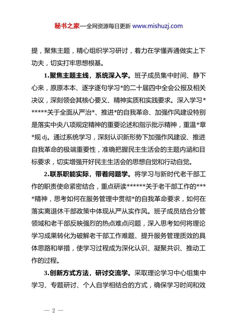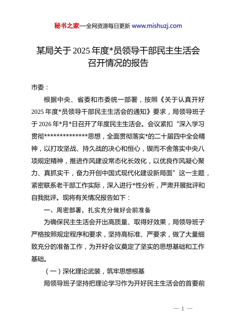 秘书之家—全网资源每日更新 www.mishuzj.com某局关于 2025 年度*员领导干部民主生活会召开情况的报告市委:根据中央、省委和市委统一部署,按照《关于认真开好2025 年度*员领导干部民主生活会的通知》要求,局领导班子于 2026 年*月*日召开了年度民主生活会。会议紧扣“深入学习贯彻**************思想,全面贯彻落实*的二十届四中全会精神,以打攻坚战、持久战的决心和恒心,锲而不舍落实中央八项规定精神,推进作风建设常态化长效化,以优良作风凝心聚力、真抓实干,奋力开创中国式现代化建设新局面”这一主题,紧密联系老干部工作实际,深入进行*性分析,严肃开展批评和自我批评。现将有关情况报告如下:一、周密部署,扎实充分做好会前准备为确保民主生活会开出高质量、取得好效果,局领导班子严格按照规定程序和要求,坚持高标准、严要求,做了大量细致充分的准备工作,为开好会议奠定了坚实的思想基础和工作基础。(一)深化理论武装,筑牢思想根基局领导班子坚持把理论学习作为开好民主生活会的首要前— 1 —秘书之家—全网资源每日更新 www.mishuzj.com提,聚焦主题,精心组织学习研讨,着力在学懂弄通做实上下功夫,切实打牢思想根基。1.聚焦主题主线,系统深入学。班子成员集中时间、静下心来,原原本本、逐字逐句学习*的二十届四中全会公报及相关决议,深刻领会其核心要义、精神实质和实践要求。深入学习******关于全面从严治*、推进*的自我革命、加强作风建设特别是落实中央八项规定精神的重要论述和指示批示精神,重温*章*规 dj。通过系统学习,深刻认识新形势下加强作风建设、推进自我革命的极端重要性,准确把握民主生活会的主题内涵和目标要求,切实增强开好民主生活会的思想自觉和行动自觉。2.联系职能实际,带着问题学。将学习与新时代老干部工作的职责使命紧密结合,重点研读******关于老干部工作的****精神,思考如何在服务管理中贯彻*的自我革命要求,如何在落实离退休干部政策中体现从严从实作风。班子成员结合分管领域和老干部反映强烈的热点难点问题,深入思考如何将理论学习成果转化为破解老干部工作难题、提升服务管理质效的具体思路和举措,使学习过程成为深化认识、凝聚共识、推动工作的过程。3.创新方式方法,研讨交流学。采取理论学习中心组集中学习、专题研讨、个人自学相结合的方式,确保学习时间和效— 2 —秘书之家—全网资源每日更新 www.mishuzj.com果。组织开展了*次专题研讨,班子成员围绕“以自我革命精神锤炼过硬作风,推动老干部工作高质量发展”等议题,深入交流学习体会。大家一致认为,必须将巩固拓展 dj 学习教育成果与落实中央八项规定精神紧密结合起来,以“五个进一步到位”的要求检视自身,不断提高政治判断力、政治领悟力、政治执行力,为开好民主生活会夯实了坚实的思想理论基础。(二)广泛征求意见,找准查实问题坚持开门纳谏,采取多种形式,广泛听取各方面意见建议力求把问题找准、找实、找具体。1.畅通渠道,全面覆盖听意见。通过发放征求意见函、设置意见箱、召开座谈会、个别访谈、网络平台留言等多种方式,广泛征求市直各单位老干部工作部门、局机关及所属单位*员干部、离退休干部*支部、老干部协会(团体)以及服务对象代表的意见建议。特别是注重深入基层、深入老同志,面对面听取不同层级、不同领域、不同年龄段老同志的心声和诉求,确保征求意见的广泛性和代表性。2.聚焦重点,精准靶向查问题。征求意见内容紧密围绕民主生活会主题,聚焦“五个进一步到位”的要求,重点听取对局领导班子和班子成员在学习贯彻*的创新理论、贯彻执行中央八项规定精神及其实施细则、履职尽责担当作为、服务保障离— 3 —秘书之家—全网资源每日更新 www.mishuzj.com退休干部、加强自身建设等方面存在的突出问题,以及老干部工作中存在的短板弱项。对收集到的意见建议进行原汁原味梳理,共整理出涉及领导班子意见建议*条,涉及班子成员个人意见建议*条。3.梳理归纳,原汁原味做反馈。对征求到的意见建议,安排专人进行汇总、分类、梳理,形成详细的意见建议清单。按照程序,将涉及领导班子的意见建议在班子内部进...