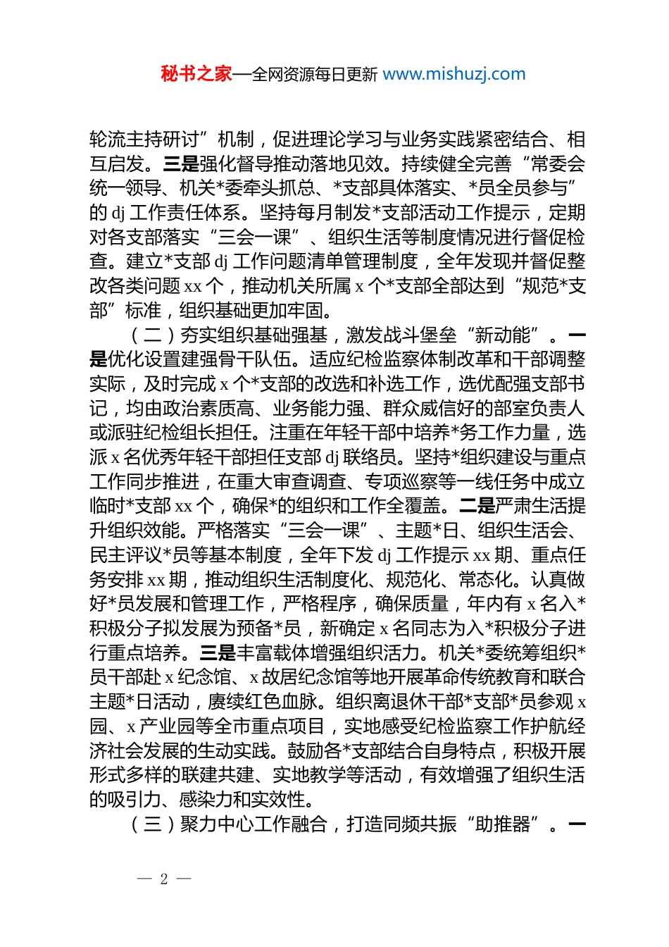 秘书之家—全网资源每日更新 www.mishuzj.com市纪委监委机关*委书记 2025 年抓 dj 工作述职报告根据年度考核工作安排,现将本人 2025 年度履行抓机关 dj工作第一责任人职责情况报告如下:一、主要做法与工作成效2025 年,在市纪委常委会的坚强领导下,机关*委坚持以*的创新理论为指导,深入贯彻落实上级关于全面从严治*、加强机关*的建设各项决策部署,紧紧围绕纪检监察工作高质量发展主题,以政治建设为统领,持续夯实组织基础,着力推动 dj 与业务深度融合,为锻造忠诚干净担当的纪检监察铁军、服务保障全市发展大局提供了坚强政治和组织保证。(一)聚焦政治建设铸魂,把稳对*忠诚“方向盘”。一是压紧压实主体责任链条。始终坚持把*的政治建设摆在首位,推动市纪委常委会切实担负起机关 dj 领导责任,全年专题听取机关 dj 工作情况汇报 x 次,审议通过年度 dj 工作要点等重要文件。严格执行 dj 工作责任制,督促委领导班子成员认真履行“一岗双责”,带头落实双重组织生活制度,深入基层联系点调研指导、解决实际问题 xx 次。认真履行意识形态工作责任制,定期分析研判机关意识形态领域状况,规范稳妥处置涉纪涉腐网络舆情,牢牢掌握工作主动权。二是深学细悟筑牢思想根基。将理论学习作为加强政治建设的首要任务,全年组织理论学习中心组学习 xx 次、常委会学习 xx 次、专题研讨 xx 次,持续在学懂弄通做实*的创新理论上下功夫。建立并推行班子成员及各*支部书记分层分类讲*课机制,全年讲授*课 xx 余次,其中委主要负责同志为全市纪检监察干部讲授专题*课 x 次,机关报送的*课讲稿分获市直机关优秀*课稿一、二等奖。创新推行“室组— 1 —秘书之家—全网资源每日更新 www.mishuzj.com轮流主持研讨”机制,促进理论学习与业务实践紧密结合、相互启发。三是强化督导推动落地见效。持续健全完善“常委会统一领导、机关*委牵头抓总、*支部具体落实、*员全员参与”的 dj 工作责任体系。坚持每月制发*支部活动工作提示,定期对各支部落实“三会一课”、组织生活等制度情况进行督促检查。建立*支部 dj 工作问题清单管理制度,全年发现并督促整改各类问题 xx 个,推动机关所属 x 个*支部全部达到“规范*支部”标准,组织基础更加牢固。(二)夯实组织基础强基,激发战斗堡垒“新动能”。一是优化设置建强骨干队伍。适应纪检监察体制改革和干部调整实际,及时完成 x 个*支部的改选和补选工作,选优配强支部书记,均由政治素质高、业务能力强、群众威信好的部室负责人或派驻纪检组长担任。注重在年轻干部中培养*务工作力量,选派 x 名优秀年轻干部担任支部 dj 联络员。坚持*组织建设与重点工作同步推进,在重大审查调查、专项巡察等一线任务中成立临时*支部 xx 个,确保*的组织和工作全覆盖。二是严肃生活提升组织效能。严格落实“三会一课”、主题*日、组织生活会、民主评议*员等基本制度,全年下发 dj 工作提示 xx 期、重点任务安排 xx 期,推动组织生活制度化、规范化、常态化。认真做好*员发展和管理工作,严格程序,确保质量,年内有 x 名入*积极分子拟发展为预备*员,新确定 x 名同志为入*积极分子进行重点培养。三是丰富载体增强组织活力。机关*委统筹组织*员干部赴 x 纪念馆、x 故居纪念馆等地开展革命传统教育和联合主题*日活动,赓续红色血脉。组织离退休干部*支部*员参观 x园、x 产业园等全市重点项目,实地感受纪检监察工作护航经济社会发展的生动实践。鼓励各*支部结合自身特点,积极开展形式多样的联建共建、实地教学等活动,有效增强了组织生活的吸引力、感染力和实效性。(三)聚力中心工作融合,打造同频共振“助推器”。一— 2 —秘书之家—全网资源每日更新 www.mishuzj.com是 dj 引领监督执纪提质增效。以创建“忠诚卫士、清风护航”机关 dj 总品牌为引领,指导各支部结合职能打造特色子品牌,推动 dj 工作与业务工作目标同向、部署同步。紧紧围绕中央重大决策部署及省、市委中心工作,如 x 国际机场建设、区域发展战略实施、优化营商环境等,牵头或参与开展专项监督检查xx 次,...